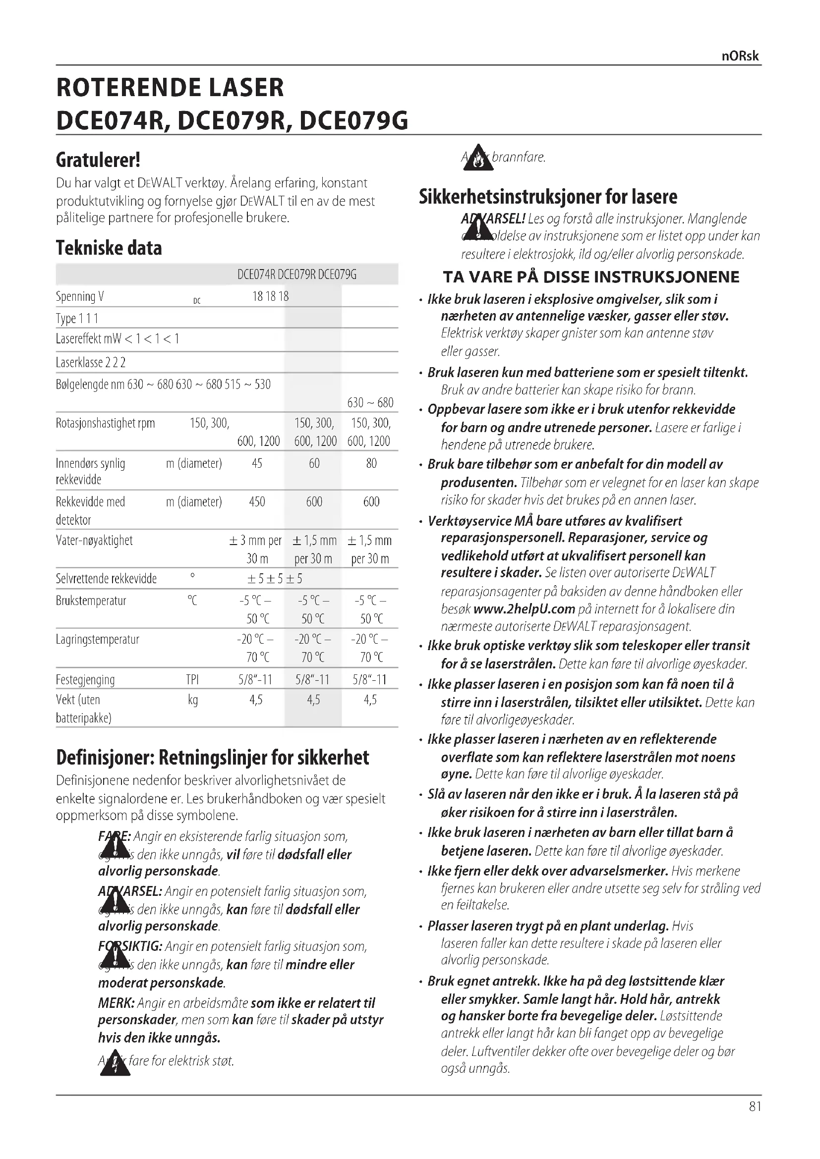 Type 1 1 1 Lasereffekt mW < 1 < 1 < 1 Laserklasse 2 2 2 Bølgelengde nm 630 ~ 680 630 ~ 680 515 ~ 530 630 ~ 680 Rotasjonshastighet rpm 150, 300, 600, 1200 150, 300, 600, 1200 150, 300, 600, 1200 Innendørs synlig rekkevidde m (diameter) 45 60 80 Rekkevidde med detektor m (diameter) 450 600 600 Vater-nøyaktighet ± 3 mm per 30 m ± 1,5 mm per 30 m ± 1,5 mm per 30 m Selvrettende rekkevidde ° ± 5 ± 5 ± 5 Brukstemperatur °C -5 °C – 50 °C -5 °C – 50 °C -5 °C – 50 °C Lagringstemperatur -20 °C – 70 °C -20 °C – 70 °C -20 °C – 70 °C Festegjenging TPI 5/8“-11 5/8“-11 5/8“-11 Vekt (uten batteripakke) kg 4,5 4,5 4,5 Definisjoner: Retningslinjer for sikkerhet Definisjonene nedenfor beskriver alvorlighetsnivået de enkelte signalordene er. Les brukerhåndboken og vær spesielt oppmerksom på dissesymbolene.