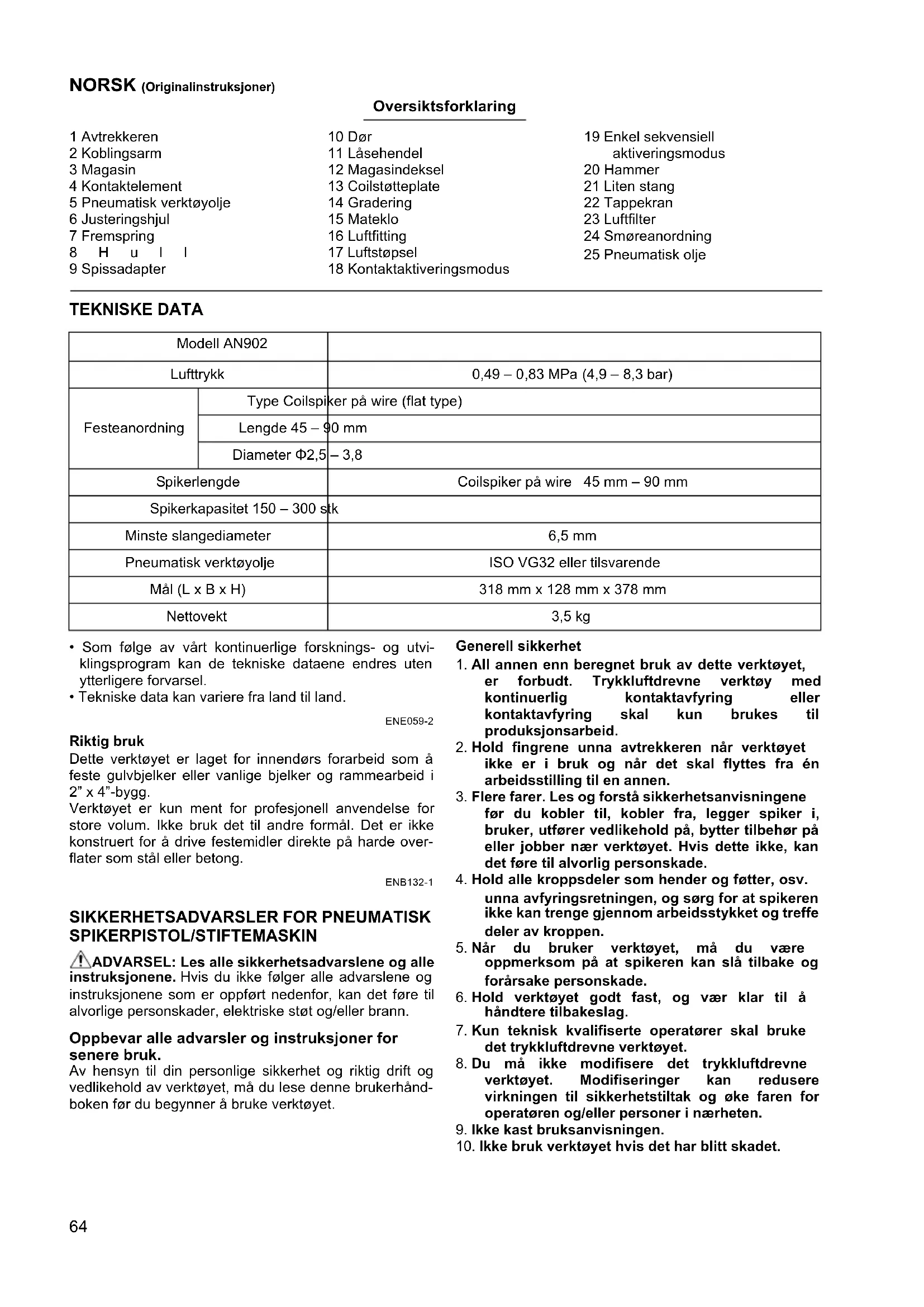 - Tekniske data kan variere fra land til land. ENE059-2 Riktig bruk Dette verktøyet er laget for innendørs forarbeid som å feste gulvbjelker eller vanlige bjelker og rammearbeid i 2” x 4”-bygg. Verktøyet er kun ment for profesjonell anvendelse for store volum. Ikke bruk det til andre formål. Det er ikke konstruert for å drive festemidler direkte på harde over- flater som stål eller betong. ENB132-1