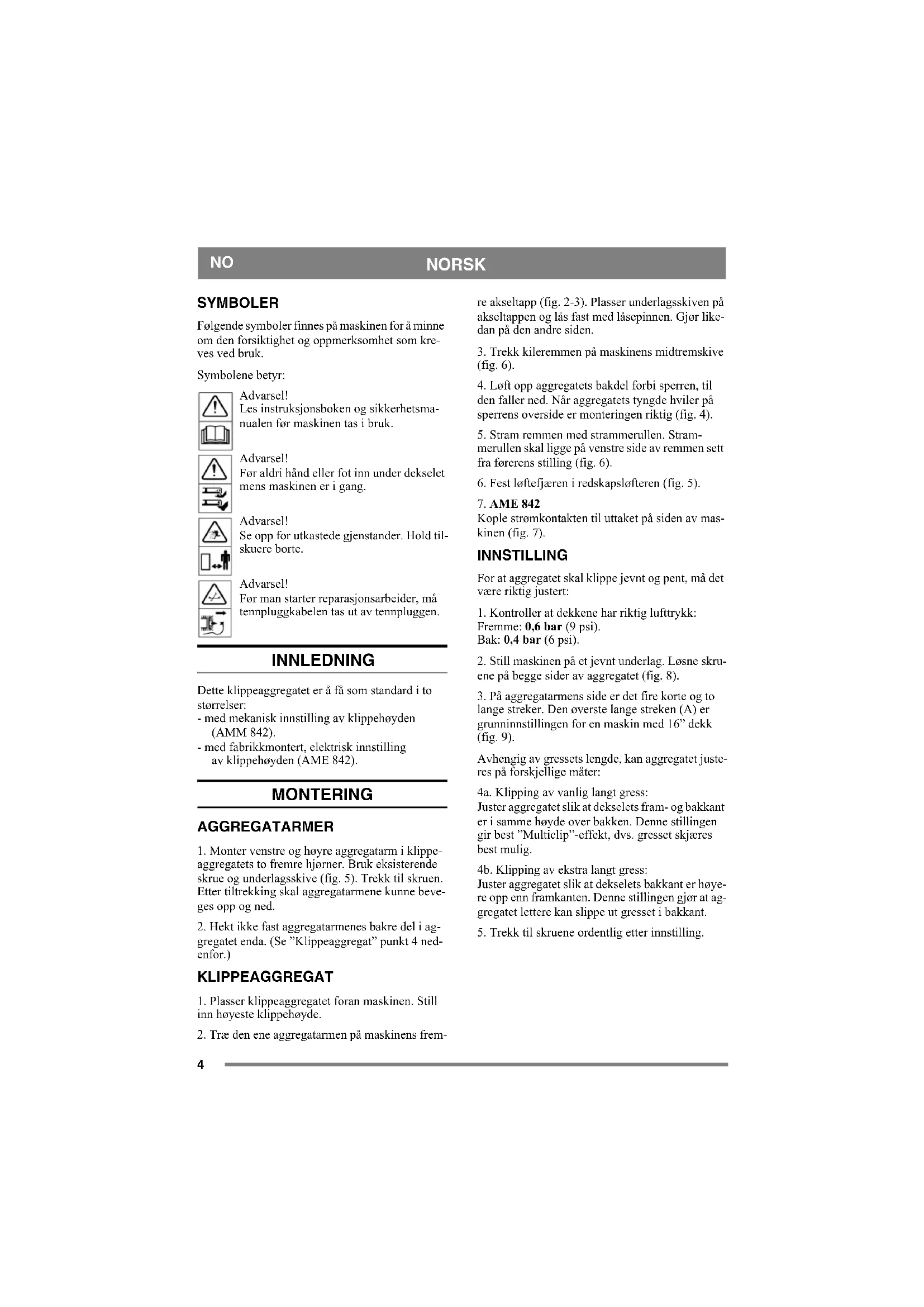 SYMBOLER Følgende symboler finnes på maskinen for å minne om den forsiktighet og oppmerksomhet som kre- ves ved bruk. Symbolene betyr: Advarsel! Les instruksjonsboken og sikkerhetsma- nualen før maskinen tas i bruk. Advarsel! Før aldri hånd eller fot inn under dekselet mens maskinen er i gang. Advarsel! Se opp for utkastede gjenstander. Hold til- skuere borte. Advarsel! Før man starter reparasjonsarbeider, må tennpluggkabelen tas ut av tennpluggen. INNLEDNING Dette klippeaggregatet er å få som standard i to størrelser: - med mekanisk innstilling av klippehøyden (AMM 842). - med fabrikkmontert, elektrisk innstilling av klippehøyden (AME 842). MONTERING AGGREGATARMER