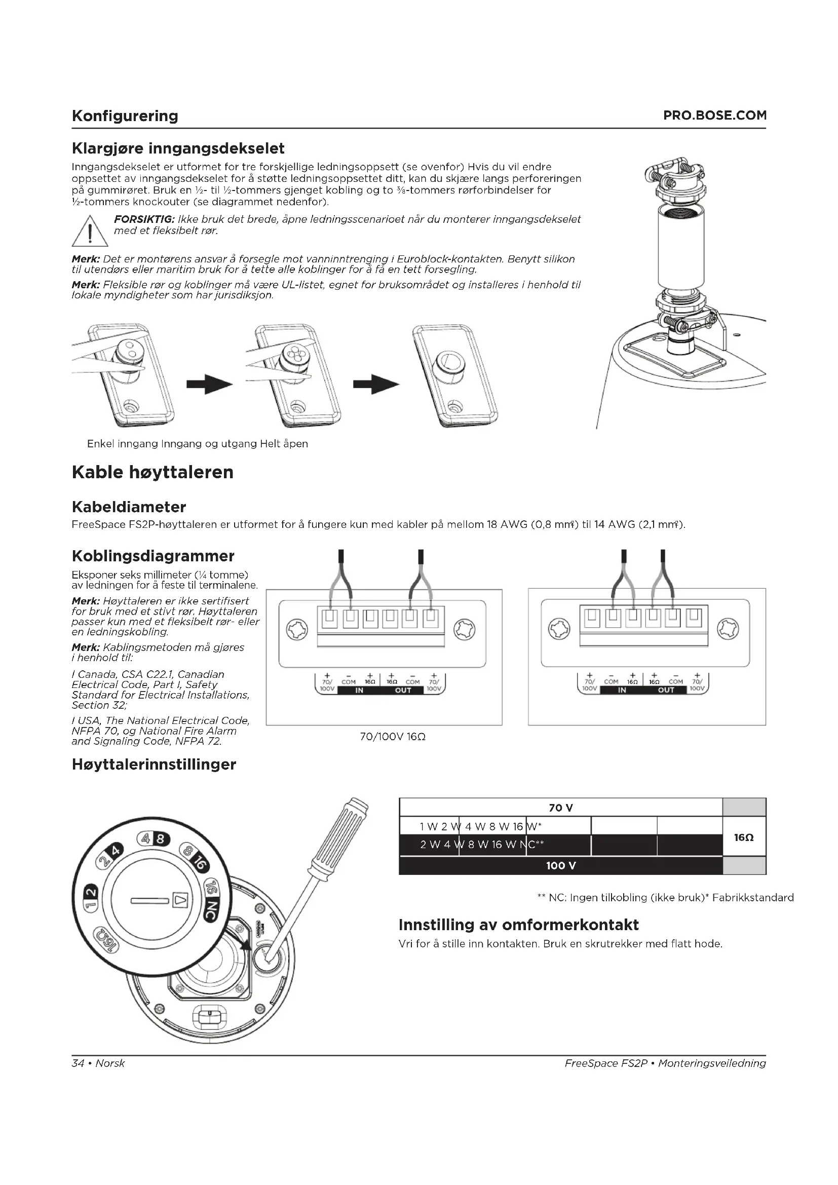 I USA, The National Electrical Code, NFPA 70, og National Fire Alarm andSignaling Code, NFPA 72. 70/100V 16Ω Klargjøre inngangsdekselet Inngangsdekselet er utformet for tre forskjellige ledningsoppsett (se ovenfor) Hvis du vil endre oppsettet av inngangsdekselet for åstøtte ledningsoppsettet ditt, kan du skjære langs perforeringen på gummirøret. Bruk en ½- til ½-tommers gjenget kobling og to ⅜-tommers rørforbindelser for ½-tommers knockouter (se diagrammet nedenfor). FORSIKTIG: Ikke bruk det brede, åpne ledningsscenarioet når du monterer inngangsdekselet med et fleksibelt rør. Merk: Det er montørens ansvar å forsegle mot vanninntrenging i Euroblock-kontakten. Benytt silikon til utendørs eller maritim bruk for å tette alle koblinger for å få en tett forsegling. Merk: Fleksible rør og koblinger må være UL-listet, egnet for bruksområdet og installeres i henhold til lokale myndigheter som har jurisdiksjon. Enkel inngang Inngang og utgang Helt åpen 16Ω 16Ω 16Ω 16Ω Høyttalerinnstillinger 70V 1W 2W 4W 8W 16W* 16Ώ 2W 4W 8W 16W NC** 100V ** NC: Ingen tilkobling (ikke bruk)* Fabrikkstandard Innstilling av omformerkontakt Vri for å stille inn kontakten. Bruk en skrutrekker med flatt hode.Norsk • 35Monteringsveiledning • FreeSpace FS2P