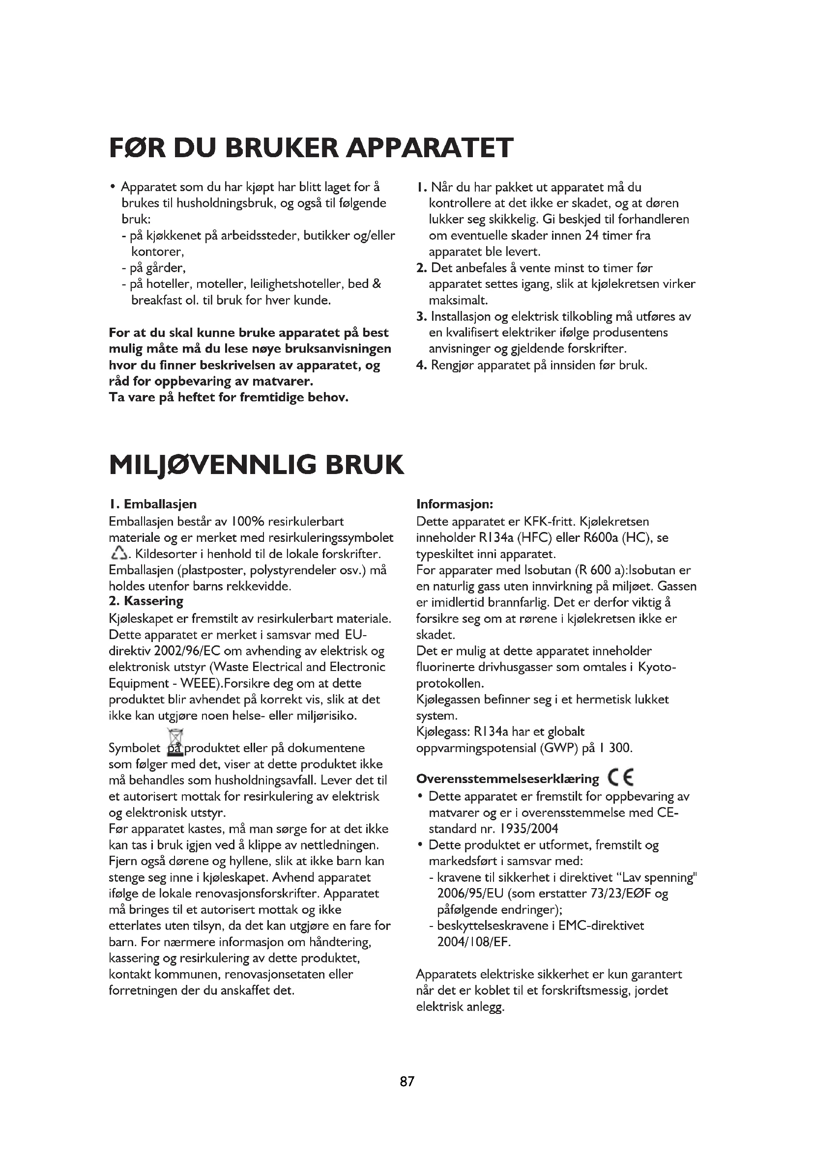 Kjøleskapet er fremstilt av resirkulerbart materiale. Dette apparatet er merket i samsvar med EU- direktiv 2002/96/EC om avhending av elektrisk og elektronisk utstyr (Waste Electrical and Electronic Equipment - WEEE).Forsikre deg om at dette produktet blir avhendet på korrekt vis, slik at det ikke kan utgjøre noen helse- eller miljørisiko. Symbolet på produktet eller på dokumentene som følger med det, viser at dette produktet ikke må behandles som husholdningsavfall. Lever det til et autorisert mottak for resirkulering av elektrisk og elektronisk utstyr. Før apparatet kastes, må man sørge for at det ikke kan tas i bruk igjen ved å klippe av nettledningen. Fjern også dørene og hyllene, slik at ikke barn kan stenge seg inne i kjøleskapet. Avhend apparatet ifølge de lokale renovasjonsforskrifter. Apparatet må bringes til et autorisert mottak og ikke etterlates uten tilsyn, da det kan utgjøre en fare for barn. For nærmere informasjon om håndtering, kassering og resirkulering av dette produktet, kontakt kommunen, renovasjonsetaten eller forretningen der du anskaffet det. Informasjon: Dette apparatet er KFK-fritt. Kjølekretsen inneholder R134a (HFC) eller R600a (HC), se typeskiltet inni apparatet. For apparater med Isobutan (R 600 a):Isobutan er en naturlig gass uten innvirkning på miljøet. Gassen er imidlertid brannfarlig. Det er derfor viktig å forsikre seg om at rørene i kjølekretsen ikke er skadet. Det er mulig at dette apparatet inneholder fluorinerte drivhusgasser som omtales i Kyoto- protokollen. Kjølegassen befinner seg i et hermetisk lukket system. Kjølegass: R134a har et globalt oppvarmingspotensial (GWP) på 1 300. Overensstemmelseserklæring