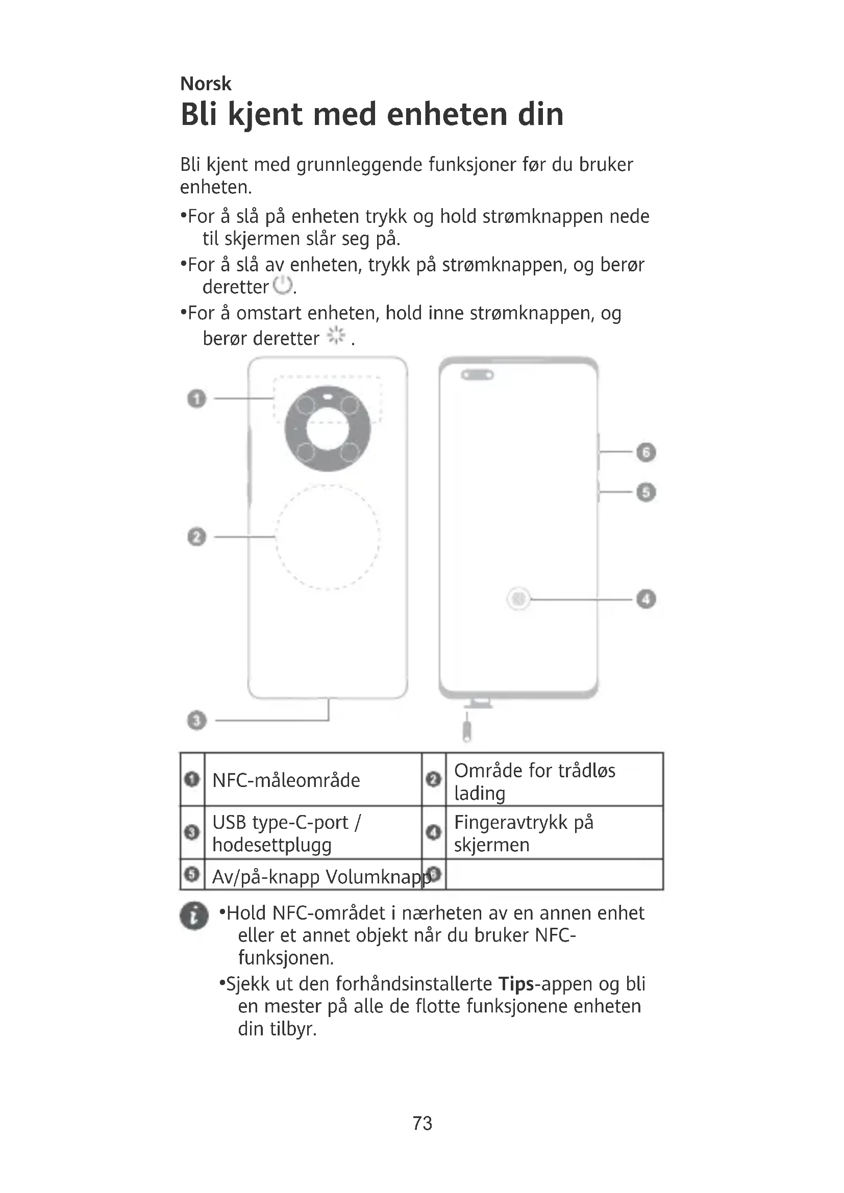 - Sjekk ut den forhåndsinstallerte Tips-appen og bli en mester på alle de otte funksjonene enheten din tilbyr. 73Komme i gang