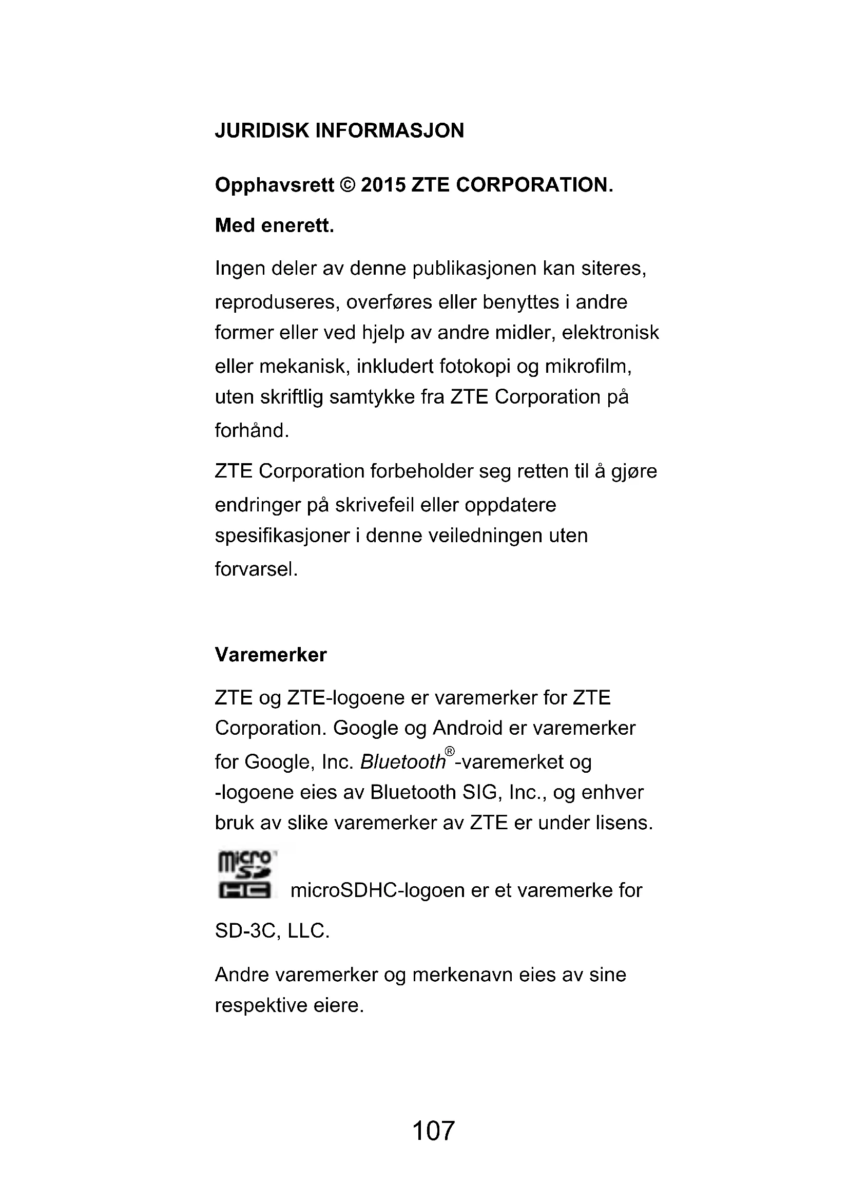 -varemerket og -logoene eies av Bluetooth SIG, Inc., og enhver bruk av slike varemerker av ZTE er under lisens. microSDHC-logoen er et varemerke for SD-3C, LLC. Andre varemerker og merkenavn eies av sine respektive eiere. 107Vi tilbyr selvbetjening for brukere av vår smartterminalenhet. Gå til ZTEs offisielle nettsted (på www.ztedevice.com) hvis du vil ha mer informasjon om selvbetjening og støttede produktmodeller. Informasjonen på nettstedet har forrang. Gå til http://www.ztedevice.com for å laste ned brukerhåndboken. Bare klikk på Service Support > User's manual (Servicestøtte > Brukerhåndbok) fra hjemmesiden, og velg deretter land, produkttype og navn for å søke etter relatert støtteinformasjon Ansvarsfraskrivelse ZTE Corporation frasier seg ethvert ansvar for feil og skade forårsaket av uautoriserte endringer i programvaren.