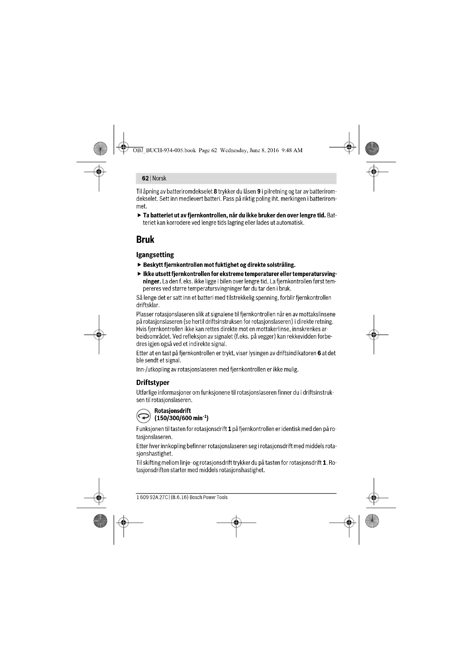 Serienummeret 10 på typeskiltet er til en entydig identifisering av fjernkontrollen. OBJ_BUCH-934-005.book Page 61 Wednesday, June 8, 2016 9:48 AM62 | Norsk 1 609 92A 27C | (8.6.16) Bosch Power Tools Til åpning av batteriromdekselet 8 trykker du låsen 9 i pilretning og tar av batterirom- dekselet. Sett inn medlevert batteri. Pass på riktig poling iht. merkingen i batterirom- met. Ta batteriet ut av fjernkontrollen, når du ikke bruker den over lengre tid. Bat- teriet kan korrodere ved lengre tids lagring eller lades ut automatisk. Bruk Igangsetting Beskytt fjernkontrollen mot fuktighet og direkte solstråling. Ikke utsett fjernkontrollen for ekstreme temperaturer eller temperatursving- ninger. La den f.eks. ikke ligge i bilen over lengre tid. La fjernkontrollen først tem- pereres ved større temperatursvingninger før du tar den i bruk. Så lenge det er satt inn et batteri med tilstrekkelig spenning, forblir fjernkontrollen driftsklar. Plasser rotasjonslaseren slik at signalene til fjernkontrollen når en av mottakslinsene på rotasjonslaseren (se hertil driftsinstruksen for rotasjonslaseren) i direkte retning. Hvis fjernkontrollen ikke kan rettes direkte mot en mottakerlinse, innskrenkes ar- beidsområdet. Ved refleksjon av signalet (f.eks. på vegger) kan rekkevidden forbe- dres igjen også ved et indirekte signal. Etter at en tast på fjernkontrollen er trykt, viser lysingen av driftsindikatoren 6 at det ble sendt et signal. Inn-/utkopling av rotasjonslaseren med fjernkontrollen er ikke mulig. Driftstyper Utførlige informasjoner om funksjonene til rotasjonslaseren finner du i driftsinstruk- sen til rotasjonslaseren. Rotasjonsdrift (150/300/600 min