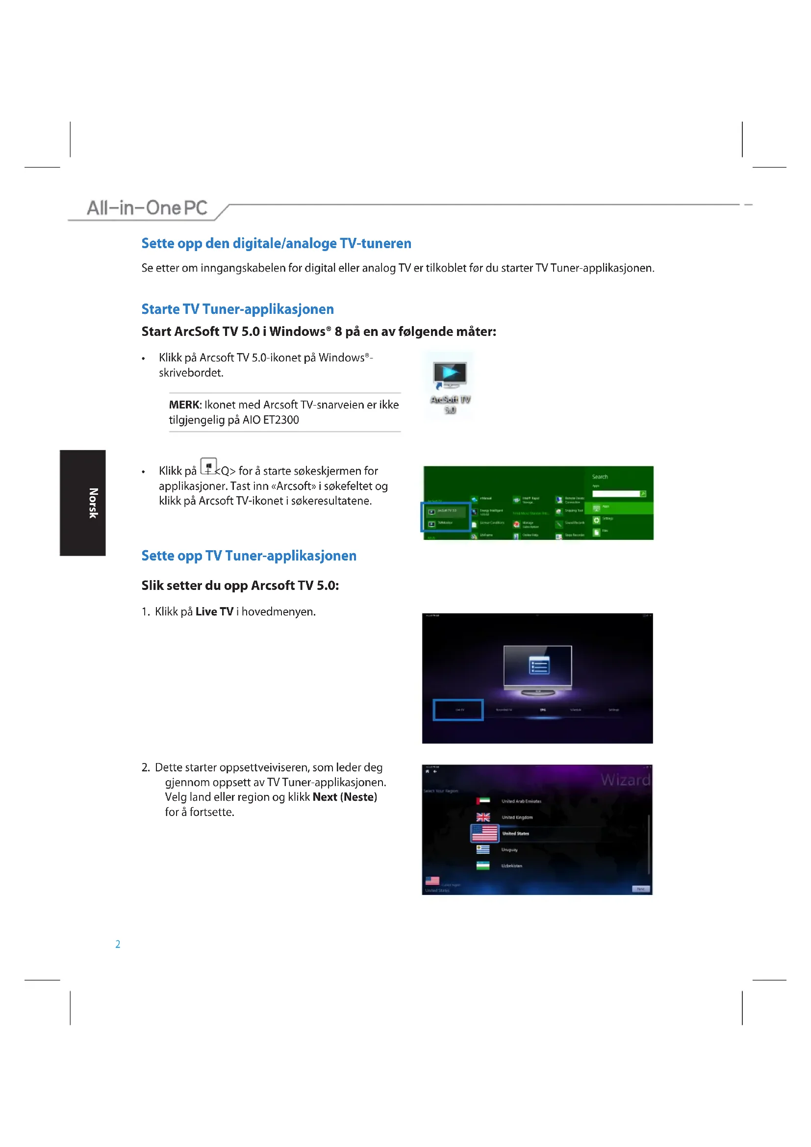 gjennom oppsett av TV Tuner-applikasjonen. Velg land eller region og klikk Next (Neste) for å fortsette.Norsk