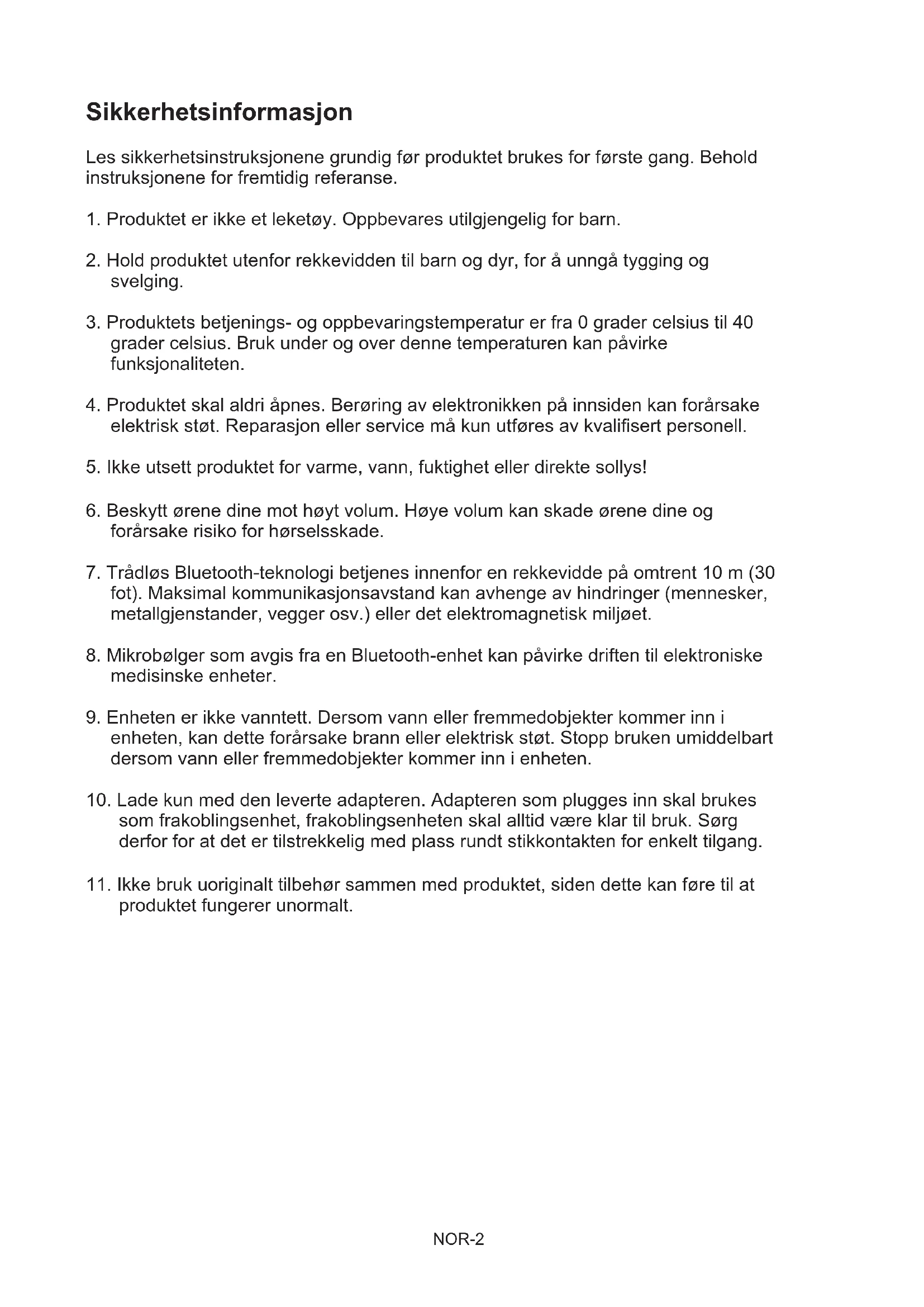 11. Ikke bruk uoriginalt tilbehør sammen med produktet, siden dette kan føre til at