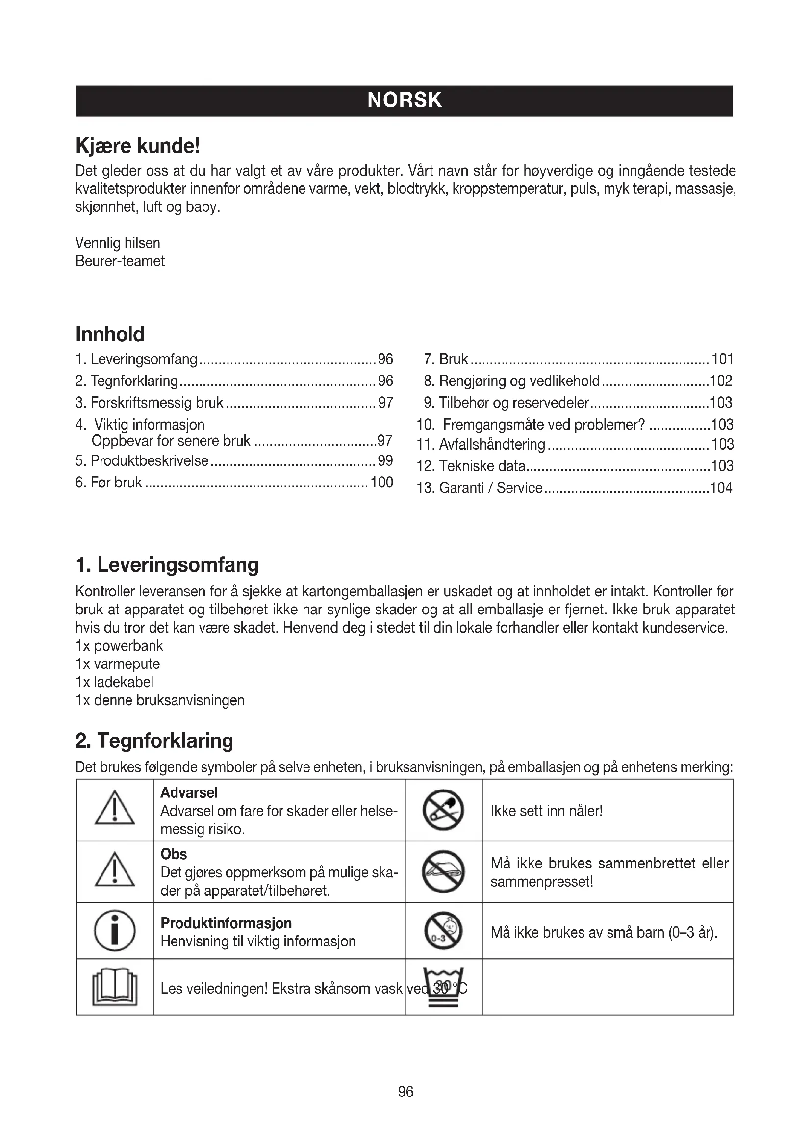 Det brukes følgende symboler på selve enheten, i bruksanvisningen, på emballasjen og på enhetens merking: Advarsel Advarsel om fare for skader eller helse- messig risiko. Ikke sett inn nåler! Obs Det gjøres oppmerksom på mulige ska- der på apparatet/tilbehøret. Må ikke brukes sammenbrettet eller sammenpresset! Produktinformasjon Henvisning til viktig informasjon Må ikke brukes av små barn (0–3 år). Les veiledningen! Ekstra skånsom vask ved 30 °C Innhold Kjære kunde! Det gleder oss at du har valgt et av våre produkter. Vårt navn står for høyverdige og inngående testede kvalitetsprodukter innenfor områdene varme, vekt, blodtrykk, kroppstemperatur, puls, myk terapi, massasje, skjønnhet, luft og baby. Vennlig hilsen Beurer-teamet97 Avhendes i samsvar med EU-direkti- vet for elektrisk og elektronisk utstyr 2002/96/EF – WEEE (Waste Electrical and Electronic Equipment) Må ikke blekes