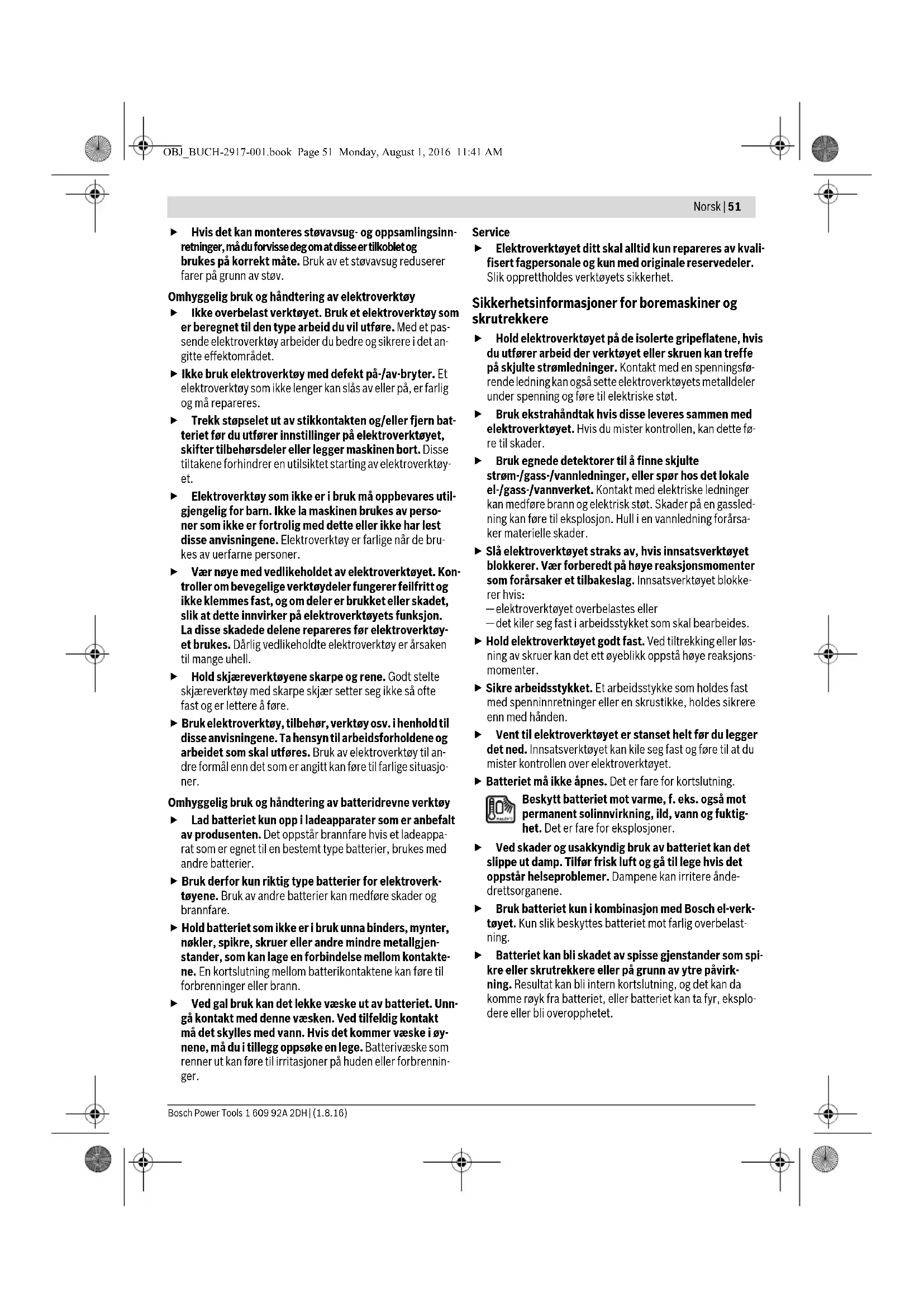- avhengig av benyttet batteri** redusert ytelse ved temperatur <0 °C OBJ_BUCH-2917-001.book Page 52 Monday, August 1, 2016 11:41 AMNorsk | 53 Bosch Power Tools 1 609 92A 2DH | (1.8.16) Til fjerning av batteriet 10 trykker du låsetastene 9 og trekker batteriet nedover ut av elektroverktøyet. Ikke bruk makt. Følg informasjonene om kassering. Verktøyskifte (se bilde B) Ta ut batteriet før alle arbeider på elektroverktøyet ut- føres. Innsetting av innsatsverktøy Trekk låsehylsen 1 fremover og skyv deretter innsatsverktøy- et helt inn i verktøyfestet 2. Innsatsverktøyet låses automa- tisk. Fjerning av innsatsverktøyet Trekk låsehylsen 1 fremover og ta ut innsatsverktøyet. Støv-/sponavsuging Støv fra materialer som blyholdig maling, noen tresorter, mineraler og metall kan være helsefarlige. Berøring eller innånding av støv kan utløse allergiske reaksjoner og/eller åndedrettssykdommer hos brukeren eller personer som befinner seg i nærheten. Visse typer støv som eik- eller bøkstøv gjelder som kreft- fremkallende, spesielt i kombinasjon med tilsetningsstof- fer til trebearbeidelse (kromat, trebeskyttelsesmidler). Asbestholdig materiale må kun bearbeides av fagfolk. – Sørg for god ventilasjon av arbeidsplassen. – Det anbefales å bruke en støvmaske med filterklasse P2. Følg ditt lands gyldige forskrifter for de materialene som skal bearbeides. Unngå støv på arbeidsplassen. Støv kan lett antennes. Bruk Igangsetting Innsetting av batteriet Merk: Bruk av batterier som ikke er egnet for dette verktøyet kan føre til feilfunksjoner eller til skader på elektroverktøyet. Innstilling av rotasjonsretningen (se bilde C) Med høyre-/venstrebryteren 4 kan du endre dreieretningen til elektroverktøyet. Ved trykt på-/av-bryter 5 er dette ikke mu- lig. Høyregang: Ved boring og innskruing av skruer trykker du høyre-/venstrebryteren 4 helt mot venstre. Venstregang: Til løsning hhv. utskruing av skruer trykker du høyre-/venstrebryteren 4 helt inn mot høyre. Forvalg av dreiemoment Med skyveren for dreiemomentforvalg 6 kan du forhåndsinn- stille det nødvendige dreiemomentet i 8 trinn. Ved riktig inn- stilling stanses innsatsverktøyet såsnart skruen er skrudd plant inn i materialet hhv. det innstilte dreiemomentet er nådd. I posisjon « » er slurekoplingen deaktivert, f. eks. til boring. I venstregang er slurekoplingen deaktivert. Inn-/utkobling Trykk til igangsetting av elektroverktøyet på på-/av-bryteren 5 og hold den trykt inne. Til utkobling av elektroverktøyet slipper du på-/av-bryteren