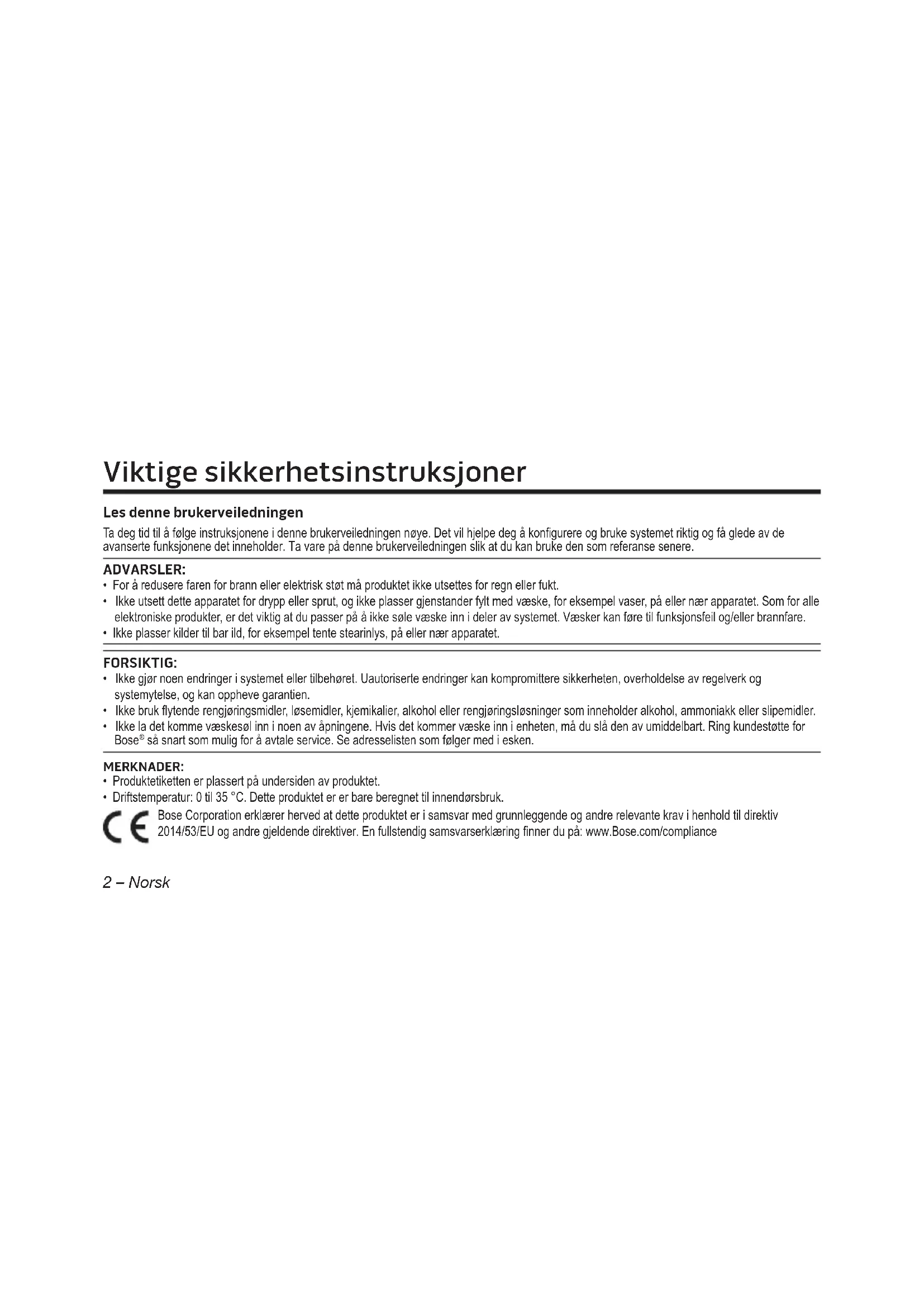 - Driftstemperatur: 0 til 35 °C. Dette produktet er er bare beregnet til innendørsbruk. Bose Corporation erklærer herved at dette produktet er i samsvar med grunnleggende og andre relevante krav i henhold til direktiv 2014/53/EU og andre gjeldende direktiver. En fullstendig samsvarserklæring finner du på: www.Bose.com/compliance Viktige sikkerhetsinstruksjonerNorsk – 3 For å samsvare med radiostrålingsgrensene i FCC og Industry Canada RF må denne enheten være plassert 20 cm fra alle personer. Det må ikke plasseres på samme sted eller brukes i forbindelse med andre antenner eller sendere. Dette produktet samsvarer med de kanadiske spesifikasjonene ICES-003 klasse B og RSS-210. I USA samsvarer dette produktet med spesifikasjonene i del 15 i CFR 47. Utstyret overholder Industry Canada-lisensunntak (RSS-standard(er)). Bruk av enheten er underlagt følgende to betingelser: (1) Dette utstyret skal ikke forårsake interferens, og (2) dette utstyret skal akseptere all interferens, inkludert interferens som kan føre til uønsket virkemåte for utstyret. MERK: Dette utstyret er testet og funnet å overholde grenseverdiene for digitale utstyrsenheter av klasse B, som beskrevet i del 15 av FCC- regelverket. Disse grenseverdiene er beregnet på å sikre rimelig beskyttelse mot skadelig radioforstyrrelse ved installasjon i boligmiljø. Utstyret genererer, bruker og kan avgi radiofrekvensenergi. Hvis det ikke installeres og brukes i overensstemmelse med instruksene, kan utstyret forårsake skadelig forstyrrelse av radiokommunikasjon. Det kan likevel ikke garanteres at slik forstyrrelse ikke vil kunne oppstå ved en gitt installasjon. Dersom dette utstyret skulle forårsake skadelig forstyrrelse for radio- eller TV-mottak, hvilket kan avgjøres ved å slå utstyret av og på igjen, oppfordres brukeren til å søke å avhjelpe forstyrrelsen med ett eller flere av følgende tiltak: