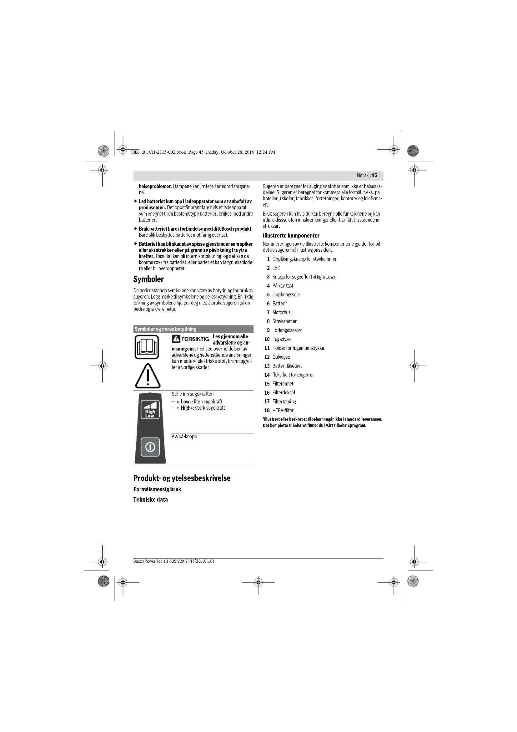 HEPA-filter *Illustrert eller beskrevet tilbehør inngår ikke i standard-leveransen. Det komplette tilbehøret finner du i vårt tilbehørsprogram. Tekniske data Symboler og deres betydning Les gjennom alle advarslene og an- visningene. Feil ved overholdelsen av advarslene og nedenstående anvisninger kan medføre elektriske støt, brann og/el- ler alvorlige skader. Stille inn sugekraften –«Low»: liten sugekraft –«High»: sterk sugekraft Av/på-knapp FORSIKTIG OBJ_BUCH-2315-002.book Page 45 Friday, October 28, 2016 12:24 PM46 | Norsk 1 609 92A 2F4 | (28.10.16) Bosch Power Tools Montering Opplading av batteriet