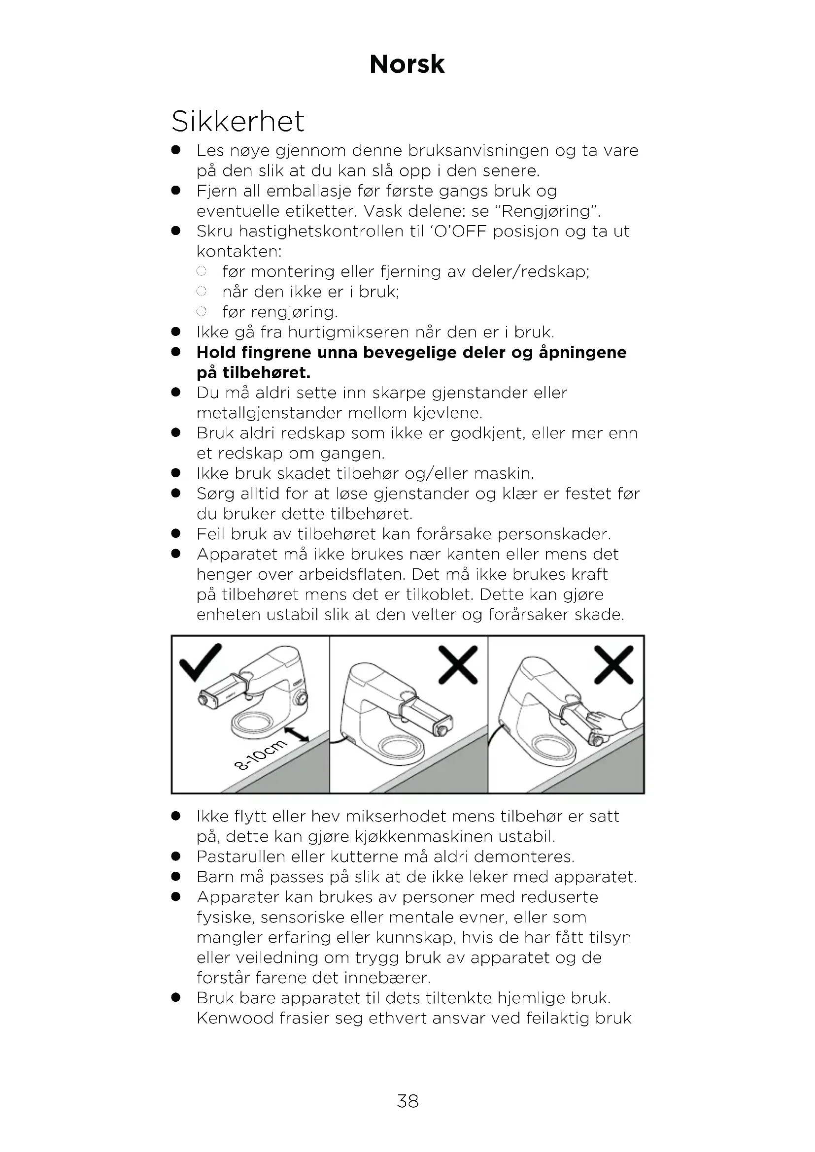 Apparatet må ikke brukes nær kanten eller mens det henger over arbeidsflaten. Det må ikke brukes kraft på tilbehøret mens det er tilkoblet. Dette kan gjøre enheten ustabil slik at den velter og forårsaker skade. 8-10cm