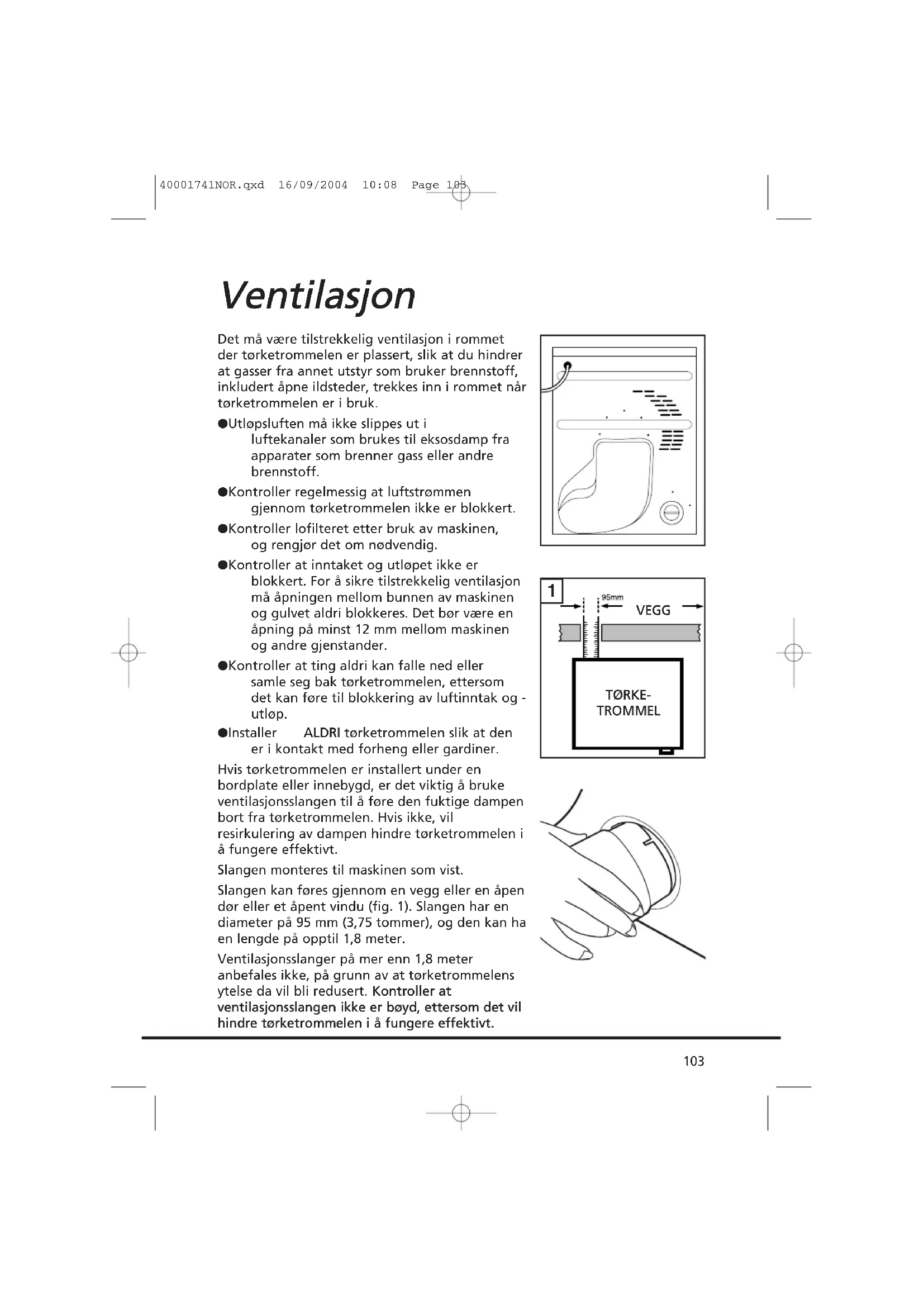 40001741NOR.qxd 16/09/2004 10:08 Page 103Før du bruker tørketrommelen for første gang: ● Les instruksjonene i denne håndboken nøye. ● Fjern alle objekter som er pakket inne i trommelen. ● Tørk innsiden av trommelen og døren med en fuktig klut slik at du fjerner eventuelt støv og smuss som har samlet seg under transporten. SSjjeekkkk aavv ttøøyyeett fføørr ttøørrkkiinngg Kontroller at tøyet som skal tørkes, er egnet for tørking i tørketrommel. Sjekk vedlikeholdssymbolene på tøyet. Kontroller at alle hemper er festet og at lommene er tomme. Vreng tøyet hvis aktuelt. Plasser tøyet løst i trommelen slik at plaggene ikke tvinnes inn i hverandre. MMaakkssiimmaall ttøørrkkeevveekktt ● Bomullstøy maks. 6 kg ● Syntetisk tøy maks. 3 kg