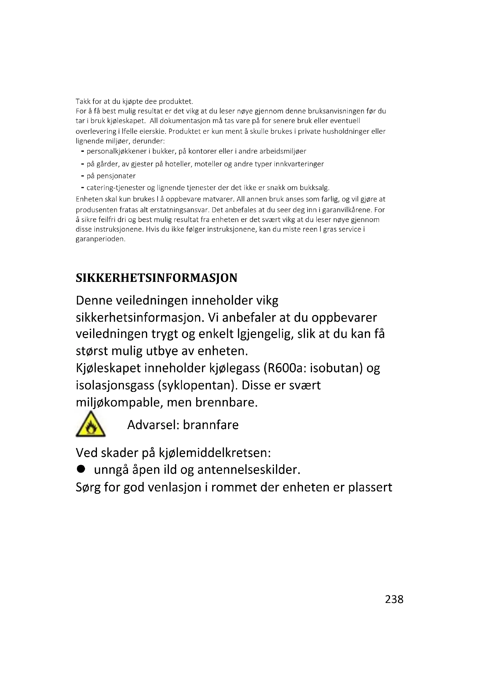 Advarsel: brannfare Ved skader på kjølemiddelkretsen: unngå åpen ild og antennelseskilder. Sørg for god ventilasjon i rommet der enheten er plassert Prosentandel kjører239 ADVARSEL! Når du rengjør/bærer enheten, må du være forsiktig så du ikke kommer borti metalltrådene for kondensatoren på baksiden, da dette kan gjøre at du skader fingrene eller produktet. Enheten er ikke ment å skulle stables på/under et annet produkt. Ikke sitt eller stå oppå enheten. Du risikerer å skade deg selv eller enheten. For å unngå at strømkabelen kuttes eller skades må du passe på at den ikke kommer i klem under enheten når denne bæres/flyttes. Vær forsiktig så du ikke skader gulvet, rør, veggtapet osv. når du plasserer enheten. Ikke flytt enheten ved å trekke i lokket eller håndtaket. Ikke la barn leke med enheten eller tukle med kontrollene. Selskapet vårt er ikke erstatningsansvarlig i tilfeller der instruksjonene ikke er fulgt. Ikke monter enheten på steder med fuktighet, olje eller støv, og ikke utsett den for direkte sollys og vann. Ikke monter enheten nær varmeelementer eller brennbare materialer. Ikke forsøk å åpne lokket ved strømbrudd. Hvis strømbruddet varer i mindre enn 20 timer, skal det ikke ha noe å si for de frosne matvarene. Ved lengre strømbrudd må matvarene undersøkes og enten spises direkte eller tilberedes og deretter240 fryses på nytt. Det er ingen grunn til bekymring om lokket på fryseren skulle være vanskelig å åpne like etter at du har lukket det. Trykkforskjellen som gjør at dette skjer, utlignes etter noen få minutter, og lokket kan da igjen åpnes som normalt. Fjern all emballasje og transportbeskyttelse før du kobler enheten til strømforsyningen. La enheten stå i minst 4 timer før du slår den på. Dette gir kompressoroljen tilstrekkelig tid til å stabilisere seg hvis enheten har blitt transportert horisontalt. Fryseren skal kun brukes til det tiltenkte formålet – det vil si oppbevaring og frysing av matvarer. Ikke oppbevar medisiner eller forskningsmaterialer i vinkjølerne. Materialer som krever streng temperaturregulering, kan bli forringet ved oppbevaring, eller det kan oppstå en ukontrollert og potensielt farlig reaksjon. Ta støpselet ut av stikkontakten før du utfører arbeider på enheten. Ved levering må du kontrollere at alle deler av produktet samt tilbehør er i perfekt stand. Hvis det oppdages en lekkasje i kjølesystemet, må du unngå å ta på veggkontakten. Ikke bruk åpen ild. Åpne vinduet for å slippe inn luft i rommet. Ring deretter et verksted for å bestille reparasjon. Ikke bruk skjøteledninger eller adaptere.241 Unngå å trekke hardt i eller bøye strømledningen, og ikke ta på støpselet mens du er våt på hendene. Unngå skader på støpselet og/eller strømledningen, da dette kan føre til elektrisk støt eller brann. Hvis strømledningen er skadet, må du få den skiftet av produsenten, en servicerepresentant for produsenten, eller en annen kvalifisert person. Unngå å plassere eller oppbevare brennbare og svært flyktige materialer som f.eks. eter, bensin, LPG, propangass, sprayflasker, lim eller ren alkohol nær enheten, da disse materialene kan forårsake eksplosjon. Ikke bruk eller oppbevar brennbare sprayer som f.eks. spraylakk nær vinkjølerne. Dette kan forårsake eksplosjon eller brann. Gjenstander og/eller beholdere som er fylt med vann, skal ikke plasseres oppå enheten. Bruk av skjøteledninger og multiadaptere er ikke anbefalt. Ikke forsøk å brenne enheten. Vær forsiktig så du ikke skader kjølekretsen/-rørene på enheten under transport og bruk. Hvis det har oppstått skader på enheten, må den holdes unna ild og potensielle antennelseskilder. Luft straks rommet der enheten er plassert. Kjølesystemet bak og inni vinkjølerne inneholder kjølemiddel. Pass derfor på at rørene ikke skades.242 Elektrisk utstyr skal ikke brukes i matoppbevaringsrommene i enheten med mindre utstyret er anbefalt av produsenten. Unngå skader på kjølekretsen. Hvis du ønsker å fremskynde avrimingen, må du bruke metoder/utstyr som produsenten har anbefalt. Elektrisk utstyr skal ikke brukes i matoppbevaringsrommene med mindre utstyret er anbefalt av produsenten. Ikke ta på de interne kjøleelementene (særlig ikke når du er våt på hendene). Dette kan føre til sprekkdannelse eller personskader. Sørg for at ventilasjonsåpningene i enhetskabinettet eller den innebygde strukturen ikke blokkeres. Ikke forsøk å fjerne rim ved hjelp av spisse eller skarpe gjenstander som for eksempel kniver eller gafler. Aldri bruk hårtørker, elektriske varmeovner eller lignende elektrisk utstyr for å avrime enheten. Ikke forsøk å skrape bort rim eller is med kniv eller en annen skarp gjenstand. Kjølekretsen kan da bli skadet, og det kan lekke ut væske som kan forårsake brann eller øyeskader. Ikke forsøk å fremskynde avrimingen ved hjelp av mekaniske enheter eller annet utstyr. Ikke under noen omstendigheter forsøk å få243 fortgang på avrimingen ved å bruke åpen ild, elektrisk utstyr som f.eks. varmeovner, damprengjøringsutstyr, stearinlys, oljelamper eller lignende. Ikke vask kompressoren med vann. Tørk av grundig med en tørr klut etter rengjøring for å unngå rust. Det anbefales å holde støpselet rent, da støvansamlinger kan medføre brannfare. Produktet er kun ment å skulle brukes i private husholdninger. Hvis produktet monteres eller brukes i annet enn bolighus (f.eks. i kommersielle bygninger), opphører garantien å gjelde. Produktet må monteres, plasseres og brukes samsvar med instruksjonene i den medfølgende veiledningen. Garantien gjelder kun nye produkter, og kan ikke overføres hvis produktet selges videre. Selskapet vårt kan ikke holdes ansvarlig for eventuelle tilfeldige skader eller følgeskader. Garantien begrenser ikke på noen måte de lovfestede rettighetene du har. Ikke forsøk å reparere denne vinkjøleren. Alle eventuelle arbeider må utføres av 