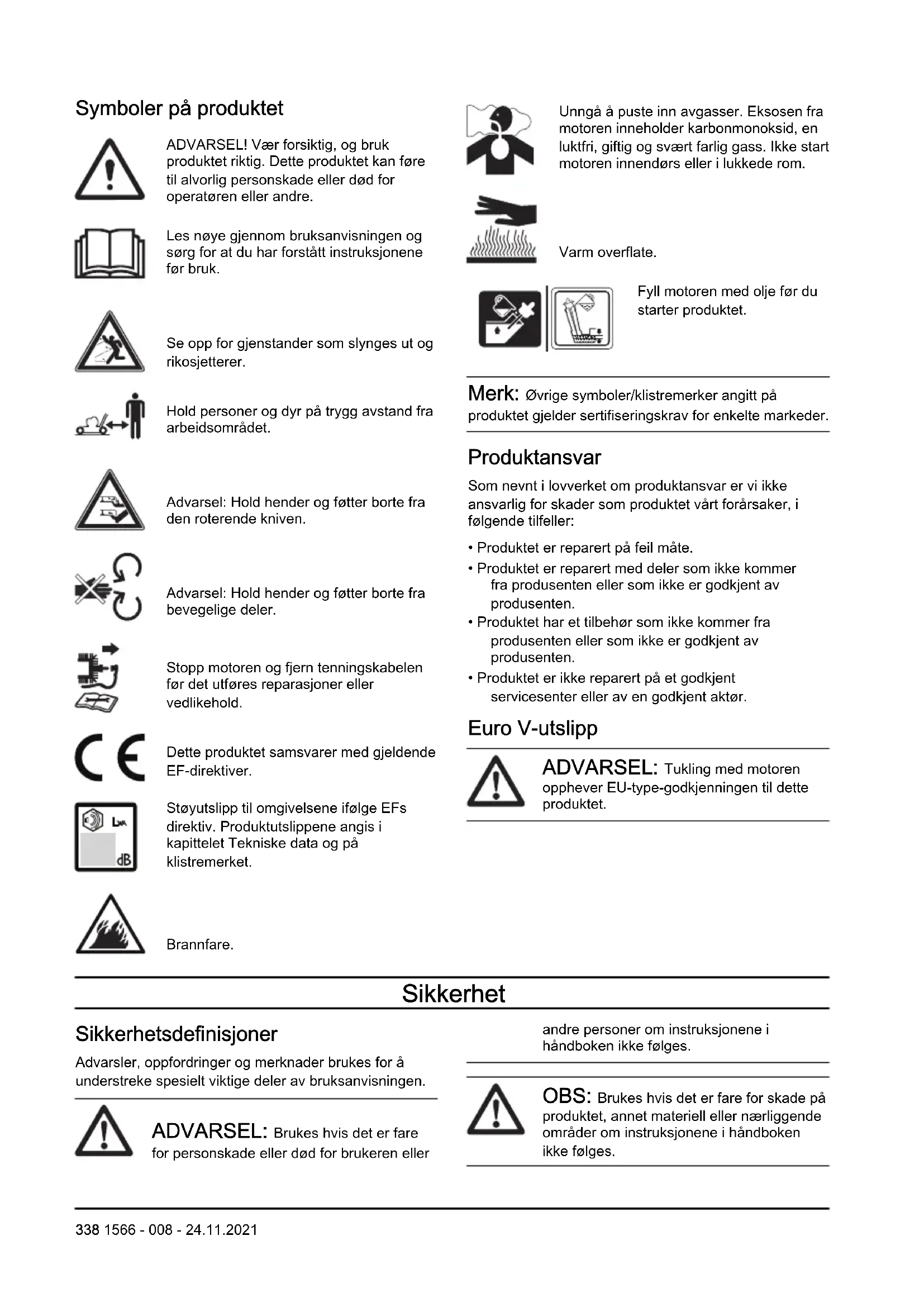 1566 - 008 - 24.11.2021 337Symboler på produktet ADVARSEL! Vær forsiktig, og bruk produktet riktig. Dette produktet kan føre til alvorlig personskade eller død for operatøren eller andre. Les nøye gjennom bruksanvisningen og sørg for at du har forstått instruksjonene før bruk. Se opp for gjenstander som slynges ut og rikosjetterer. Hold personer og dyr på trygg avstand fra arbeidsområdet. Advarsel: Hold hender og føtter borte fra den roterende kniven. Advarsel: Hold hender og føtter borte fra bevegelige deler. Stopp motoren og fjern tenningskabelen før det utføres reparasjoner eller vedlikehold. Dette produktet samsvarer med gjeldende EF-direktiver. Støyutslipp til omgivelsene ifølge EFs direktiv. Produktutslippene angis i kapittelet Tekniske data og på klistremerket. Brannfare. Unngå å puste inn avgasser. Eksosen fra motoren inneholder karbonmonoksid, en luktfri, giftig og svært farlig gass. Ikke start motoren innendørs eller i lukkede rom. Varm overflate. Fyll motoren med olje før du starter produktet. Merk: Øvrige symboler/klistremerker angitt på produktet gjelder sertifiseringskrav for enkelte markeder. Produktansvar Som nevnt i lovverket om produktansvar er vi ikke ansvarlig for skader som produktet vårt forårsaker, i følgende tilfeller: