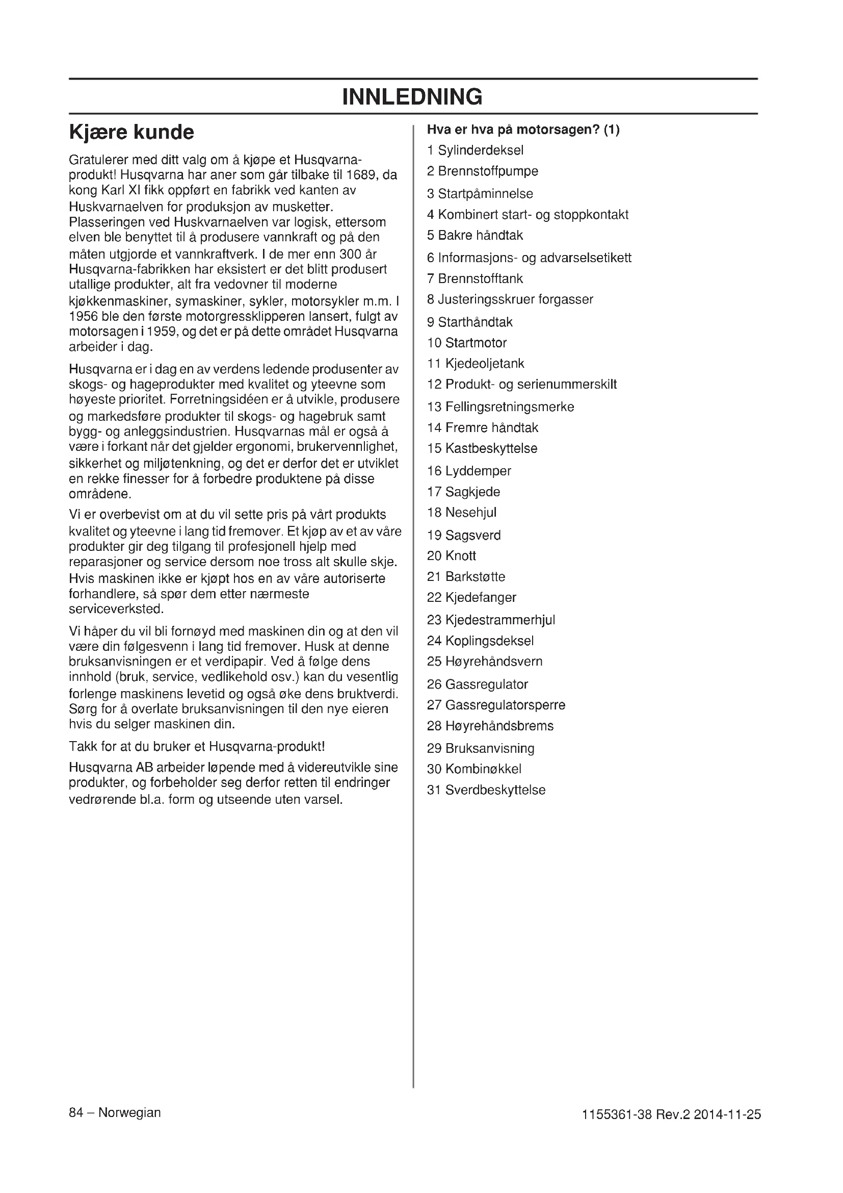 - EF-erklæring om samsvar INNLEDNING 84 – Norwegian 1155361-38 Rev.2 2014-11-25 Kjære kunde Gratulerer med ditt valg om å kjøpe et Husqvarna- produkt! Husqvarna har aner som går tilbake til 1689, da kong Karl XI fikk oppført en fabrikk ved kanten av Huskvarnaelven for produksjon av musketter. Plasseringen ved Huskvarnaelven var logisk, ettersom elven ble benyttet til å produsere vannkraft og på den måten utgjorde et vannkraftverk. I de mer enn 300 år Husqvarna-fabrikken har eksistert er det blitt produsert utallige produkter, alt fra vedovner til moderne kjøkkenmaskiner, symaskiner, sykler, motorsykler m.m. I 1956 ble den første motorgressklipperen lansert, fulgt av motorsagen i 1959, og det er på dette området Husqvarna arbeider i dag. Husqvarna er i dag en av verdens ledende produsenter av skogs- og hageprodukter med kvalitet og yteevne som høyeste prioritet. Forretningsidéen er å utvikle, produsere og markedsføre produkter til skogs- og hagebruk samt bygg- og anleggsindustrien. Husqvarnas mål er også å være i forkant når det gjelder ergonomi, brukervennlighet, sikkerhet og miljøtenkning, og det er derfor det er utviklet en rekke finesser for å forbedre produktene på disse områdene. Vi er overbevist om at du vil sette pris på vårt produkts kvalitet og yteevne i lang tid fremover. Et kjøp av et av våre produkter gir deg tilgang til profesjonell hjelp med reparasjoner og service dersom noe tross alt skulle skje. Hvis maskinen ikke er kjøpt hos en av våre autoriserte forhandlere, så spør dem etter nærmeste serviceverksted. Vi håper du vil bli fornøyd med maskinen din og at den vil være din følgesvenn i lang tid fremover. Husk at denne bruksanvisningen er et verdipapir. Ved å følge dens innhold (bruk, service, vedlikehold osv.) kan du vesentlig forlenge maskinens levetid og også øke dens bruktverdi. Sørg for å overlate bruksanvisningen til den nye eieren hvis du selger maskinen din. Takk for at du bruker et Husqvarna-produkt! Husqvarna AB arbeider løpende med å videreutvikle sine produkter, og forbeholder seg derfor retten til endringer vedrørende bl.a. form og utseende uten varsel. Hva er hva på motorsagen? (1) 1 Sylinderdeksel 2 Brennstoffpumpe 3 Startpåminnelse 4 Kombinert start- og stoppkontakt 5 Bakre håndtak 6 Informasjons- og advarselsetikett 7 Brennstofftank 8 Justeringsskruer forgasser 9 Starthåndtak 10 Startmotor 11 Kjedeoljetank 12 Produkt- og serienummerskilt 13 Fellingsretningsmerke 14 Fremre håndtak 15 Kastbeskyttelse 16 Lyddemper 17 Sagkjede 18 Nesehjul 19 Sagsverd 20 Knott 21 Barkstøtte 22 Kjedefanger 23 Kjedestrammerhjul 24 Koplingsdeksel 25 Høyrehåndsvern 26 Gassregulator 27 Gassregulatorsperre 28 Høyrehåndsbrems 29 Bruksanvisning 30 Kombinøkkel 31 SverdbeskyttelseGENERELLE SIKKERHETSINSTRUKSJONER Norwegian – 85 1155361-38 Rev.2 2014-11-25 Tiltak før bruk av en ny motorsag p. 105