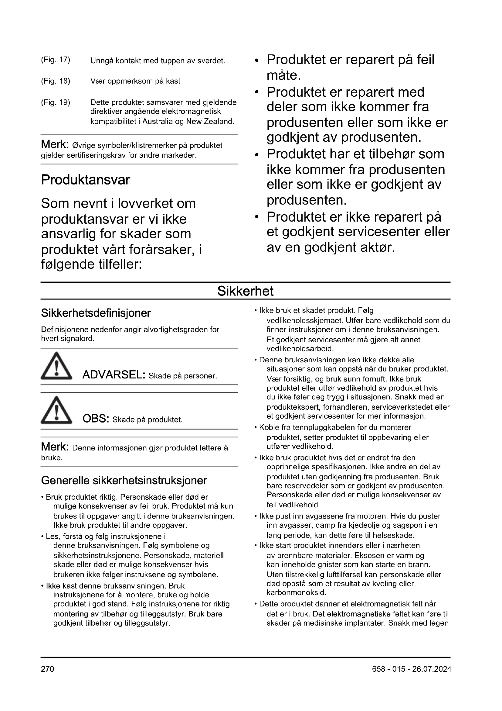 - Les, forstå og følg instruksjonene i denne bruksanvisningen. Følg symbolene og sikkerhetsinstruksjonene. Personskade, materiell skade eller død er mulige konsekvenser hvis brukeren ikke følger instruksene og symbolene.