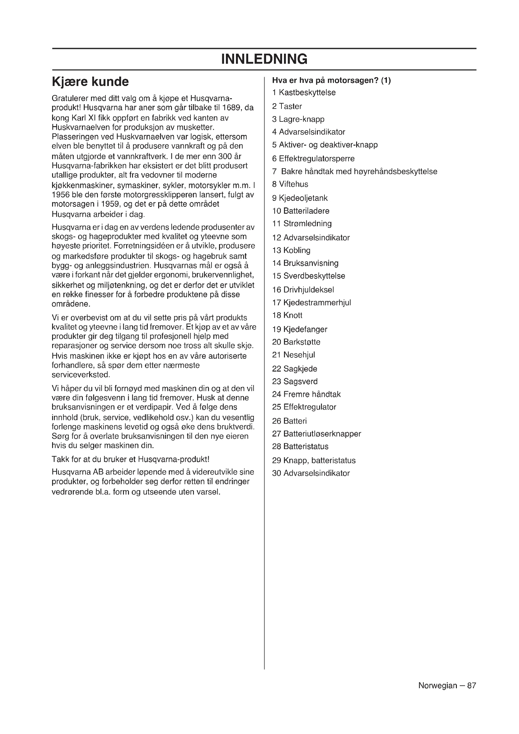 - EF-erklæring om samsvar INNLEDNING Norwegian – 87 Kjære kunde Gratulerer med ditt valg om å kjøpe et Husqvarna- produkt! Husqvarna har aner som går tilbake til 1689, da kong Karl XI fikk oppført en fabrikk ved kanten av Huskvarnaelven for produksjon av musketter. Plasseringen ved Huskvarnaelven var logisk, ettersom elven ble benyttet til å produsere vannkraft og på den måten utgjorde et vannkraftverk. I de mer enn 300 år Husqvarna-fabrikken har eksistert er det blitt produsert utallige produkter, alt fra vedovner til moderne kjøkkenmaskiner, symaskiner, sykler, motorsykler m.m. I 1956 ble den første motorgressklipperen lansert, fulgt av motorsagen i 1959, og det er på dette området Husqvarna arbeider i dag. Husqvarna er i dag en av verdens ledende produsenter av skogs- og hageprodukter med kvalitet og yteevne som høyeste prioritet. Forretningsidéen er å utvikle, produsere og markedsføre produkter til skogs- og hagebruk samt bygg- og anleggsindustrien. Husqvarnas mål er også å være i forkant når det gjelder ergonomi, brukervennlighet, sikkerhet og miljøtenkning, og det er derfor det er utviklet en rekke finesser for å forbedre produktene på disse områdene. Vi er overbevist om at du vil sette pris på vårt produkts kvalitet og yteevne i lang tid fremover. Et kjøp av et av våre produkter gir deg tilgang til profesjonell hjelp med reparasjoner og service dersom noe tross alt skulle skje. Hvis maskinen ikke er kjøpt hos en av våre autoriserte forhandlere, så spør dem etter nærmeste serviceverksted. Vi håper du vil bli fornøyd med maskinen din og at den vil være din følgesvenn i lang tid fremover. Husk at denne bruksanvisningen er et verdipapir. Ved å følge dens innhold (bruk, service, vedlikehold osv.) kan du vesentlig forlenge maskinens levetid og også øke dens bruktverdi. Sørg for å overlate bruksanvisningen til den nye eieren hvis du selger maskinen din. Takk for at du bruker et Husqvarna-produkt! Husqvarna AB arbeider løpende med å videreutvikle sine produkter, og forbeholder seg derfor retten til endringer vedrørende bl.a. form og utseende uten varsel. Hva er hva på motorsagen? (1) 1 Kastbeskyttelse 2 Taster 3 Lagre-knapp 4 Advarselsindikator 5 Aktiver- og deaktiver-knapp 6 Effektregulatorsperre 7 Bakre håndtak med høyrehåndsbeskyttelse 8 Viftehus 9 Kjedeoljetank 10 Batteriladere 11 Strømledning 12 Advarselsindikator 13 Kobling 14 Bruksanvisning 15 Sverdbeskyttelse 16 Drivhjuldeksel 17 Kjedestrammerhjul 18 Knott 19 Kjedefanger 20 Barkstøtte 21 Nesehjul 22 Sagkjede 23 Sagsverd 24 Fremre håndtak 25 Effektregulator 26 Batteri 27 Batteriutløserknapper 28 Batteristatus 29 Knapp, batteristatus 30 AdvarselsindikatorGENERELLE SIKKERHETSINSTRUKSJONER 88 – Norwegian Generelle sikkerhetsadvarsler for motorredskaper Sikkerhet i arbeidsområdet p. 109
