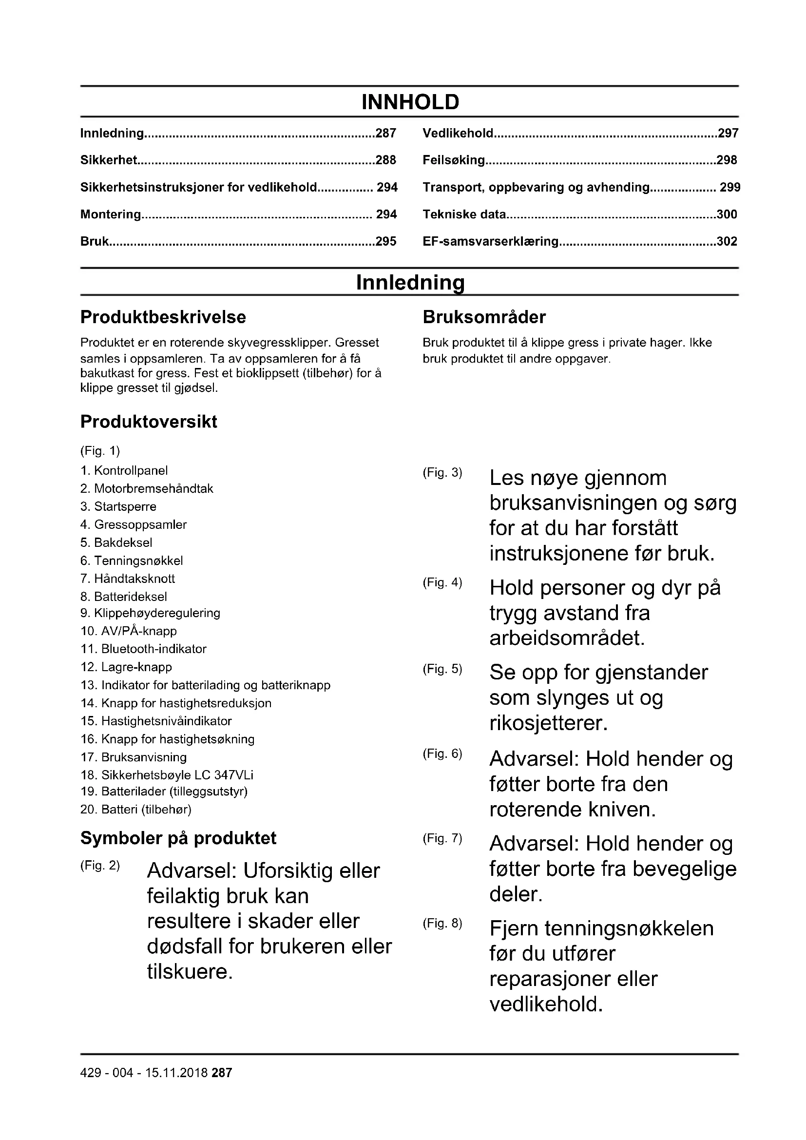 Symboler på produktet (Fig. 2) Advarsel: Uforsiktig eller feilaktig bruk kan resultere i skader eller dødsfall for brukeren eller tilskuere. (Fig. 3) Les nøye gjennom bruksanvisningen og sørg for at du har forstått instruksjonene før bruk. (Fig. 4) Hold personer og dyr på trygg avstand fra arbeidsområdet. (Fig. 5) Se opp for gjenstander som slynges ut og rikosjetterer. (Fig. 6) Advarsel: Hold hender og føtter borte fra den roterende kniven. (Fig. 7) Advarsel: Hold hender og føtter borte fra bevegelige deler. (Fig. 8) Fjern tenningsnøkkelen før du utfører reparasjoner eller vedlikehold.
