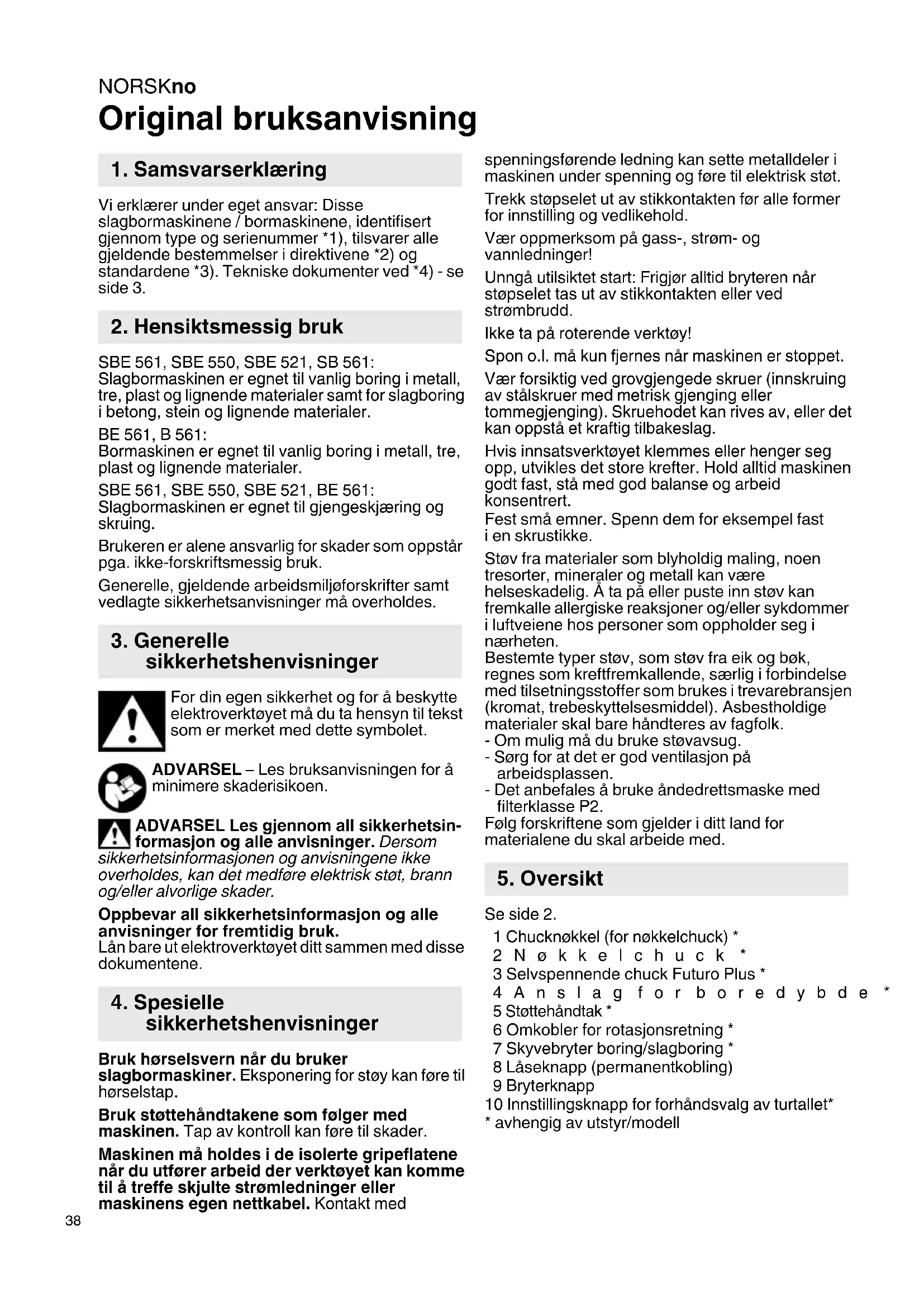 Original bruksanvisning Vi erklærer under eget ansvar: Disse slagbormaskinene / bormaskinene, identifisert gjennom type og serienummer *1), tilsvarer alle gjeldende bestemmelser i direktivene *2) og standardene *3). Tekniske dokumenter ved *4) - se side 3. SBE 561, SBE 550, SBE 521, SB 561: Slagbormaskinen er egnet til vanlig boring i metall, tre, plast og lignende materialer samt for slagboring i betong, stein og lignende materialer. BE 561, B 561: Bormaskinen er egnet til vanlig boring i metall, tre, plast og lignende materialer. SBE 561, SBE 550, SBE 521, BE 561: Slagbormaskinen er egnet til gjengeskjæring og skruing. Brukeren er alene ansvarlig for skader som oppstår pga. ikke-forskriftsmessig bruk. Generelle, gjeldende arbeidsmiljøforskrifter samt vedlagte sikkerhetsanvisninger må overholdes. For din egen sikkerhet og for å beskytte elektroverktøyet må du ta hensyn til tekst som er merket med dette symbolet. ADVARSEL – Les bruksanvisningen for å minimere skaderisikoen. ADVARSEL Les gjennom all sikkerhetsin- formasjon og alle anvisninger. Dersom sikkerhetsinformasjonen og anvisningene ikke overholdes, kan det medføre elektrisk støt, brann og/eller alvorlige skader. Oppbevar all sikkerhetsinformasjon og alle anvisninger for fremtidig bruk. Lån bare ut elektroverktøyet ditt sammen med disse dokumentene. Bruk hørselsvern når du bruker slagbormaskiner. Eksponering for støy kan føre til hørselstap. Bruk støttehåndtakene som følger med maskinen. Tap av kontroll kan føre til skader. Maskinen må holdes i de isolerte gripeflatene når du utfører arbeid der verktøyet kan komme til å treffe skjulte strømledninger eller maskinens egen nettkabel. Kontakt med spenningsførende ledning kan sette metalldeler i maskinen under spenning og føre til elektrisk støt. Trekk støpselet ut av stikkontakten før alle former for innstilling og vedlikehold. Vær oppmerksom på gass-, strøm- og vannledninger! Unngå utilsiktet start: Frigjør alltid bryteren når støpselet tas ut av stikkontakten eller ved strømbrudd. Ikke ta på roterende verktøy! Spon o.l. må kun fjernes når maskinen er stoppet. Vær forsiktig ved grovgjengede skruer (innskruing av stålskruer med metrisk gjenging eller tommegjenging). Skruehodet kan rives av, eller det kan oppstå et kraftig tilbakeslag. Hvis innsatsverktøyet klemmes eller henger seg opp, utvikles det store krefter. Hold alltid maskinen godt fast, stå med god balanse og arbeid konsentrert. Fest små emner. Spenn dem for eksempel fast i en skrustikke. Støv fra materialer som blyholdig maling, noen tresorter, mineraler og metall kan være helseskadelig. Å ta på eller puste inn støv kan fremkalle allergiske reaksjoner og/eller sykdommer i luftveiene hos personer som oppholder seg i nærheten. Bestemte typer støv, som støv fra eik og bøk, regnes som kreftfremkallende, særlig i forbindelse med tilsetningsstoffer som brukes i trevarebransjen (kromat, trebeskyttelsesmiddel). Asbestholdige materialer skal bare håndteres av fagfolk. - Om mulig må du bruke støvavsug. - Sørg for at det er god ventilasjon på arbeidsplassen. - Det anbefales å bruke åndedrettsmaske med filterklasse P2. Følg forskriftene som gjelder i ditt land for materialene du skal arbeide med. Se side 2. 1 Chucknøkkel (for nøkkelchuck) * 2Nøkkelchuck * 3 Selvspennende chuck Futuro Plus * 4Anslag for boredybde * 5 Støttehåndtak * 6 Omkobler for rotasjonsretning * 7 Skyvebryter boring/slagboring * 8 Låseknapp (permanentkobling) 9 Bryterknapp 10 Innstillingsknapp for forhåndsvalg av turtallet*