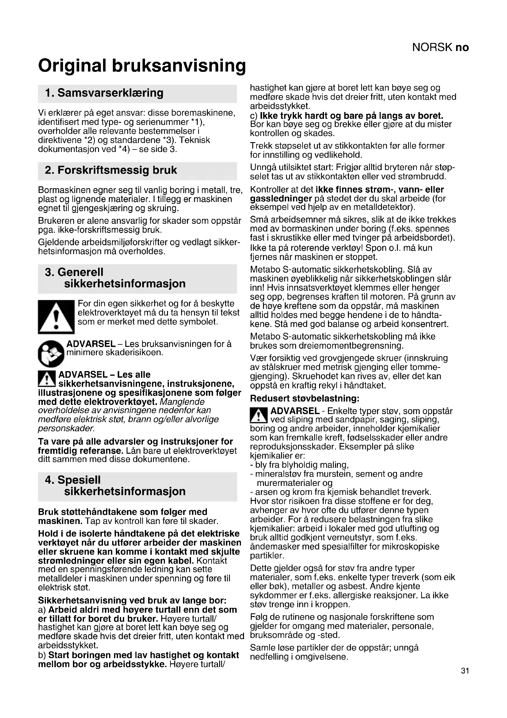 Original bruksanvisning Vi erklærer på eget ansvar: disse boremaskinene, identifisert med type- og serienummer *1), overholder alle relevante bestemmelser i direktivene *2) og standardene *3). Teknisk dokumentasjon ved *4) – se side 3. Bormaskinen egner seg til vanlig boring i metall, tre, plast og lignende materialer. I tillegg er maskinen egnet til gjengeskjæring og skruing. Brukeren er alene ansvarlig for skader som oppstår pga. ikke-forskriftsmessig bruk. Gjeldende arbeidsmiljøforskrifter og vedlagt sikker- hetsinformasjon må overholdes. For din egen sikkerhet og for å beskytte elektroverktøyet må du ta hensyn til tekst som er merket med dette symbolet. ADVARSEL – Les bruksanvisningen for å minimere skaderisikoen. ADVARSEL – Les alle sikkerhetsanvisningene, instruksjonene, illustrasjonene og spesifikasjonene som følger med dette elektroverktøyet. Manglende overholdelse av anvisningene nedenfor kan medføre elektrisk støt, brann og/eller alvorlige personskader. Ta vare på alle advarsler og instruksjoner for fremtidig referanse. Lån bare ut elektroverktøyet ditt sammen med disse dokumentene. Bruk støttehåndtakene som følger med maskinen. Tap av kontroll kan føre til skader. Hold i de isolerte håndtakene på det elektriske verktøyet når du utfører arbeider der maskinen eller skruene kan komme i kontakt med skjulte strømledninger eller sin egen kabel. Kontakt med en spenningsførende ledning kan sette metalldeler i maskinen under spenning og føre til elektrisk støt. Sikkerhetsanvisning ved bruk av lange bor: a) Arbeid aldri med høyere turtall enn det som er tillatt for boret du bruker. Høyere turtall/ hastighet kan gjøre at boret lett kan bøye seg og medføre skade hvis det dreier fritt, uten kontakt med arbeidsstykket. b) Start boringen med lav hastighet og kontakt mellom bor og arbeidsstykke. Høyere turtall/ hastighet kan gjøre at boret lett kan bøye seg og medføre skade hvis det dreier fritt, uten kontakt med arbeidsstykket. c) Ikke trykk hardt og bare på langs av boret. Bor kan bøye seg og brekke eller gjøre at du mister kontrollen og skades. Trekk støpselet ut av stikkontakten før alle former for innstilling og vedlikehold. Unngå utilsiktet start: Frigjør alltid bryteren når støp- selet tas ut av stikkontakten eller ved strømbrudd. Kontroller at det ikke finnes strøm-, vann- eller gassledninger på stedet der du skal arbeide (for eksempel ved hjelp av en metalldetektor). Små arbeidsemner må sikres, slik at de ikke trekkes med av bormaskinen under boring (f.eks. spennes fast i skrustikke eller med tvinger på arbeidsbordet). Ikke ta på roterende verktøy! Spon o.l. må kun fjernes når maskinen er stoppet. Metabo S-automatic sikkerhetskobling. Slå av maskinen øyeblikkelig når sikkerhetskoblingen slår inn! Hvis innsatsverktøyet klemmes eller henger seg opp, begrenses kraften til motoren. På grunn av de høye kreftene som da oppstår, må maskinen alltid holdes med begge hendene i de to håndta- kene. Stå med god balanse og arbeid konsentrert. Metabo S-automatic sikkerhetskobling må ikke brukes som dreiemomentbegrensning. Vær forsiktig ved grovgjengede skruer (innskruing av stålskruer med metrisk gjenging eller tomme- gjenging). Skruehodet kan rives av, eller det kan oppstå en kraftig rekyl i håndtaket. Redusert støvbelastning: ADVARSEL - Enkelte typer støv, som oppstår ved sliping med sandpapir, saging, sliping, boring og andre arbeider, inneholder kjemikalier som kan fremkalle kreft, fødselsskader eller andre reproduksjonsskader. Eksempler på slike kjemikalier er: - bly fra blyholdig maling, - mineralstøv fra murstein, sement og andre murermaterialer og - arsen og krom fra kjemisk behandlet treverk. Hvor stor risikoen fra disse stoffene er for deg, avhenger av hvor ofte du utfører denne typen arbeider. For å redusere belastningen fra slike kjemikalier: arbeid i lokaler med god utlufting og bruk alltid godkjent verneutstyr, som f.eks. åndemasker med spesialfilter for mikroskopiske partikler. Dette gjelder også for støv fra andre typer materialer, som f.eks. enkelte typer treverk (som eik eller bøk), metaller og asbest. Andre kjente sykdommer er f.eks. allergiske reaksjoner. La ikke støv trenge inn i kroppen. Følg de rutinene og nasjonale forskriftene som gjelder for omgang med materialer, personale, bruksområde og -sted. Samle løse partikler der de oppstår; unngå nedfelling i omgivelsene.