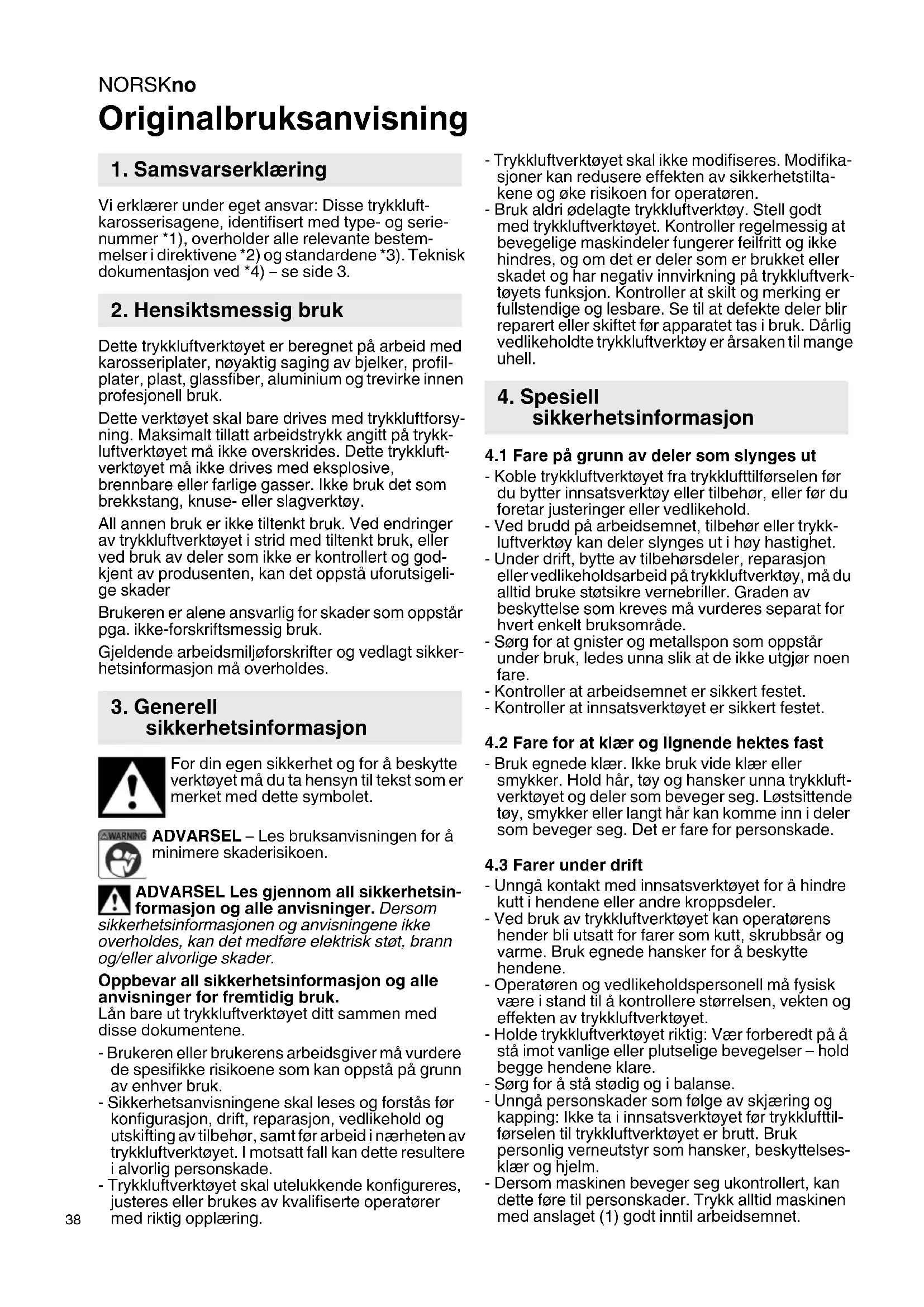Originalbruksanvisning Vi erklærer under eget ansvar: Disse trykkluft- karosserisagene, identifisert med type- og serie- nummer *1), overholder alle relevante bestem- melser i direktivene *2) og standardene *3). Teknisk dokumentasjon ved *4) – se side 3. Dette trykkluftverktøyet er beregnet på arbeid med karosseriplater, nøyaktig saging av bjelker, profil- plater, plast, glassfiber, aluminium og trevirke innen profesjonell bruk. Dette verktøyet skal bare drives med trykkluftforsy- ning. Maksimalt tillatt arbeidstrykk angitt på trykk- luftverktøyet må ikke overskrides. Dette trykkluft- verktøyet må ikke drives med eksplosive, brennbare eller farlige gasser. Ikke bruk det som brekkstang, knuse- eller slagverktøy. All annen bruk er ikke tiltenkt bruk. Ved endringer av trykkluftverktøyet i strid med tiltenkt bruk, eller ved bruk av deler som ikke er kontrollert og god- kjent av produsenten, kan det oppstå uforutsigeli- ge skader Brukeren er alene ansvarlig for skader som oppstår pga. ikke-forskriftsmessig bruk. Gjeldende arbeidsmiljøforskrifter og vedlagt sikker- hetsinformasjon må overholdes. For din egen sikkerhet og for å beskytte verktøyet må du ta hensyn til tekst som er merket med dette symbolet. ADVARSEL – Les bruksanvisningen for å minimere skaderisikoen. ADVARSEL Les gjennom all sikkerhetsin- formasjon og alle anvisninger. Dersom sikkerhetsinformasjonen og anvisningene ikke overholdes, kan det medføre elektrisk støt, brann og/eller alvorlige skader. Oppbevar all sikkerhetsinformasjon og alle anvisninger for fremtidig bruk. Lån bare ut trykkluftverktøyet ditt sammen med disse dokumentene. - Brukeren eller brukerens arbeidsgiver må vurdere de spesifikke risikoene som kan oppstå på grunn av enhver bruk. - Sikkerhetsanvisningene skal leses og forstås før konfigurasjon, drift, reparasjon, vedlikehold og utskifting av tilbehør, samt før arbeid i nærheten av trykkluftverktøyet. I motsatt fall kan dette resultere i alvorlig personskade. - Trykkluftverktøyet skal utelukkende konfigureres, justeres eller brukes av kvalifiserte operatører med riktig opplæring. - Trykkluftverktøyet skal ikke modifiseres. Modifika- sjoner kan redusere effekten av sikkerhetstilta- kene og øke risikoen for operatøren. - Bruk aldri ødelagte trykkluftverktøy. Stell godt med trykkluftverktøyet. Kontroller regelmessig at bevegelige maskindeler fungerer feilfritt og ikke hindres, og om det er deler som er brukket eller skadet og har negativ innvirkning på trykkluftverk- tøyets funksjon. Kontroller at skilt og merking er fullstendige og lesbare. Se til at defekte deler blir reparert eller skiftet før apparatet tas i bruk. Dårlig vedlikeholdte trykkluftverktøy er årsaken til mange uhell.