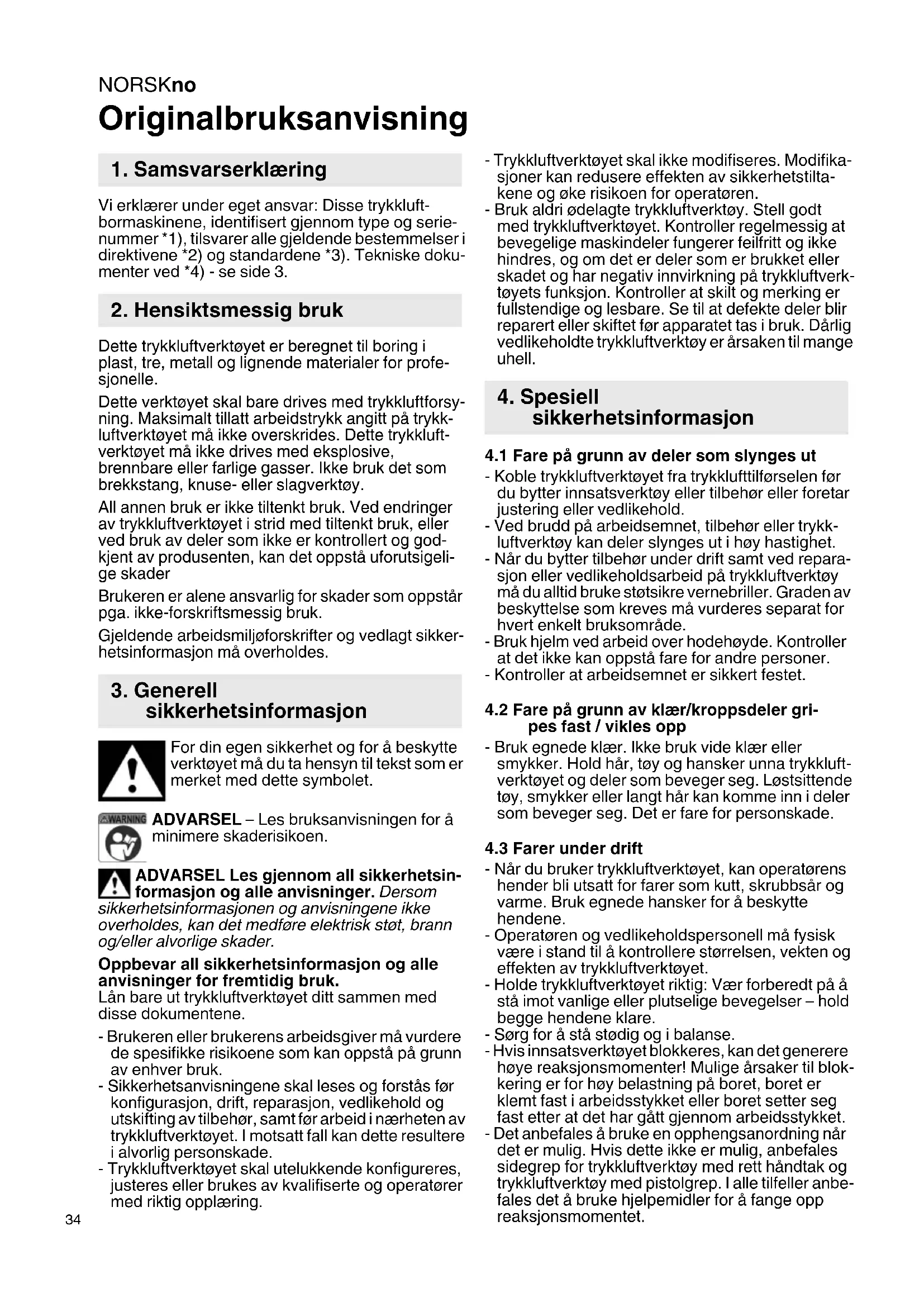 - Virkningene av vibrasjon kan føre til skade på nerver og forstyrrelser i blodsirkulasjonen i hender og armer. - Bruk varme klær når du arbeider i kalde omgi- velser og hold hendene varme og tørre. - Hvis du oppdager at huden på fingrene eller hendene er nummen, kribler, verker eller blir misfarget hvit, må du avbryte arbeidet med trykk- luftverktøyet, varsle arbeidsgiver umiddelbart og oppsøke lege. - Trykkluftverktøyet skal drives og vedlikeholdes i samsvar med anbefalingene i denne bruksanvis- ningen for å unngå unødvendig forsterkning av vibrasjoner. - Ikke la boret skrangle mot arbeidsemnet, da dette sannsynligvis vil føre til en betydelig økning i av vibrasjonene. - Forbruksmateriell og innsatsverktøy skal velges ut, vedlikeholdes og byttes i samsvar med anbefa- lingene i denne veiledningen, for å unngå unød- vendig økning av vibrasjoner.NORSKno