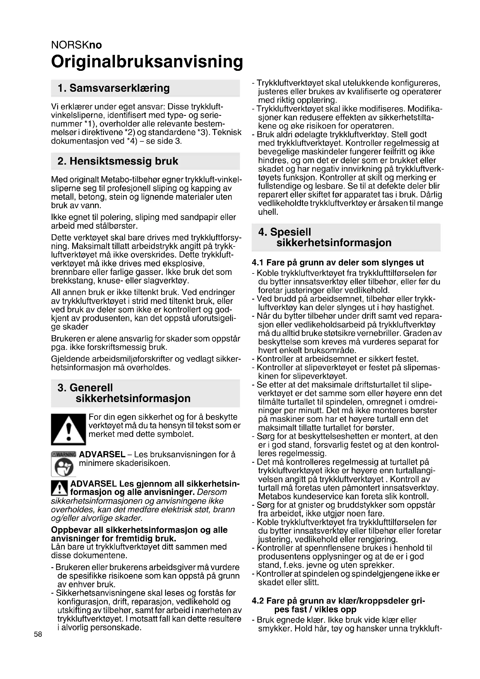 Originalbruksanvisning Vi erklærer under eget ansvar: Disse trykkluft- vinkelsliperne, identifisert med type- og serie- nummer *1), overholder alle relevante bestem- melser i direktivene *2) og standardene *3). Teknisk dokumentasjon ved *4) – se side 3. Med originalt Metabo-tilbehør egner trykkluft-vinkel- sliperne seg til profesjonell sliping og kapping av metall, betong, stein og lignende materialer uten bruk av vann. Ikke egnet til polering, sliping med sandpapir eller arbeid med stålbørster. Dette verktøyet skal bare drives med trykkluftforsy- ning. Maksimalt tillatt arbeidstrykk angitt på trykk- luftverktøyet må ikke overskrides. Dette trykkluft- verktøyet må ikke drives med eksplosive, brennbare eller farlige gasser. Ikke bruk det som brekkstang, knuse- eller slagverktøy. All annen bruk er ikke tiltenkt bruk. Ved endringer av trykkluftverktøyet i strid med tiltenkt bruk, eller ved bruk av deler som ikke er kontrollert og god- kjent av produsenten, kan det oppstå uforutsigeli- ge skader Brukeren er alene ansvarlig for skader som oppstår pga. ikke forskriftsmessig bruk. Gjeldende arbeidsmiljøforskrifter og vedlagt sikker- hetsinformasjon må overholdes. For din egen sikkerhet og for å beskytte verktøyet må du ta hensyn til tekst som er merket med dette symbolet. ADVARSEL – Les bruksanvisningen for å minimere skaderisikoen. ADVARSEL Les gjennom all sikkerhetsin- formasjon og alle anvisninger. Dersom sikkerhetsinformasjonen og anvisningene ikke overholdes, kan det medføre elektrisk støt, brann og/eller alvorlige skader. Oppbevar all sikkerhetsinformasjon og alle anvisninger for fremtidig bruk. Lån bare ut trykkluftverktøyet ditt sammen med disse dokumentene. - Brukeren eller brukerens arbeidsgiver må vurdere de spesifikke risikoene som kan oppstå på grunn av enhver bruk. - Sikkerhetsanvisningene skal leses og forstås før konfigurasjon, drift, reparasjon, vedlikehold og utskifting av tilbehør, samt før arbeid i nærheten av trykkluftverktøyet. I motsatt fall kan dette resultere i alvorlig personskade. - Trykkluftverktøyet skal utelukkende konfigureres, justeres eller brukes av kvalifiserte og operatører med riktig opplæring. - Trykkluftverktøyet skal ikke modifiseres. Modifika- sjoner kan redusere effekten av sikkerhetstilta- kene og øke risikoen for operatøren. - Bruk aldri ødelagte trykkluftverktøy. Stell godt med trykkluftverktøyet. Kontroller regelmessig at bevegelige maskindeler fungerer feilfritt og ikke hindres, og om det er deler som er brukket eller skadet og har negativ innvirkning på trykkluftverk- tøyets funksjon. Kontroller at skilt og merking er fullstendige og lesbare. Se til at defekte deler blir reparert eller skiftet før apparatet tas i bruk. Dårlig vedlikeholdte trykkluftverktøy er årsaken til mange uhell.