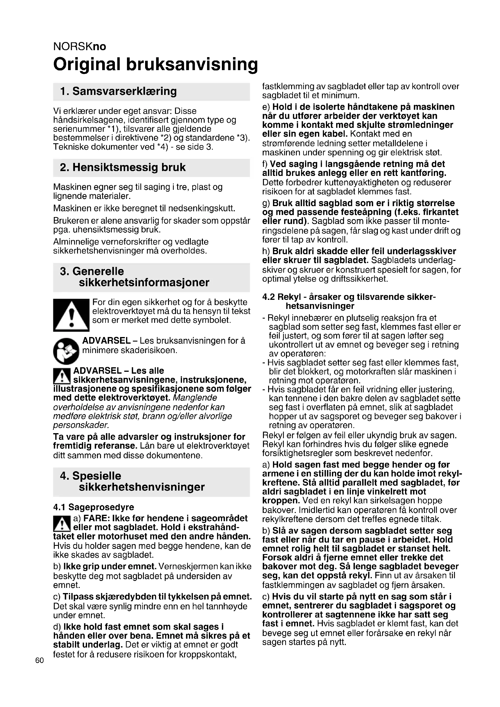 Original bruksanvisning Vi erklærer under eget ansvar: Disse håndsirkelsagene, identifisert gjennom type og serienummer *1), tilsvarer alle gjeldende bestemmelser i direktivene *2) og standardene *3). Tekniske dokumenter ved *4) - se side 3. Maskinen egner seg til saging i tre, plast og lignende materialer. Maskinen er ikke beregnet til nedsenkingskutt. Brukeren er alene ansvarlig for skader som oppstår pga. uhensiktsmessig bruk. Alminnelige verneforskrifter og vedlagte sikkerhetshenvisninger må overholdes. For din egen sikkerhet og for å beskytte elektroverktøyet må du ta hensyn til tekst som er merket med dette symbolet. ADVARSEL – Les bruksanvisningen for å minimere skaderisikoen. ADVARSEL – Les alle sikkerhetsanvisningene, instruksjonene, illustrasjonene og spesifikasjonene som følger med dette elektroverktøyet. Manglende overholdelse av anvisningene nedenfor kan medføre elektrisk støt, brann og/eller alvorlige personskader. Ta vare på alle advarsler og instruksjoner for fremtidig referanse. Lån bare ut elektroverktøyet ditt sammen med disse dokumentene.