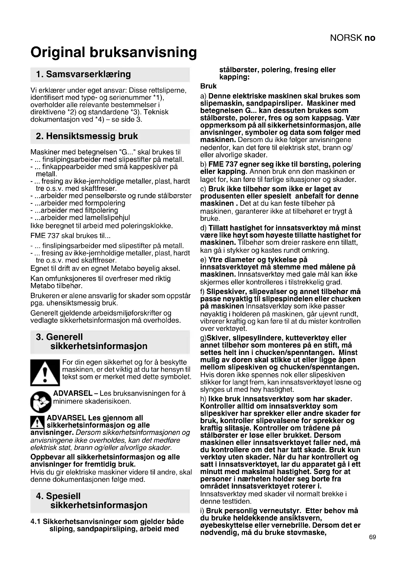 Original bruksanvisning Vi erklærer under eget ansvar: Disse rettsliperne, identifisert med type- og serienummer *1), overholder alle relevante bestemmelser i direktivene *2) og standardene *3). Teknisk dokumentasjon ved *4) – se side 3. Maskiner med betegnelsen "G..." skal brukes til - ... finslipingsarbeider med slipestifter på metall. - ... finkappearbeider med små kappeskiver på metall. - ... fresing av ikke-jernholdige metaller, plast, hardt tre o.s.v. med skaftfreser. - ...arbeider med penselbørste og runde stålbørster - ...arbeider med formpolering - ...arbeider med filtpolering - ...arbeider med lamellslipehjul Ikke beregnet til arbeid med poleringsklokke. FME 737 skal brukes til... - ... finslipingsarbeider med slipestifter på metall. - ... fresing av ikke-jernholdige metaller, plast, hardt tre o.s.v. med skaftfreser. Egnet til drift av en egnet Metabo bøyelig aksel. Kan omfunksjoneres til overfreser med riktig Metabo tilbehør. Brukeren er alene ansvarlig for skader som oppstår pga. uhensiktsmessig bruk. Generelt gjeldende arbeidsmiljøforskrifter og vedlagte sikkerhetsinformasjon må overholdes. For din egen sikkerhet og for å beskytte maskinen, er det viktig at du tar hensyn til tekst som er merket med dette symbolet. ADVARSEL – Les bruksanvisningen for å minimere skaderisikoen. ADVARSEL Les gjennom all sikkerhetsinformasjon og alle anvisninger. Dersom sikkerhetsinformasjonen og anvisningene ikke overholdes, kan det medføre elektrisk støt, brann og/eller alvorlige skader. Oppbevar all sikkerhetsinformasjon og alle anvisninger for fremtidig bruk. Hvis du gir elektriske maskiner videre til andre, skal denne dokumentasjonen følge med.