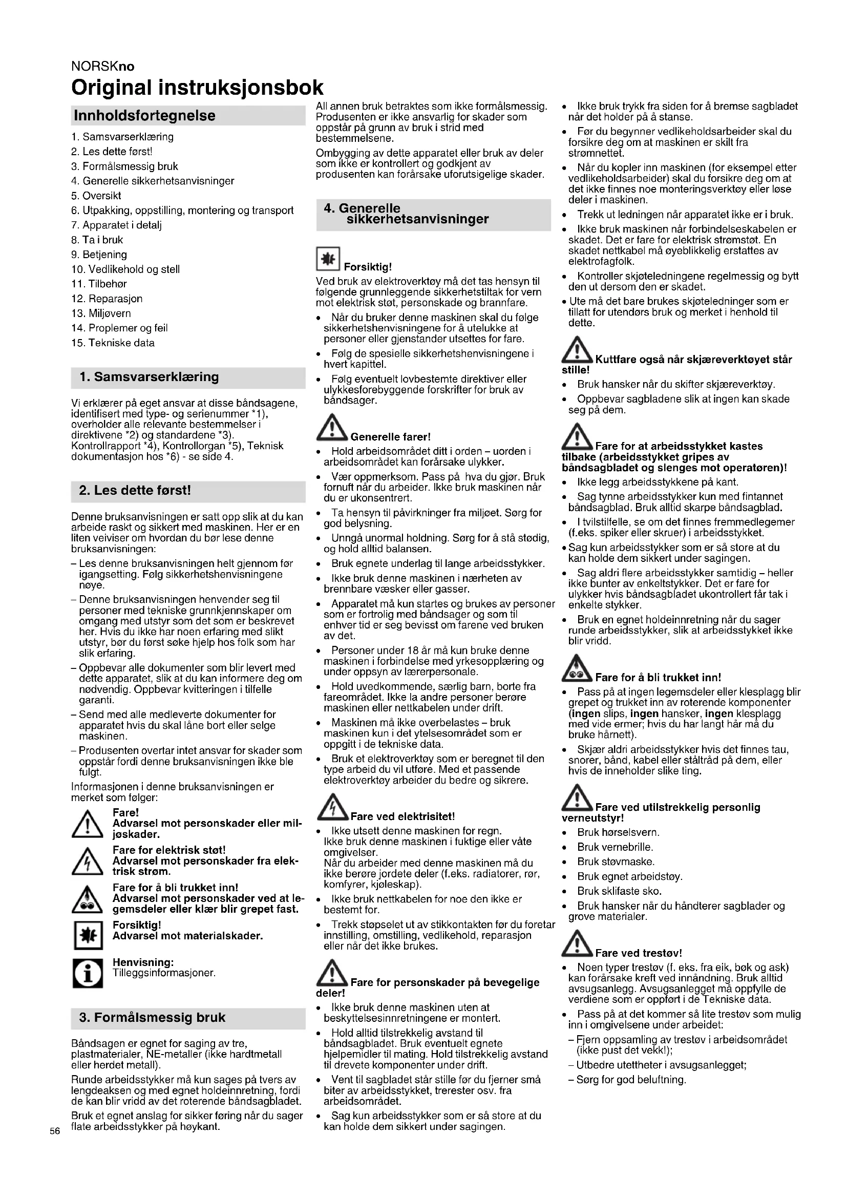 Vi erklærer på eget ansvar at disse båndsagene, identifisert med type- og serienummer *1), overholder alle relevante bestemmelser i direktivene *2) og standardene *3). Kontrollrapport *4), Kontrollorgan *5), Teknisk dokumentasjon hos *6) - se side 4. Denne bruksanvisningen er satt opp slik at du kan arbeide raskt og sikkert med maskinen. Her er en liten veiviser om hvordan du bør lese denne bruksanvisningen: – Les denne bruksanvisningen helt gjennom før igangsetting. Følg sikkerhetshenvisningene nøye. – Denne bruksanvisningen henvender seg til personer med tekniske grunnkjennskaper om omgang med utstyr som det som er beskrevet her. Hvis du ikke har noen erfaring med slikt utstyr, bør du først søke hjelp hos folk som har slik erfaring. – Oppbevar alle dokumenter som blir levert med dette apparatet, slik at du kan informere deg om nødvendig. Oppbevar kvitteringen i tilfelle garanti. – Send med alle medleverte dokumenter for apparatet hvis du skal låne bort eller selge maskinen. – Produsenten overtar intet ansvar for skader som oppstår fordi denne bruksanvisningen ikke ble fulgt. Informasjonen i denne bruksanvisningen er merket som følger: Fare! Advarsel mot personskader eller mil- jøskader. Fare for elektrisk støt! Advarsel mot personskader fra elek- trisk strøm. Fare for å bli trukket inn! Advarsel mot personskader ved at le- gemsdeler eller klær blir grepet fast. Forsiktig! Advarsel mot materialskader. Henvisning: Tilleggsinformasjoner. Båndsagen er egnet for saging av tre, plastmaterialer, NE-metaller (ikke hardtmetall eller herdet metall). Runde arbeidsstykker må kun sages på tvers av lengdeaksen og med egnet holdeinnretning, fordi de kan blir vridd av det roterende båndsagbladet. Bruk et egnet anslag for sikker føring når du sager flate arbeidsstykker på høykant. All annen bruk betraktes som ikke formålsmessig. Produsenten er ikke ansvarlig for skader som oppstår på grunn av bruk i strid med bestemmelsene. Ombygging av dette apparatet eller bruk av deler som ikke er kontrollert og godkjent av produsenten kan forårsake uforutsigelige skader. Forsiktig! Ved bruk av elektroverktøy må det tas hensyn til følgende grunnleggende sikkerhetstiltak for vern mot elektrisk støt, personskade og brannfare. Når du bruker denne maskinen skal du følge sikkerhetshenvisningene for å utelukke at personer eller gjenstander utsettes for fare. Følg de spesielle sikkerhetshenvisningene i hvert kapittel. Følg eventuelt lovbestemte direktiver eller ulykkesforebyggende forskrifter for bruk av båndsager. Generelle farer! Hold arbeidsområdet ditt i orden – uorden i arbeidsområdet kan forårsake ulykker. Vær oppmerksom. Pass på hva du gjør. Bruk fornuft når du arbeider. Ikke bruk maskinen når du er ukonsentrert. Ta hensyn til påvirkninger fra miljøet. Sørg for god belysning. Unngå unormal holdning. Sørg for å stå stødig, og hold alltid balansen. Bruk egnete underlag til lange arbeidsstykker. Ikke bruk denne maskinen i nærheten av brennbare væsker eller gasser. Apparatet må kun startes og brukes av personer som er fortrolig med båndsager og som til enhver tid er seg bevisst om farene ved bruken av det. Personer under 18 år må kun bruke denne maskinen i forbindelse med yrkesopplæring og under oppsyn av lærerpersonale. Hold uvedkommende, særlig barn, borte fra fareområdet. Ikke la andre personer berøre maskinen eller nettkabelen under drift. Maskinen må ikke overbelastes – bruk maskinen kun i det ytelsesområdet som er oppgitt i de tekniske data. Bruk et elektroverktøy som er beregnet til den type arbeid du vil utføre. Med et passende elektroverktøy arbeider du bedre og sikrere. Fare ved elektrisitet! Ikke utsett denne maskinen for regn. Ikke bruk denne maskinen i fuktige eller våte omgivelser. Når du arbeider med denne maskinen må du ikke berøre jordete deler (f.eks. radiatorer, rør, komfyrer, kjøleskap). Ikke bruk nettkabelen for noe den ikke er bestemt for. Trekk støpselet ut av stikkontakten før du foretar innstilling, omstilling, vedlikehold, reparasjon eller når det ikke brukes. Fare for personskader på bevegelige deler! Ikke bruk denne maskinen uten at beskyttelsesinnretningene er montert. Hold alltid tilstrekkelig avstand til båndsagbladet. Bruk eventuelt egnete hjelpemidler til mating. Hold tilstrekkelig avstand til drevete komponenter under drift. Vent til sagbladet står stille før du fjerner små biter av arbeidsstykket, trerester osv. fra arbeidsområdet. Sag kun arbeidsstykker som er så store at du kan holde dem sikkert under sagingen. Ikke bruk trykk fra siden for å bremse sagbladet når det holder på å stanse. Før du begynner vedlikeholdsarbeider skal du forsikre deg om at maskinen er skilt fra strømnettet. Når du kopler inn maskinen (for eksempel etter vedlikeholdsarbeider) skal du forsikre deg om at det ikke finnes noe monteringsverktøy eller løse deler i maskinen. Trekk ut ledningen når apparatet ikke er i bruk. Ikke bruk maskinen når forbindelseskabelen er skadet. Det er fare for elektrisk strømstøt. En skadet nettkabel må øyeblikkelig erstattes av elektrofagfolk. Kontroller skjøteledningene regelmessig og bytt den ut dersom den er skadet. Ute må det bare brukes skjøteledninger som er tillatt for utendørs bruk og merket i henhold til dette. Kuttfare også når skjæreverktøyet står stille! Bruk hansker når du skifter skjæreverktøy. Oppbevar sagbladene slik at ingen kan skade seg på dem. Fare for at arbeidsstykket kastes tilbake (arbeidsstykket gripes av båndsagbladet og slenges mot operatøren)! Ikke legg arbeidsstykkene på kant. Sag tynne arbeidsstykker kun med fintannet båndsagblad. Bruk alltid skarpe båndsagblad. I tvilstilfelle, se om det finnes fremmedlegemer (f.eks. spiker eller skruer) i arbeidsstykket.