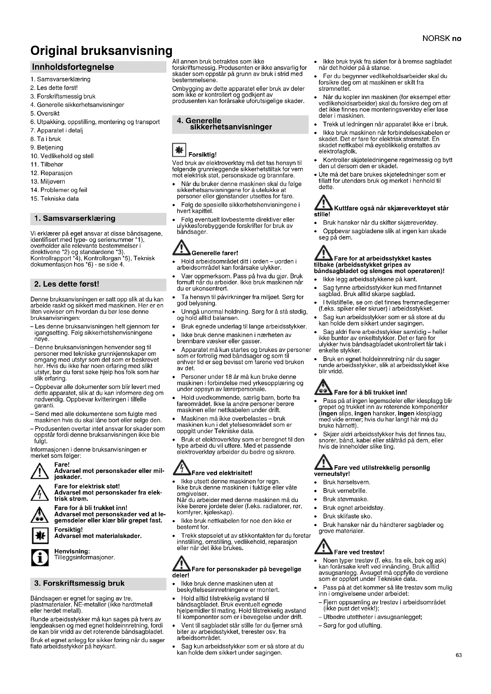 Vi erklærer på eget ansvar at disse båndsagene, identifisert med type- og serienummer *1), overholder alle relevante bestemmelser i direktivene *2) og standardene *3). Kontrollrapport *4), Kontrollorgan *5), Teknisk dokumentasjon hos *6) - se side 4. Denne bruksanvisningen er satt opp slik at du kan arbeide raskt og sikkert med maskinen. Her er en liten veiviser om hvordan du bør lese denne bruksanvisningen: – Les denne bruksanvisningen helt gjennom før igangsetting. Følg sikkerhetshenvisningene nøye. – Denne bruksanvisningen henvender seg til personer med tekniske grunnkjennskaper om omgang med utstyr som det som er beskrevet her. Hvis du ikke har noen erfaring med slikt utstyr, bør du først søke hjelp hos folk som har slik erfaring. – Oppbevar alle dokumenter som blir levert med dette apparatet, slik at du kan informere deg om nødvendig. Oppbevar kvitteringen i tilfelle garanti. – Send med alle dokumentene som fulgte med maskinen hvis du skal låne bort eller selge den. – Produsenten overtar intet ansvar for skader som oppstår fordi denne bruksanvisningen ikke ble fulgt. Informasjonen i denne bruksanvisningen er merket som følger: Fare! Advarsel mot personskader eller mil- jøskader. Fare for elektrisk støt! Advarsel mot personskader fra elek- trisk strøm. Fare for å bli trukket inn! Advarsel mot personskader ved at le- gemsdeler eller klær blir grepet fast. Forsiktig! Advarsel mot materialskader. Henvisning: Tilleggsinformasjoner. Båndsagen er egnet for saging av tre, plastmaterialer, NE-metaller (ikke hardtmetall eller herdet metall). Runde arbeidsstykker må kun sages på tvers av lengdeaksen og med egnet holdeinnretning, fordi de kan blir vridd av det roterende båndsagbladet. Bruk et egnet anlegg for sikker føring når du sager flate arbeidsstykker på høykant. All annen bruk betraktes som ikke forskriftsmessig. Produsenten er ikke ansvarlig for skader som oppstår på grunn av bruk i strid med bestemmelsene. Ombygging av dette apparatet eller bruk av deler som ikke er kontrollert og godkjent av produsenten kan forårsake uforutsigelige skader. Forsiktig! Ved bruk av elektroverktøy må det tas hensyn til følgende grunnleggende sikkerhetstiltak for vern mot elektrisk støt, personskade og brannfare. Når du bruker denne maskinen skal du følge sikkerhetsanvisningene for å utelukke at personer eller gjenstander utsettes for fare. Følg de spesielle sikkerhetshenvisningene i hvert kapittel. Følg eventuelt lovbestemte direktiver eller ulykkesforebyggende forskrifter for bruk av båndsager. Generelle farer! Hold arbeidsområdet ditt i orden – uorden i arbeidsområdet kan forårsake ulykker. Vær oppmerksom. Pass på hva du gjør. Bruk fornuft når du arbeider. Ikke bruk maskinen når du er ukonsentrert. Ta hensyn til påvirkninger fra miljøet. Sørg for god belysning. Unngå unormal holdning. Sørg for å stå stødig, og hold alltid balansen. Bruk egnede underlag til lange arbeidsstykker. Ikke bruk denne maskinen i nærheten av brennbare væsker eller gasser. Apparatet må kun startes og brukes av personer som er fortrolig med båndsager og som til enhver tid er seg bevisst om farene ved bruken av det. Personer under 18 år må kun bruke denne maskinen i forbindelse med yrkesopplæring og under oppsyn av lærerpersonale. Hold uvedkommende, særlig barn, borte fra fareområdet. Ikke la andre personer berøre maskinen eller nettkabelen under drift. Maskinen må ikke overbelastes – bruk maskinen kun i det ytelsesområdet som er oppgitt under Tekniske data. Bruk et elektroverktøy som er beregnet til den type arbeid du vil utføre. Med et passende elektroverktøy arbeider du bedre og sikrere. Fare ved elektrisitet! Ikke utsett denne maskinen for regn. Ikke bruk denne maskinen i fuktige eller våte omgivelser. Når du arbeider med denne maskinen må du ikke berøre jordete deler (f.eks. radiatorer, rør, komfyrer, kjøleskap). Ikke bruk nettkabelen for noe den ikke er bestemt for. Trekk støpselet ut av stikkontakten før du foretar innstilling, omstilling, vedlikehold, reparasjon eller når det ikke brukes. Fare for personskader på bevegelige deler! Ikke bruk denne maskinen uten at beskyttelsesinnretningene er montert. Hold alltid tilstrekkelig avstand til båndsagbladet. Bruk eventuelt egnede hjelpemidler til mating. Hold tilstrekkelig avstand til komponenter som er i bevegelse under drift. Vent til sagbladet står stille før du fjerner små biter av arbeidsstykket, trerester osv. fra arbeidsområdet. Sag kun arbeidsstykker som er så store at du kan holde dem sikkert under sagingen. Ikke bruk trykk fra siden for å bremse sagbladet når det holder på å stanse. Før du begynner vedlikeholdsarbeider skal du forsikre deg om at maskinen er skilt fra strømnettet. Når du kopler inn maskinen (for eksempel etter vedlikeholdsarbeider) skal du forsikre deg om at det ikke finnes noe monteringsverktøy eller løse deler i maskinen. Trekk ut ledningen når apparatet ikke er i bruk. Ikke bruk maskinen når forbindelseskabelen er skadet. Det er fare for elektrisk strømstøt. En skadet nettkabel må øyeblikkelig erstattes av elektrofagfolk. Kontroller skjøteledningene regelmessig og bytt den ut dersom den er skadet. Ute må det bare brukes skjøteledninger som er tillatt for utendørs bruk og merket i henhold til dette. Kuttfare også når skjæreverktøyet står stille! Bruk hansker når du skifter skjæreverktøy. Oppbevar sagbladene slik at ingen kan skade seg på dem. Fare for at arbeidsstykket kastes tilbake (arbeidsstykket gripes av båndsagbladet og slenges mot operatøren)! Ikke legg arbeidsstykkene på kant. Sag tynne arbeidsstykker kun med fintannet sagblad. Bruk alltid skarpe sagblad. I tvilstilfelle, se om det finnes fremmedlegemer (f.eks. spiker eller skruer) i arbeidsstykket. Sag kun arbeidsstykker som er så store at du kan holde dem sikkert under sagingen. Sag aldri flere arbeidsstykker samtidig – heller ikke bunter av enkeltstykker. Det