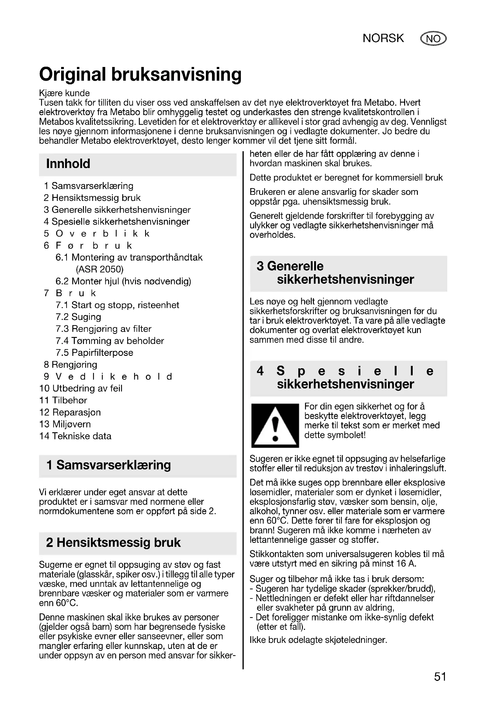 8 Rengjøring 9Vedlikehold 10 Utbedring av feil 11 Tilbehør 12 Reparasjon 13 Miljøvern 14 Tekniske data Vi erklærer under eget ansvar at dette produktet er i samsvar med normene eller normdokumentene som er oppført på side 2. Sugerne er egnet til oppsuging av støv og fast materiale (glasskår, spiker osv.) i tillegg til alle typer væske, med unntak av lettantennelige og brennbare væsker og materialer som er varmere enn 60°C. Denne maskinen skal ikke brukes av personer (gjelder også barn) som har begrensede fysiske eller psykiske evner eller sanseevner, eller som mangler erfaring eller kunnskap, uten at de er under oppsyn av en person med ansvar for sikker- heten eller de har fått opplæring av denne i hvordan maskinen skal brukes. Dette produktet er beregnet for kommersiell bruk Brukeren er alene ansvarlig for skader som oppstår pga. uhensiktsmessig bruk. Generelt gjeldende forskrifter til forebygging av ulykker og vedlagte sikkerhetshenvisninger må overholdes. Les nøye og helt gjennom vedlagte sikkerhetsforskrifter og bruksanvisningen før du tar i bruk elektroverktøyet. Ta vare på alle vedlagte dokumenter og overlat elektroverktøyet kun sammen med disse til andre. For din egen sikkerhet og for å beskytte elektroverktøyet, legg merke til tekst som er merket med dette symbolet! Sugeren er ikke egnet til oppsuging av helsefarlige stoffer eller til reduksjon av trestøv i inhaleringsluft. Det må ikke suges opp brennbare eller eksplosive løsemidler, materialer som er dynket i løsemidler, eksplosjonsfarlig støv, væsker som bensin, olje, alkohol, tynner osv. eller materiale som er varmere enn 60°C. Dette fører til fare for eksplosjon og brann! Sugeren må ikke komme i nærheten av lettantennelige gasser og stoffer. Stikkontakten som universalsugeren kobles til må være utstyrt med en sikring på minst 16 A. Suger og tilbehør må ikke tas i bruk dersom: - Sugeren har tydelige skader (sprekker/brudd), - Nettledningen er defekt eller har riftdannelser eller svakheter på grunn av aldring, - Det foreligger mistanke om ikke-synlig defekt (etter et fall). Ikke bruk ødelagte skjøteledninger. Original bruksanvisning Kjære kunde Tusen takk for tilliten du viser oss ved anskaffelsen av det nye elektroverktøyet fra Metabo. Hvert elektroverktøy fra Metabo blir omhyggelig testet og underkastes den strenge kvalitetskontrollen i Metabos kvalitetssikring. Levetiden for et elektroverktøy er allikevel i stor grad avhengig av deg. Vennligst les nøye gjennom informasjonene i denne bruksanvisningen og i vedlagte dokumenter. Jo bedre du behandler Metabo elektroverktøyet, desto lenger kommer vil det tjene sitt formål. Innhold 1 Samsvarserklæring 2 Hensiktsmessig bruk 3 Generelle sikkerhetshenvisninger 4Spesielle sikkerhetshenvisninger 17026696_0810 ASR 2025 und ASR 2050.book Seite 51 Mittwoch, 18. August 2010 5:10 1752 NORSK