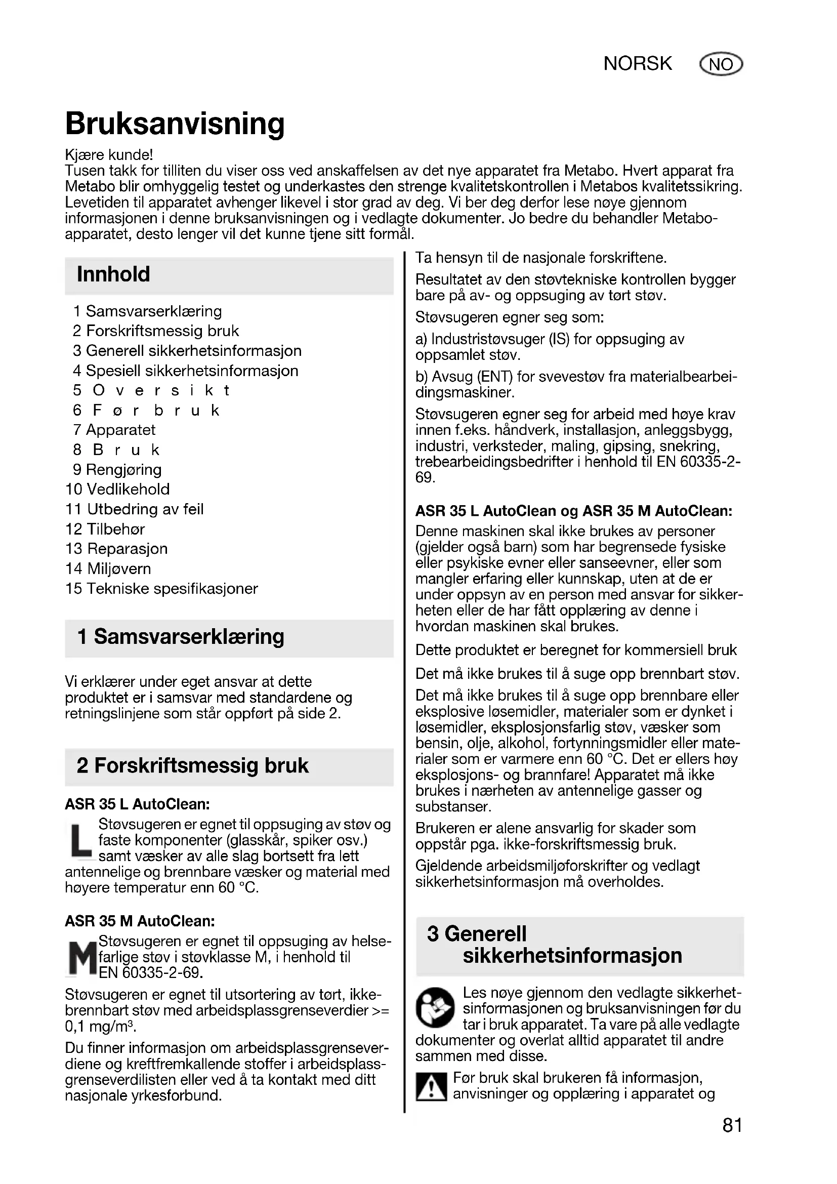 1 Samsvarserklæring 2 Forskriftsmessig bruk 3 Generell sikkerhetsinformasjon 4 Spesiell sikkerhetsinformasjon 5Oversikt 6Før bruk 7 Apparatet 8Bruk 9 Rengjøring 10 Vedlikehold 11 Utbedring av feil 12 Tilbehør 13 Reparasjon 14 Miljøvern 15 Tekniske spesifikasjoner Vi erklærer under eget ansvar at dette produktet er i samsvar med standardene og retningslinjene som står oppført på side 2. ASR 35 L AutoClean: Støvsugeren er egnet til oppsuging av støv og faste komponenter (glasskår, spiker osv.) samt væsker av alle slag bortsett fra lett antennelige og brennbare væsker og material med høyere temperatur enn 60 °C. ASR 35 M AutoClean: Støvsugeren er egnet til oppsuging av helse- farlige støv i støvklasse M, i henhold til EN 60335-2-69. Støvsugeren er egnet til utsortering av tørt, ikke- brennbart støv med arbeidsplassgrenseverdier >= 0,1 mg/m³. Du finner informasjon om arbeidsplassgrensever- diene og kreftfremkallende stoffer i arbeidsplass- grenseverdilisten eller ved å ta kontakt med ditt nasjonale yrkesforbund. Ta hensyn til de nasjonale forskriftene. Resultatet av den støvtekniske kontrollen bygger bare på av- og oppsuging av tørt støv. Støvsugeren egner seg som: a) Industristøvsuger (IS) for oppsuging av oppsamlet støv. b) Avsug (ENT) for svevestøv fra materialbearbei- dingsmaskiner. Støvsugeren egner seg for arbeid med høye krav innen f.eks. håndverk, installasjon, anleggsbygg, industri, verksteder, maling, gipsing, snekring, trebearbeidingsbedrifter i henhold til EN 60335-2-