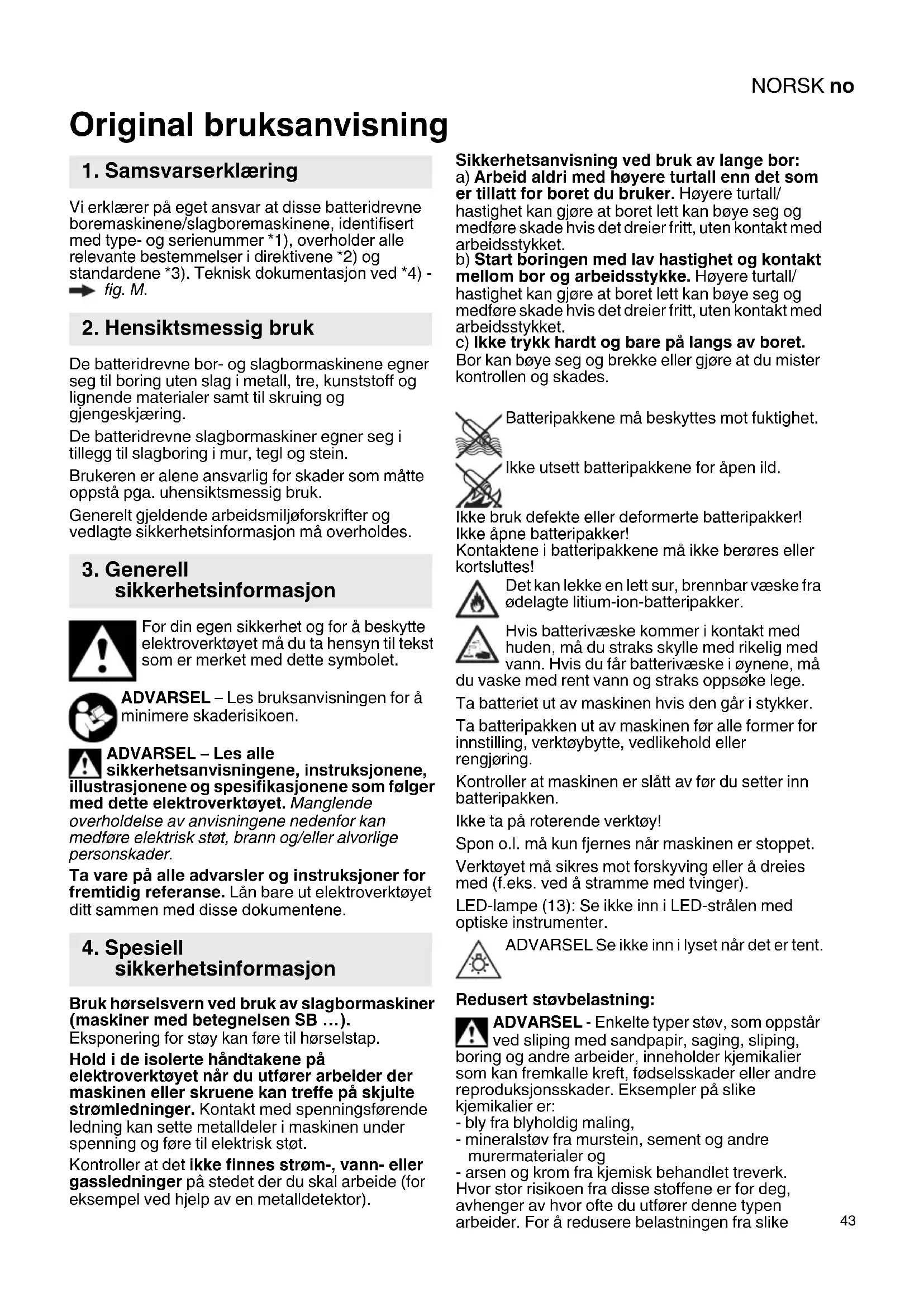 Vi erklærer på eget ansvar at disse batteridrevne boremaskinene/slagboremaskinene, identifisert med type- og serienummer *1), overholder alle relevante bestemmelser i direktivene *2) og standardene *3). Teknisk dokumentasjon ved *4) - fig. M. De batteridrevne bor- og slagbormaskinene egner seg til boring uten slag i metall, tre, kunststoff og lignende materialer samt til skruing og gjengeskjæring. De batteridrevne slagbormaskiner egner seg i tillegg til slagboring i mur, tegl og stein. Brukeren er alene ansvarlig for skader som måtte oppstå pga. uhensiktsmessig bruk. Generelt gjeldende arbeidsmiljøforskrifter og vedlagte sikkerhetsinformasjon må overholdes. For din egen sikkerhet og for å beskytte elektroverktøyet må du ta hensyn til tekst som er merket med dette symbolet. ADVARSEL – Les bruksanvisningen for å minimere skaderisikoen. ADVARSEL – Les alle sikkerhetsanvisningene, instruksjonene, illustrasjonene og spesifikasjonene som følger med dette elektroverktøyet. Manglende overholdelse av anvisningene nedenfor kan medføre elektrisk støt, brann og/eller alvorlige personskader. Ta vare på alle advarsler og instruksjoner for fremtidig referanse. Lån bare ut elektroverktøyet ditt sammen med disse dokumentene. Bruk hørselsvern ved bruk av slagbormaskiner (maskiner med betegnelsen SB …). Eksponering for støy kan føre til hørselstap. Hold i de isolerte håndtakene på elektroverktøyet når du utfører arbeider der maskinen eller skruene kan treffe på skjulte strømledninger. Kontakt med spenningsførende ledning kan sette metalldeler i maskinen under spenning og føre til elektrisk støt. Kontroller at det ikke finnes strøm-, vann- eller gassledninger på stedet der du skal arbeide (for eksempel ved hjelp av en metalldetektor). Sikkerhetsanvisning ved bruk av lange bor: a) Arbeid aldri med høyere turtall enn det som er tillatt for boret du bruker. Høyere turtall/ hastighet kan gjøre at boret lett kan bøye seg og medføre skade hvis det dreier fritt, uten kontakt med arbeidsstykket. b) Start boringen med lav hastighet og kontakt mellom bor og arbeidsstykke. Høyere turtall/ hastighet kan gjøre at boret lett kan bøye seg og medføre skade hvis det dreier fritt, uten kontakt med arbeidsstykket. c) Ikke trykk hardt og bare på langs av boret. Bor kan bøye seg og brekke eller gjøre at du mister kontrollen og skades. Batteripakkene må beskyttes mot fuktighet. Ikke utsett batteripakkene for åpen ild. Ikke bruk defekte eller deformerte batteripakker! Ikke åpne batteripakker! Kontaktene i batteripakkene må ikke berøres eller kortsluttes! Det kan lekke en lett sur, brennbar væske fra ødelagte litium-ion-batteripakker. Hvis batterivæske kommer i kontakt med huden, må du straks skylle med rikelig med vann. Hvis du får batterivæske i øynene, må du vaske med rent vann og straks oppsøke lege. Ta batteriet ut av maskinen hvis den går i stykker. Ta batteripakken ut av maskinen før alle former for innstilling, verktøybytte, vedlikehold eller rengjøring. Kontroller at maskinen er slått av før du setter inn batteripakken. Ikke ta på roterende verktøy! Spon o.l. må kun fjernes når maskinen er stoppet. Verktøyet må sikres mot forskyving eller å dreies med (f.eks. ved å stramme med tvinger). LED-lampe (13): Se ikke inn i LED-strålen med optiske instrumenter. ADVARSEL Se ikke inn i lyset når det er tent. Redusert støvbelastning: ADVARSEL - Enkelte typer støv, som oppstår ved sliping med sandpapir, saging, sliping, boring og andre arbeider, inneholder kjemikalier som kan fremkalle kreft, fødselsskader eller andre reproduksjonsskader. Eksempler på slike kjemikalier er: - bly fra blyholdig maling, - mineralstøv fra murstein, sement og andre murermaterialer og - arsen og krom fra kjemisk behandlet treverk. Hvor stor risikoen fra disse stoffene er for deg, avhenger av hvor ofte du utfører denne typen arbeider. For å redusere belastningen fra slike Original bruksanvisning