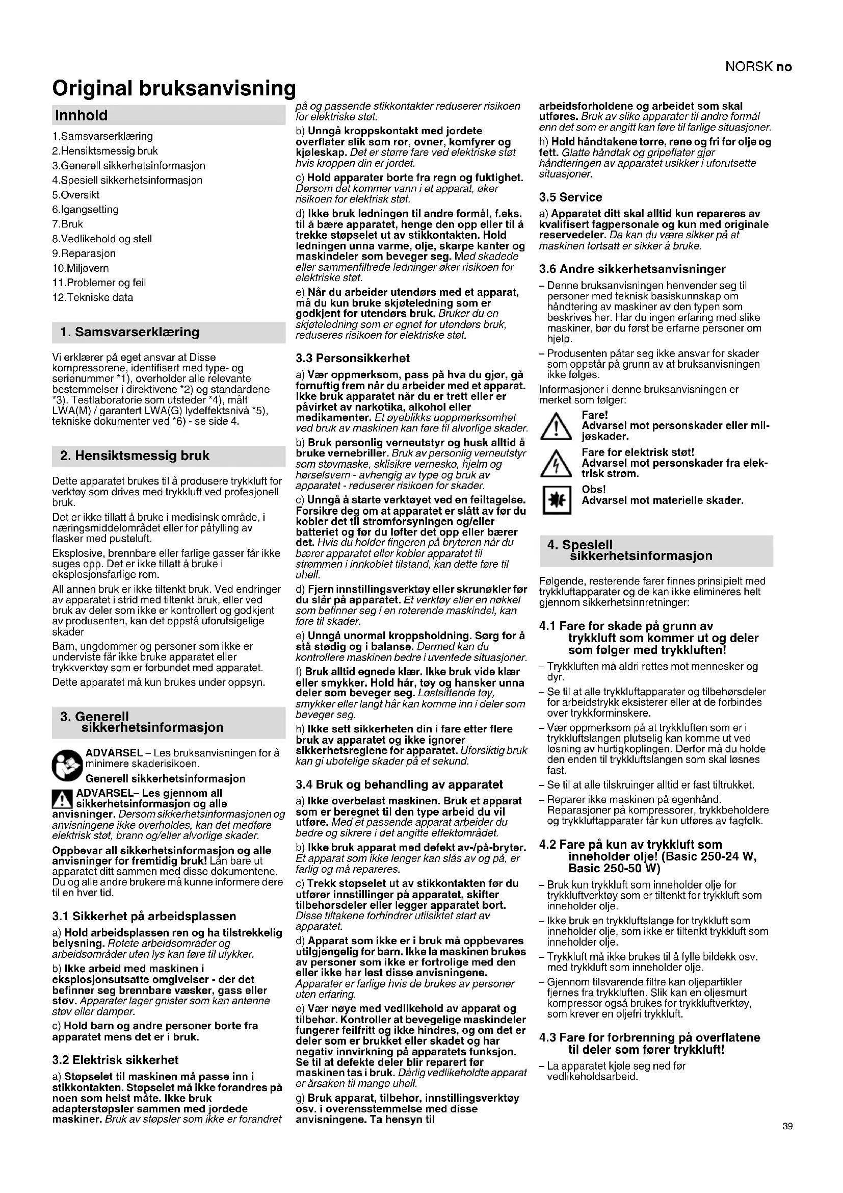 Original bruksanvisning 1.Samsvarserklæring 2.Hensiktsmessig bruk 3.Generell sikkerhetsinformasjon 4.Spesiell sikkerhetsinformasjon 5.Oversikt 6.Igangsetting 7.Bruk 8.Vedlikehold og stell 9.Reparasjon 10.Miljøvern 11.Problemer og feil 12.Tekniske data Vi erklærer på eget ansvar at Disse kompressorene, identifisert med type- og serienummer *1), overholder alle relevante bestemmelser i direktivene *2) og standardene *3). Testlaboratorie som utsteder *4), målt LWA(M) / garantert LWA(G) lydeffektsnivå *5), tekniske dokumenter ved *6) - se side 4. Dette apparatet brukes til å produsere trykkluft for verktøy som drives med trykkluft ved profesjonell bruk. Det er ikke tillatt å bruke i medisinsk område, i næringsmiddelområdet eller for påfylling av flasker med pusteluft. Eksplosive, brennbare eller farlige gasser får ikke suges opp. Det er ikke tillatt å bruke i eksplosjonsfarlige rom. All annen bruk er ikke tiltenkt bruk. Ved endringer av apparatet i strid med tiltenkt bruk, eller ved bruk av deler som ikke er kontrollert og godkjent av produsenten, kan det oppstå uforutsigelige skader Barn, ungdommer og personer som ikke er underviste får ikke bruke apparatet eller trykkverktøy som er forbundet med apparatet. Dette apparatet må kun brukes under oppsyn. ADVARSEL – Les bruksanvisningen for å minimere skaderisikoen. Generell sikkerhetsinformasjon ADVARSEL– Les gjennom all sikkerhetsinformasjon og alle anvisninger. Dersom sikkerhetsinformasjonen og anvisningene ikke overholdes, kan det medføre elektrisk støt, brann og/eller alvorlige skader. Oppbevar all sikkerhetsinformasjon og alle anvisninger for fremtidig bruk! Lån bare ut apparatet ditt sammen med disse dokumentene. Du og alle andre brukere må kunne informere dere til en hver tid.