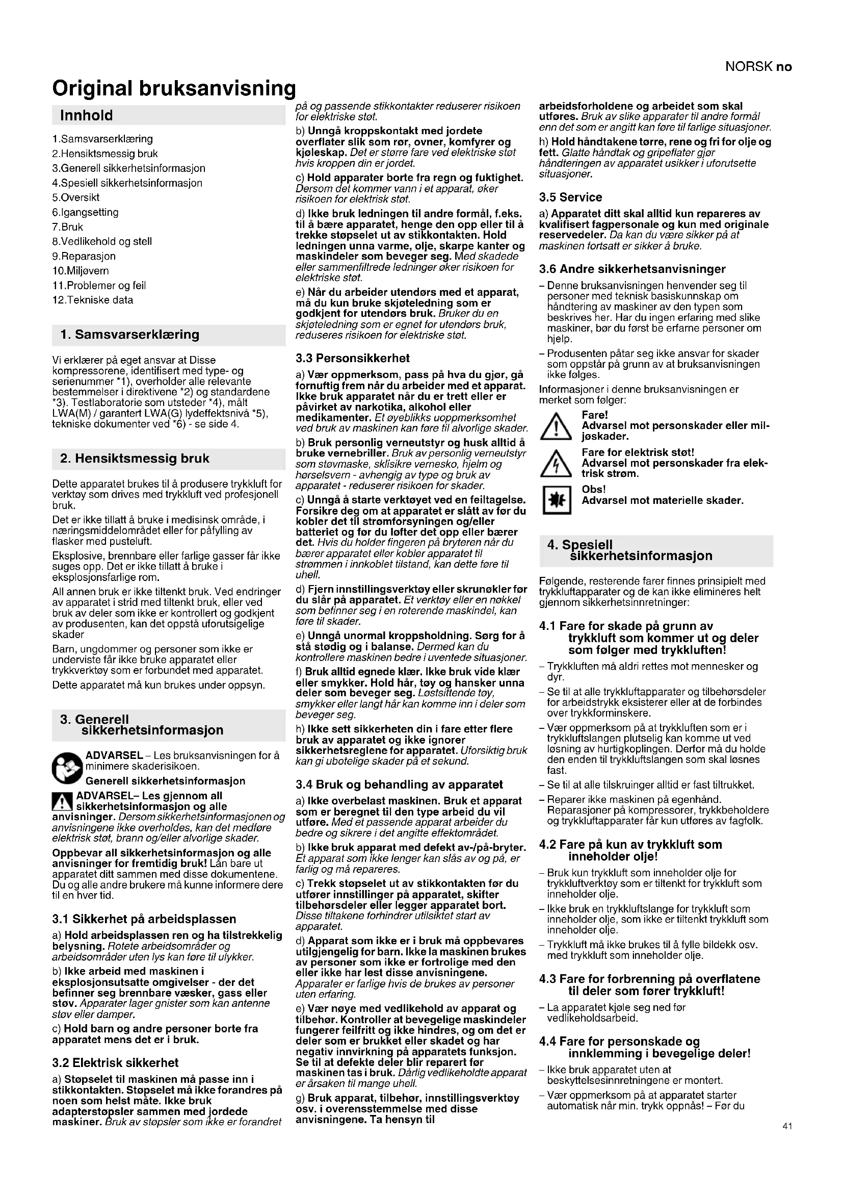 Original bruksanvisning 1.Samsvarserklæring 2.Hensiktsmessig bruk 3.Generell sikkerhetsinformasjon 4.Spesiell sikkerhetsinformasjon 5.Oversikt 6.Igangsetting 7.Bruk 8.Vedlikehold og stell 9.Reparasjon 10.Miljøvern 11.Problemer og feil 12.Tekniske data Vi erklærer på eget ansvar at Disse kompressorene, identifisert med type- og serienummer *1), overholder alle relevante bestemmelser i direktivene *2) og standardene *3). Testlaboratorie som utsteder *4), målt LWA(M) / garantert LWA(G) lydeffektsnivå *5), tekniske dokumenter ved *6) - se side 4. Dette apparatet brukes til å produsere trykkluft for verktøy som drives med trykkluft ved profesjonell bruk. Det er ikke tillatt å bruke i medisinsk område, i næringsmiddelområdet eller for påfylling av flasker med pusteluft. Eksplosive, brennbare eller farlige gasser får ikke suges opp. Det er ikke tillatt å bruke i eksplosjonsfarlige rom. All annen bruk er ikke tiltenkt bruk. Ved endringer av apparatet i strid med tiltenkt bruk, eller ved bruk av deler som ikke er kontrollert og godkjent av produsenten, kan det oppstå uforutsigelige skader Barn, ungdommer og personer som ikke er underviste får ikke bruke apparatet eller trykkverktøy som er forbundet med apparatet. Dette apparatet må kun brukes under oppsyn. ADVARSEL – Les bruksanvisningen for å minimere skaderisikoen. Generell sikkerhetsinformasjon ADVARSEL– Les gjennom all sikkerhetsinformasjon og alle anvisninger. Dersom sikkerhetsinformasjonen og anvisningene ikke overholdes, kan det medføre elektrisk støt, brann og/eller alvorlige skader. Oppbevar all sikkerhetsinformasjon og alle anvisninger for fremtidig bruk! Lån bare ut apparatet ditt sammen med disse dokumentene. Du og alle andre brukere må kunne informere dere til en hver tid.