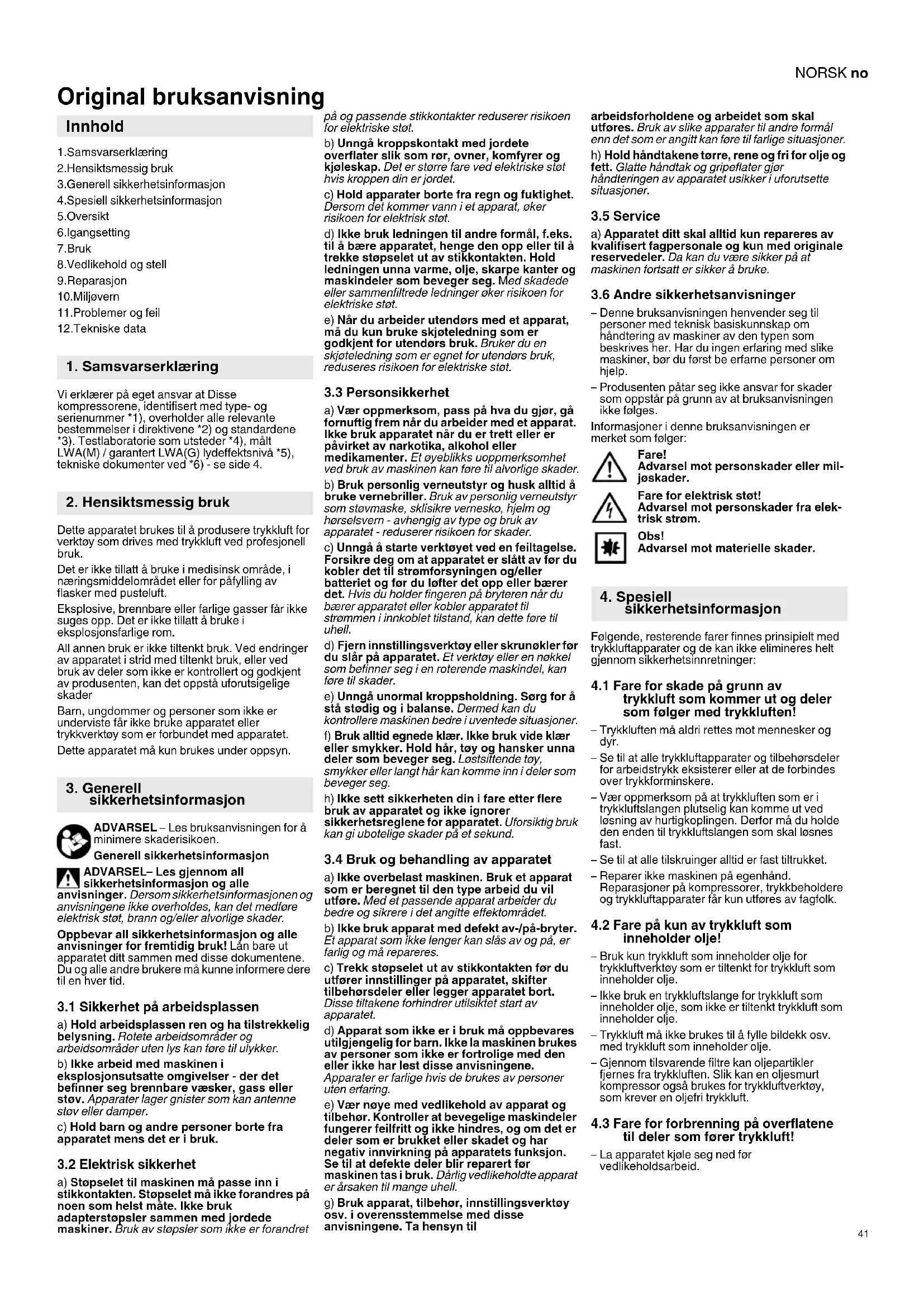 Original bruksanvisning 1.Samsvarserklæring 2.Hensiktsmessig bruk 3.Generell sikkerhetsinformasjon 4.Spesiell sikkerhetsinformasjon 5.Oversikt 6.Igangsetting 7.Bruk 8.Vedlikehold og stell 9.Reparasjon 10.Miljøvern 11.Problemer og feil 12.Tekniske data Vi erklærer på eget ansvar at Disse kompressorene, identifisert med type- og serienummer *1), overholder alle relevante bestemmelser i direktivene *2) og standardene *3). Testlaboratorie som utsteder *4), målt LWA(M) / garantert LWA(G) lydeffektsnivå *5), tekniske dokumenter ved *6) - se side 4. Dette apparatet brukes til å produsere trykkluft for verktøy som drives med trykkluft ved profesjonell bruk. Det er ikke tillatt å bruke i medisinsk område, i næringsmiddelområdet eller for påfylling av flasker med pusteluft. Eksplosive, brennbare eller farlige gasser får ikke suges opp. Det er ikke tillatt å bruke i eksplosjonsfarlige rom. All annen bruk er ikke tiltenkt bruk. Ved endringer av apparatet i strid med tiltenkt bruk, eller ved bruk av deler som ikke er kontrollert og godkjent av produsenten, kan det oppstå uforutsigelige skader Barn, ungdommer og personer som ikke er underviste får ikke bruke apparatet eller trykkverktøy som er forbundet med apparatet. Dette apparatet må kun brukes under oppsyn. ADVARSEL – Les bruksanvisningen for å minimere skaderisikoen. Generell sikkerhetsinformasjon ADVARSEL– Les gjennom all sikkerhetsinformasjon og alle anvisninger. Dersom sikkerhetsinformasjonen og anvisningene ikke overholdes, kan det medføre elektrisk støt, brann og/eller alvorlige skader. Oppbevar all sikkerhetsinformasjon og alle anvisninger for fremtidig bruk! Lån bare ut apparatet ditt sammen med disse dokumentene. Du og alle andre brukere må kunne informere dere til en hver tid.