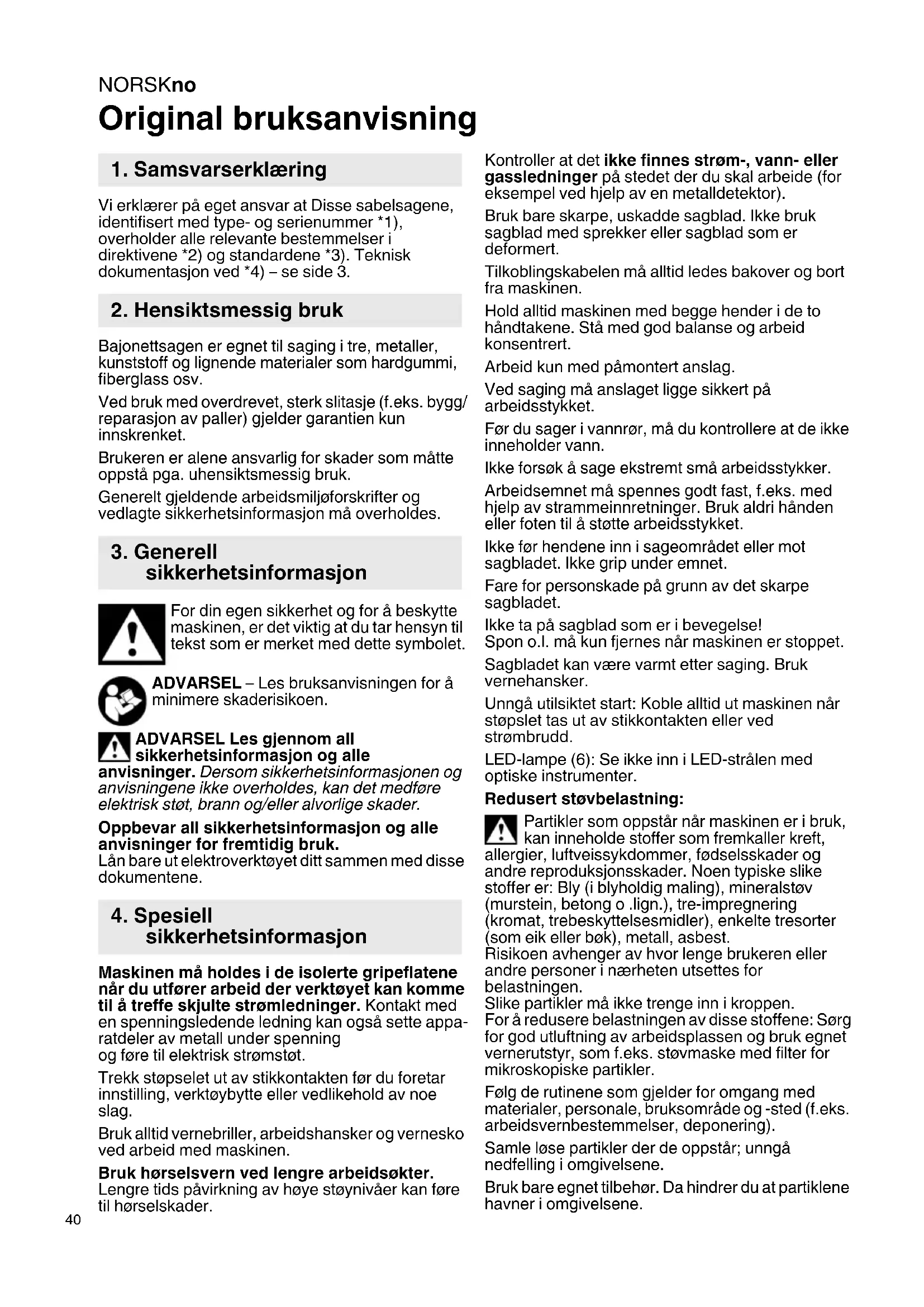 Original bruksanvisning Vi erklærer på eget ansvar at Disse sabelsagene, identifisert med type- og serienummer *1), overholder alle relevante bestemmelser i direktivene *2) og standardene *3). Teknisk dokumentasjon ved *4) – se side 3. Bajonettsagen er egnet til saging i tre, metaller, kunststoff og lignende materialer som hardgummi, fiberglass osv. Ved bruk med overdrevet, sterk slitasje (f.eks. bygg/ reparasjon av paller) gjelder garantien kun innskrenket. Brukeren er alene ansvarlig for skader som måtte oppstå pga. uhensiktsmessig bruk. Generelt gjeldende arbeidsmiljøforskrifter og vedlagte sikkerhetsinformasjon må overholdes. For din egen sikkerhet og for å beskytte maskinen, er det viktig at du tar hensyn til tekst som er merket med dette symbolet. ADVARSEL – Les bruksanvisningen for å minimere skaderisikoen. ADVARSEL Les gjennom all sikkerhetsinformasjon og alle anvisninger. Dersom sikkerhetsinformasjonen og anvisningene ikke overholdes, kan det medføre elektrisk støt, brann og/eller alvorlige skader. Oppbevar all sikkerhetsinformasjon og alle anvisninger for fremtidig bruk. Lån bare ut elektroverktøyet ditt sammen med disse dokumentene. Maskinen må holdes i de isolerte gripeflatene når du utfører arbeid der verktøyet kan komme til å treffe skjulte strømledninger. Kontakt med en spenningsledende ledning kan også sette appa- ratdeler av metall under spenning og føre til elektrisk strømstøt. Trekk støpselet ut av stikkontakten før du foretar innstilling, verktøybytte eller vedlikehold av noe slag. Bruk alltid vernebriller, arbeidshansker og vernesko ved arbeid med maskinen. Bruk hørselsvern ved lengre arbeidsøkter. Lengre tids påvirkning av høye støynivåer kan føre til hørselskader. Kontroller at det ikke finnes strøm-, vann- eller gassledninger på stedet der du skal arbeide (for eksempel ved hjelp av en metalldetektor). Bruk bare skarpe, uskadde sagblad. Ikke bruk sagblad med sprekker eller sagblad som er deformert. Tilkoblingskabelen må alltid ledes bakover og bort fra maskinen. Hold alltid maskinen med begge hender i de to håndtakene. Stå med god balanse og arbeid konsentrert. Arbeid kun med påmontert anslag. Ved saging må anslaget ligge sikkert på arbeidsstykket. Før du sager i vannrør, må du kontrollere at de ikke inneholder vann. Ikke forsøk å sage ekstremt små arbeidsstykker. Arbeidsemnet må spennes godt fast, f.eks. med hjelp av strammeinnretninger. Bruk aldri hånden eller foten til å støtte arbeidsstykket. Ikke før hendene inn i sageområdet eller mot sagbladet. Ikke grip under emnet. Fare for personskade på grunn av det skarpe sagbladet. Ikke ta på sagblad som er i bevegelse! Spon o.l. må kun fjernes når maskinen er stoppet. Sagbladet kan være varmt etter saging. Bruk vernehansker. Unngå utilsiktet start: Koble alltid ut maskinen når støpslet tas ut av stikkontakten eller ved strømbrudd. LED-lampe (6): Se ikke inn i LED-strålen med optiske instrumenter. Redusert støvbelastning: Partikler som oppstår når maskinen er i bruk, kan inneholde stoffer som fremkaller kreft, allergier, luftveissykdommer, fødselsskader og andre reproduksjonsskader. Noen typiske slike stoffer er: Bly (i blyholdig maling), mineralstøv (murstein, betong o .lign.), tre-impregnering (kromat, trebeskyttelsesmidler), enkelte tresorter (som eik eller bøk), metall, asbest. Risikoen avhenger av hvor lenge brukeren eller andre personer i nærheten utsettes for belastningen. Slike partikler må ikke trenge inn i kroppen. For å redusere belastningen av disse stoffene: Sørg for god utluftning av arbeidsplassen og bruk egnet vernerutstyr, som f.eks. støvmaske med filter for mikroskopiske partikler. Følg de rutinene som gjelder for omgang med materialer, personale, bruksområde og -sted (f.eks. arbeidsvernbestemmelser, deponering). Samle løse partikler der de oppstår; unngå nedfelling i omgivelsene. Bruk bare egnet tilbehør. Da hindrer du at partiklene havner i omgivelsene.