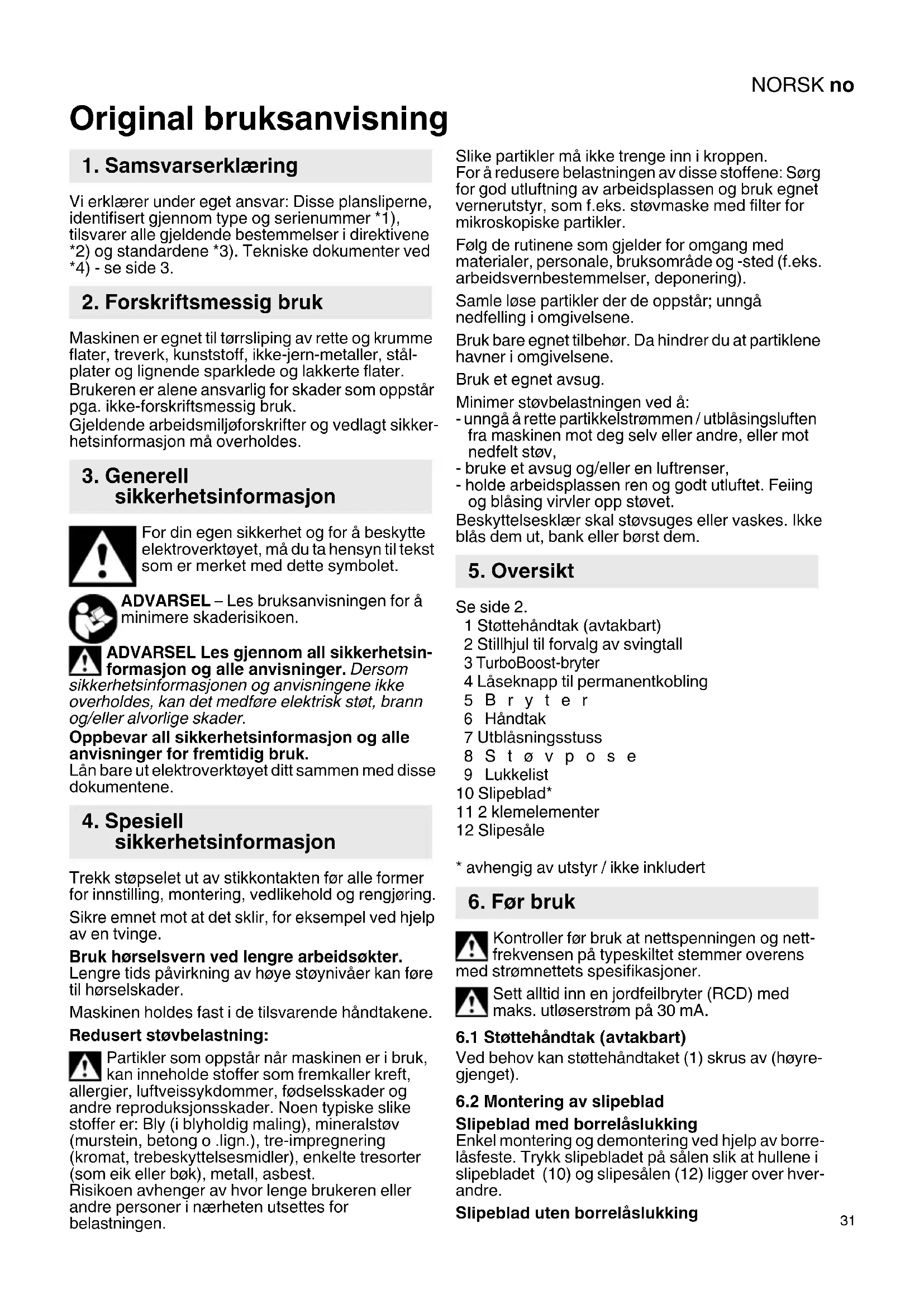 Original bruksanvisning Vi erklærer under eget ansvar: Disse plansliperne, identifisert gjennom type og serienummer *1), tilsvarer alle gjeldende bestemmelser i direktivene *2) og standardene *3). Tekniske dokumenter ved *4) - se side 3. Maskinen er egnet til tørrsliping av rette og krumme flater, treverk, kunststoff, ikke-jern-metaller, stål- plater og lignende sparklede og lakkerte flater. Brukeren er alene ansvarlig for skader som oppstår pga. ikke-forskriftsmessig bruk. Gjeldende arbeidsmiljøforskrifter og vedlagt sikker- hetsinformasjon må overholdes. For din egen sikkerhet og for å beskytte elektroverktøyet, må du ta hensyn til tekst som er merket med dette symbolet. ADVARSEL – Les bruksanvisningen for å minimere skaderisikoen. ADVARSEL Les gjennom all sikkerhetsin- formasjon og alle anvisninger. Dersom sikkerhetsinformasjonen og anvisningene ikke overholdes, kan det medføre elektrisk støt, brann og/eller alvorlige skader. Oppbevar all sikkerhetsinformasjon og alle anvisninger for fremtidig bruk. Lån bare ut elektroverktøyet ditt sammen med disse dokumentene. Trekk støpselet ut av stikkontakten før alle former for innstilling, montering, vedlikehold og rengjøring. Sikre emnet mot at det sklir, for eksempel ved hjelp av en tvinge. Bruk hørselsvern ved lengre arbeidsøkter. Lengre tids påvirkning av høye støynivåer kan føre til hørselskader. Maskinen holdes fast i de tilsvarende håndtakene. Redusert støvbelastning: Partikler som oppstår når maskinen er i bruk, kan inneholde stoffer som fremkaller kreft, allergier, luftveissykdommer, fødselsskader og andre reproduksjonsskader. Noen typiske slike stoffer er: Bly (i blyholdig maling), mineralstøv (murstein, betong o .lign.), tre-impregnering (kromat, trebeskyttelsesmidler), enkelte tresorter (som eik eller bøk), metall, asbest. Risikoen avhenger av hvor lenge brukeren eller andre personer i nærheten utsettes for belastningen. Slike partikler må ikke trenge inn i kroppen. For å redusere belastningen av disse stoffene: Sørg for god utluftning av arbeidsplassen og bruk egnet vernerutstyr, som f.eks. støvmaske med filter for mikroskopiske partikler. Følg de rutinene som gjelder for omgang med materialer, personale, bruksområde og -sted (f.eks. arbeidsvernbestemmelser, deponering). Samle løse partikler der de oppstår; unngå nedfelling i omgivelsene. Bruk bare egnet tilbehør. Da hindrer du at partiklene havner i omgivelsene. Bruk et egnet avsug. Minimer støvbelastningen ved å: - unngå å rette partikkelstrømmen / utblåsingsluften fra maskinen mot deg selv eller andre, eller mot nedfelt støv, - bruke et avsug og/eller en luftrenser, - holde arbeidsplassen ren og godt utluftet. Feiing og blåsing virvler opp støvet. Beskyttelsesklær skal støvsuges eller vaskes. Ikke blås dem ut, bank eller børst dem. Se side 2. 1 Støttehåndtak (avtakbart) 2 Stillhjul til forvalg av svingtall 3 TurboBoost-bryter 4 Låseknapp til permanentkobling 5Bryter