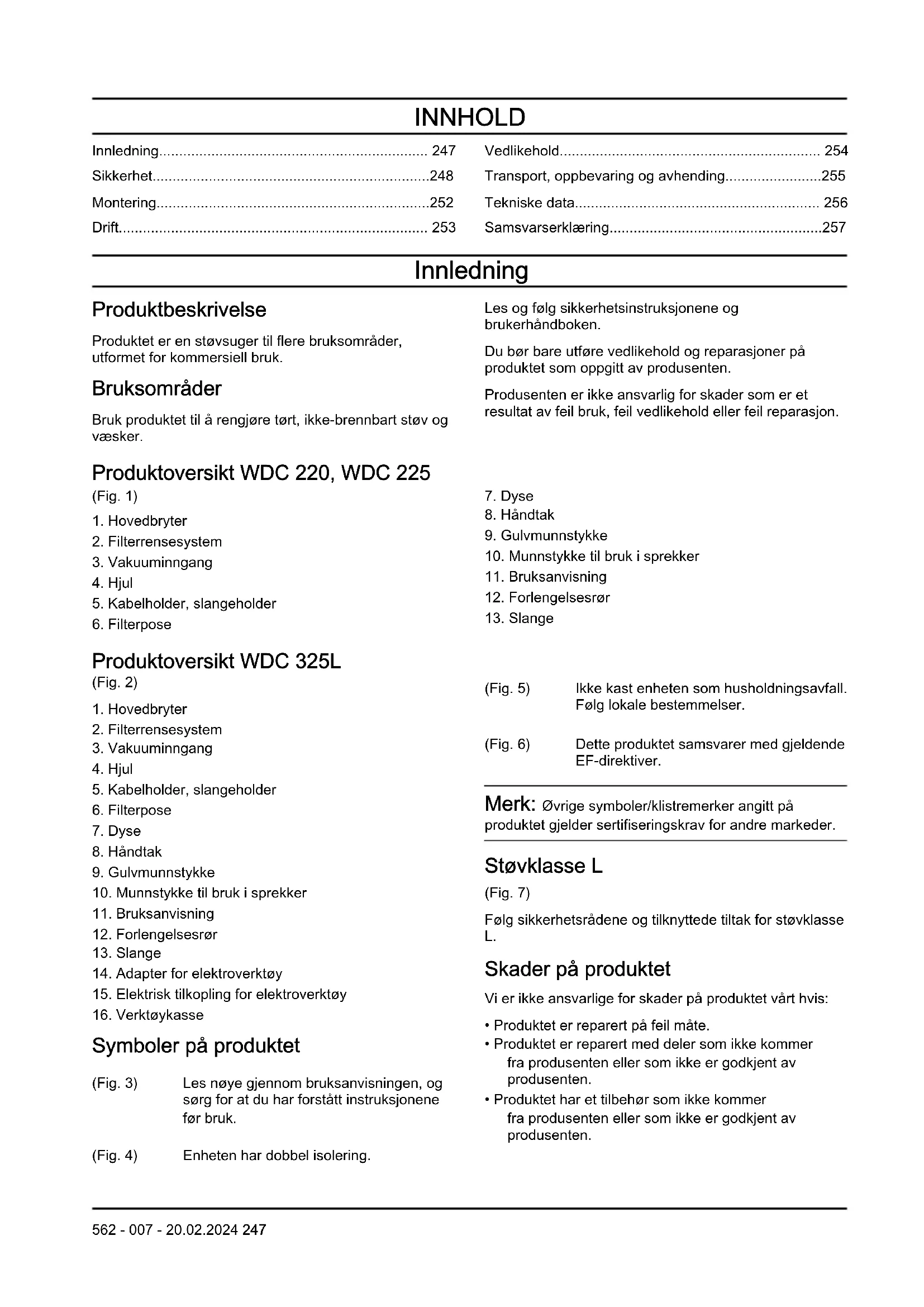 - Samsvarserklæring Innledning Produktbeskrivelse Produktet er en støvsuger til flere bruksområder, utformet for kommersiell bruk. Bruksområder Bruk produktet til å rengjøre tørt, ikke-brennbart støv og væsker. Les og følg sikkerhetsinstruksjonene og brukerhåndboken. Du bør bare utføre vedlikehold og reparasjoner på produktet som oppgitt av produsenten. Produsenten er ikke ansvarlig for skader som er et resultat av feil bruk, feil vedlikehold eller feil reparasjon. Produktoversikt WDC 220, WDC 225 (Fig. 1) p. 257