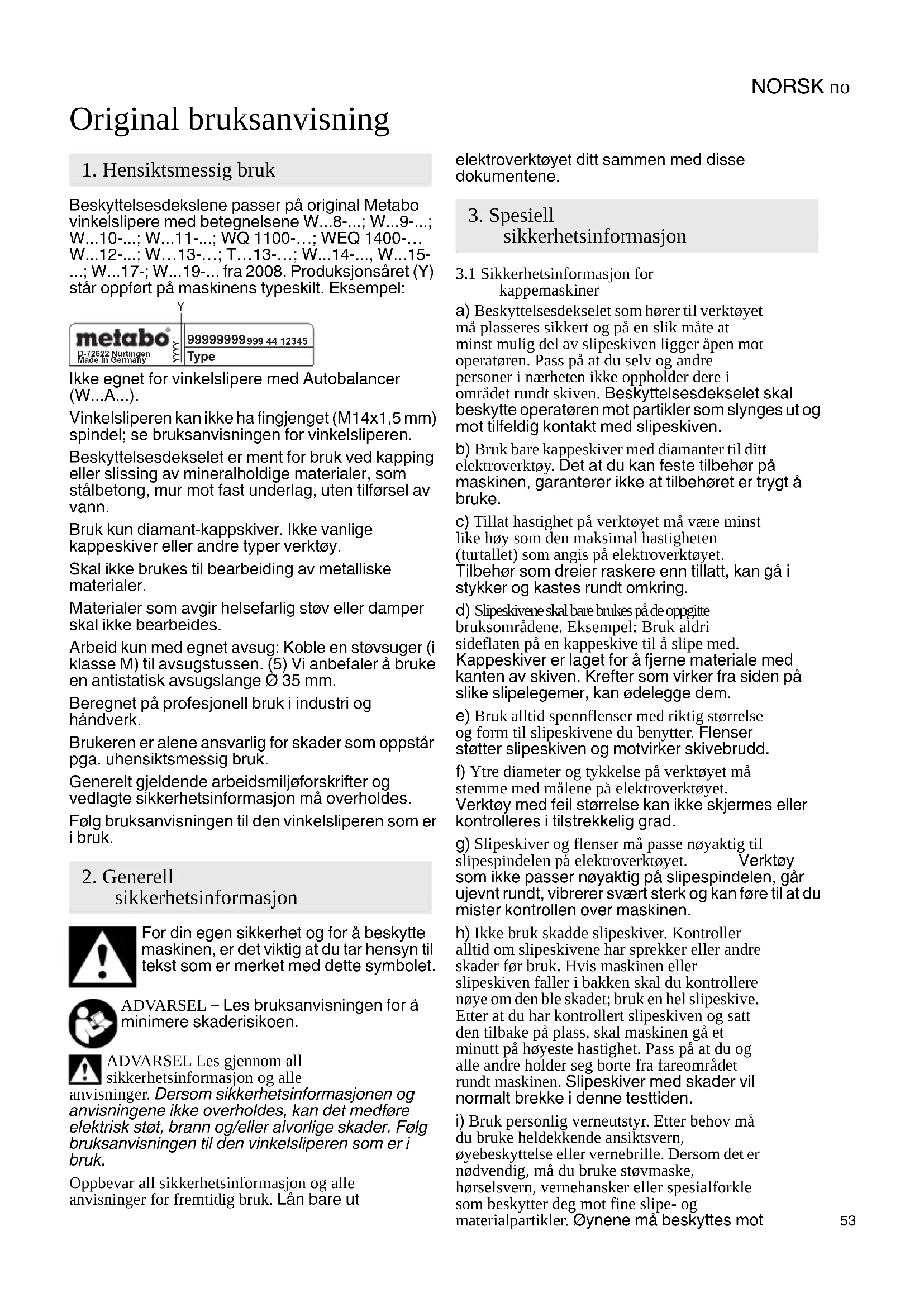 - -; W - fra 2008. Produksjonsåret (Y) står oppført på maskinens typeskilt. Eksempel: Ikke egnet for vinkelslipere med Autobalancer (W A ). Vinkelsliperen kan ikke ha fingjenget (M14x1,5 mm) spindel; se bruksanvisningen for vinkelsliperen. Beskyttelsesdekselet er ment for bruk ved kapping eller slissing av mineralholdige materialer, som stålbetong, mur mot fast underlag, uten tilførsel av vann. Bruk kun diamant-kappskiver. Ikke vanlige kappeskiver eller andre typer verktøy. Skal ikke brukes til bearbeiding av metalliske materialer. Materialer som avgir helsefarlig støv eller damper skal ikke bearbeides. Arbeid kun med egnet avsug: Koble en støvsuger (i klasse M) til avsugstussen. (5) Vi anbefaler å bruke en antistatisk avsugslange Ø 35 mm. Beregnet på profesjonell bruk i industri og håndverk. Brukeren er alene ansvarlig for skader som oppstår pga. uhensiktsmessig bruk. Generelt gjeldende arbeidsmiljøforskrifter og vedlagte sikkerhetsinformasjon må overholdes. Følg bruksanvisningen til den vinkelsliperen som er i bruk. For din egen sikkerhet og for å beskytte maskinen, er det viktig at du tar hensyn til tekst som er merket med dette symbolet. ADVARSEL – Les bruksanvisningen for å minimere skaderisikoen. ADVARSEL Les gjennom all sikkerhetsinformasjon og alle anvisninger. Dersom sikkerhetsinformasjonen og anvisningene ikke overholdes, kan det medføre elektrisk støt, brann og/eller alvorlige skader. Følg bruksanvisningen til den vinkelsliperen som er i bruk. Oppbevar all sikkerhetsinformasjon og alle anvisninger for fremtidig bruk. Lån bare ut elektroverktøyet ditt sammen med disse dokumentene. p. 19
