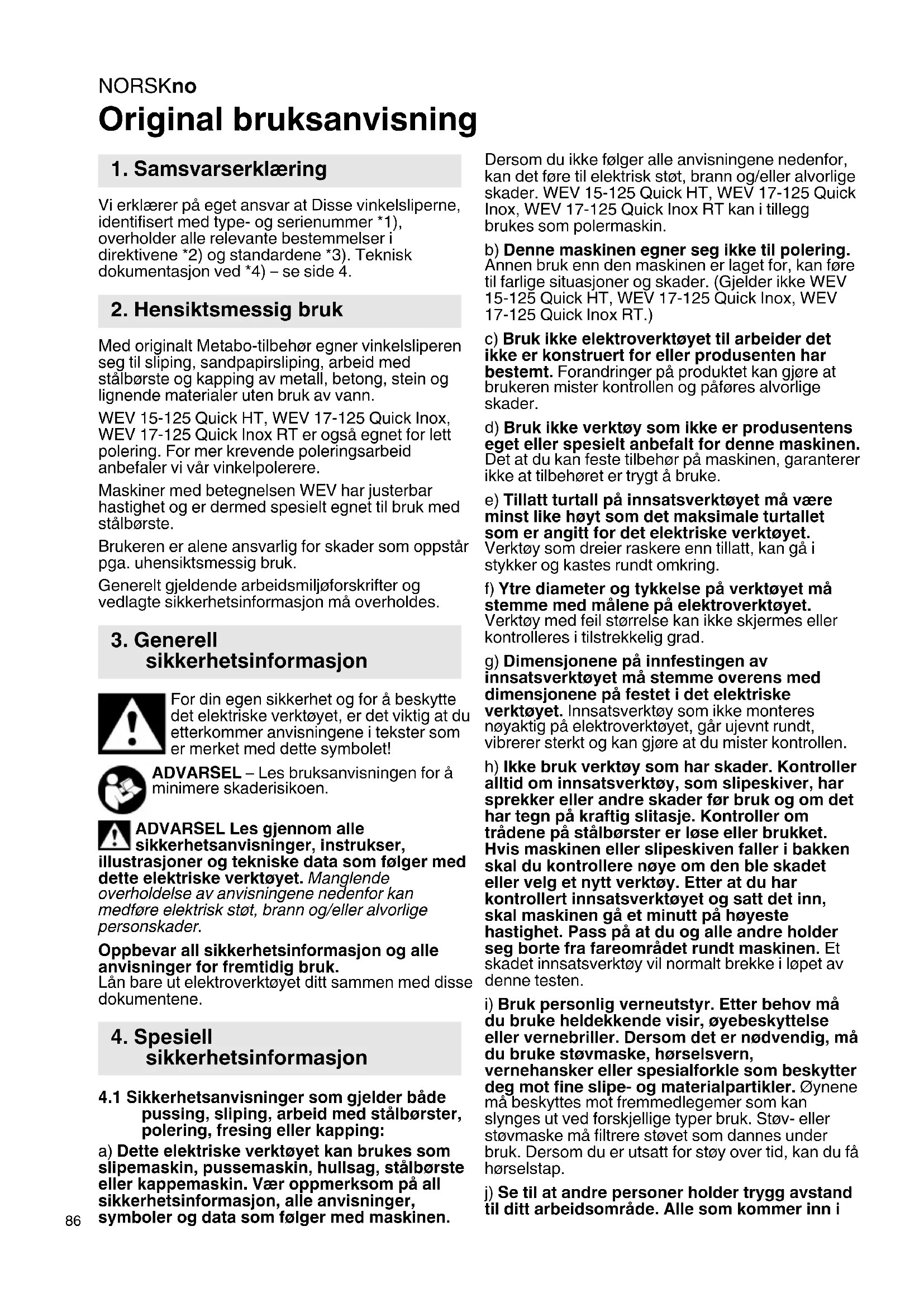 Original bruksanvisning Vi erklærer på eget ansvar at Disse vinkelsliperne, identifisert med type- og serienummer *1), overholder alle relevante bestemmelser i direktivene *2) og standardene *3). Teknisk dokumentasjon ved *4) – se side 4. Med originalt Metabo-tilbehør egner vinkelsliperen seg til sliping, sandpapirsliping, arbeid med stålbørste og kapping av metall, betong, stein og lignende materialer uten bruk av vann. WEV 15-125 Quick HT, WEV 17-125 Quick Inox, WEV 17-125 Quick Inox RT er også egnet for lett polering. For mer krevende poleringsarbeid anbefaler vi vår vinkelpolerere. Maskiner med betegnelsen WEV har justerbar hastighet og er dermed spesielt egnet til bruk med stålbørste. Brukeren er alene ansvarlig for skader som oppstår pga. uhensiktsmessig bruk. Generelt gjeldende arbeidsmiljøforskrifter og vedlagte sikkerhetsinformasjon må overholdes. For din egen sikkerhet og for å beskytte det elektriske verktøyet, er det viktig at du etterkommer anvisningene i tekster som er merket med dette symbolet! ADVARSEL – Les bruksanvisningen for å minimere skaderisikoen. ADVARSEL Les gjennom alle sikkerhetsanvisninger, instrukser, illustrasjoner og tekniske data som følger med dette elektriske verktøyet. Manglende overholdelse av anvisningene nedenfor kan medføre elektrisk støt, brann og/eller alvorlige personskader. Oppbevar all sikkerhetsinformasjon og alle anvisninger for fremtidig bruk. Lån bare ut elektroverktøyet ditt sammen med disse dokumentene.