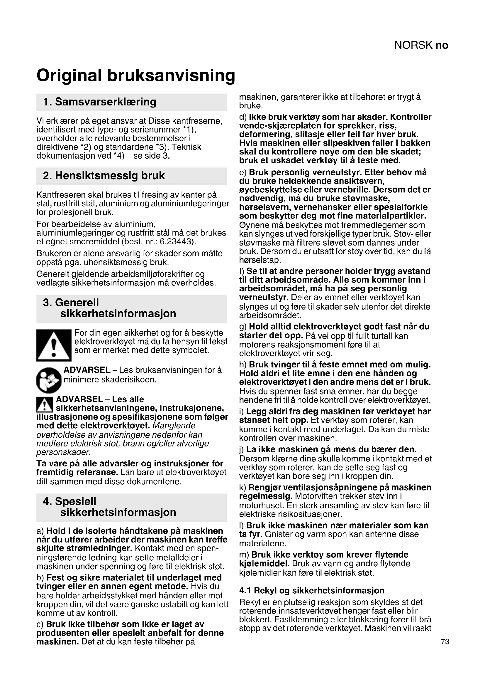 Original bruksanvisning Vi erklærer på eget ansvar at Disse kantfreserne, identifisert med type- og serienummer *1), overholder alle relevante bestemmelser i direktivene *2) og standardene *3). Teknisk dokumentasjon ved *4) – se side 3. Kantfreseren skal brukes til fresing av kanter på stål, rustfritt stål, aluminium og aluminiumlegeringer for profesjonell bruk. For bearbeidelse av aluminium, aluminiumlegeringer og rustfritt stål må det brukes et egnet smøremiddel (best. nr.: 6.23443). Brukeren er alene ansvarlig for skader som måtte oppstå pga. uhensiktsmessig bruk. Generelt gjeldende arbeidsmiljøforskrifter og vedlagte sikkerhetsinformasjon må overholdes. For din egen sikkerhet og for å beskytte elektroverktøyet må du ta hensyn til tekst som er merket med dette symbolet. ADVARSEL – Les bruksanvisningen for å minimere skaderisikoen. ADVARSEL – Les alle sikkerhetsanvisningene, instruksjonene, illustrasjonene og spesifikasjonene som følger med dette elektroverktøyet. Manglende overholdelse av anvisningene nedenfor kan medføre elektrisk støt, brann og/eller alvorlige personskader. Ta vare på alle advarsler og instruksjoner for fremtidig referanse. Lån bare ut elektroverktøyet ditt sammen med disse dokumentene. a) Hold i de isolerte håndtakene på maskinen når du utfører arbeider der maskinen kan treffe skjulte strømledninger. Kontakt med en spen- ningsførende ledning kan sette metalldeler i maskinen under spenning og føre til elektrisk støt. b) Fest og sikre materialet til underlaget med tvinger eller en annen egent metode. Hvis du bare holder arbeidsstykket med hånden eller mot kroppen din, vil det være ganske ustabilt og kan lett komme ut av kontroll. c) Bruk ikke tilbehør som ikke er laget av produsenten eller spesielt anbefalt for denne maskinen. Det at du kan feste tilbehør på maskinen, garanterer ikke at tilbehøret er trygt å bruke. d) Ikke bruk verktøy som har skader. Kontroller vende-skjæreplaten for sprekker, riss, deformering, slitasje eller feil før hver bruk. Hvis maskinen eller slipeskiven faller i bakken skal du kontrollere nøye om den ble skadet; bruk et uskadet verktøy til å teste med. e) Bruk personlig verneutstyr. Etter behov må du bruke heldekkende ansiktsvern, øyebeskyttelse eller vernebrille. Dersom det er nødvendig, må du bruke støvmaske, hørselsvern, vernehansker eller spesialforkle som beskytter deg mot fine materialpartikler. Øynene må beskyttes mot fremmedlegemer som kan slynges ut ved forskjellige typer bruk. Støv- eller støvmaske må filtrere støvet som dannes under bruk. Dersom du er utsatt for støy over tid, kan du få hørselstap. f) Se til at andre personer holder trygg avstand til ditt arbeidsområde. Alle som kommer inn i arbeidsområdet, må ha på seg personlig verneutstyr. Deler av emnet eller verktøyet kan slynges ut og føre til skader selv utenfor det direkte arbeidsområdet. g) Hold alltid elektroverktøyet godt fast når du starter det opp. På vei opp til fullt turtall kan motorens reaksjonsmoment føre til at elektroverktøyet vrir seg. h) Bruk tvinger til å feste emnet med om mulig. Hold aldri et lite emne i den ene hånden og elektroverktøyet i den andre mens det er i bruk. Hvis du spenner fast små emner, har du begge hendene fri til å holde kontroll over elektroverktøyet.
