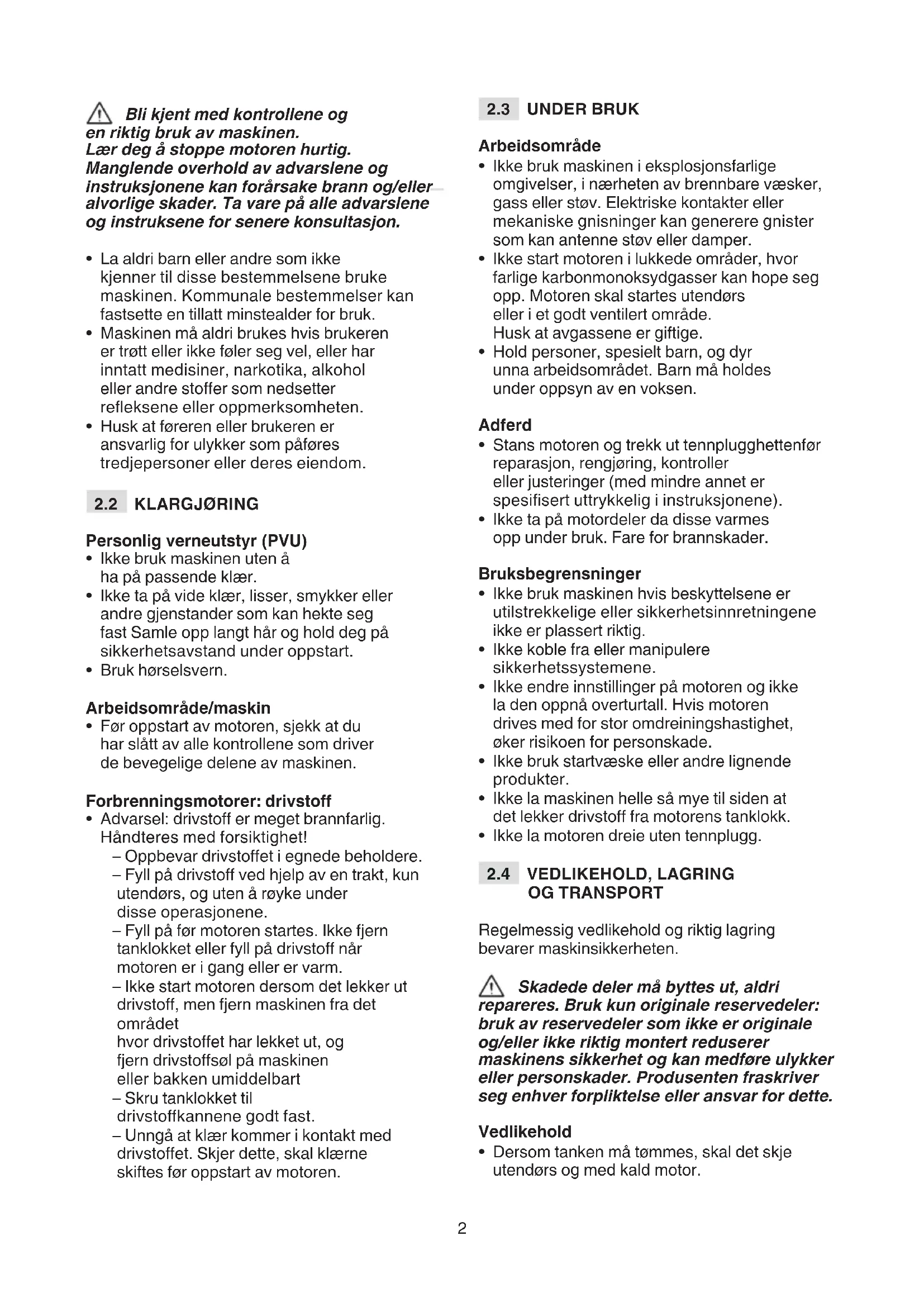 - Advarsel: drivsto er meget brannfarlig. Håndteres med forsiktighet! – Oppbevar drivstoet i egnede beholdere. – Fyll på drivsto ved hjelp av en trakt, kun utendørs, og uten å røyke under disse operasjonene. – Fyll på før motoren startes. Ikke fjern tanklokket eller fyll på drivsto når motoren er i gang eller er varm. – Ikke start motoren dersom det lekker ut drivsto, men fjern maskinen fra det området hvor drivstoet har lekket ut, og fjern drivstosøl på maskinen eller bakken umiddelbart – Skru tanklokket til drivstokannene godt fast. – Unngå at klær kommer i kontakt med drivstoet. Skjer dette, skal klærne skiftes før oppstart av motoren.