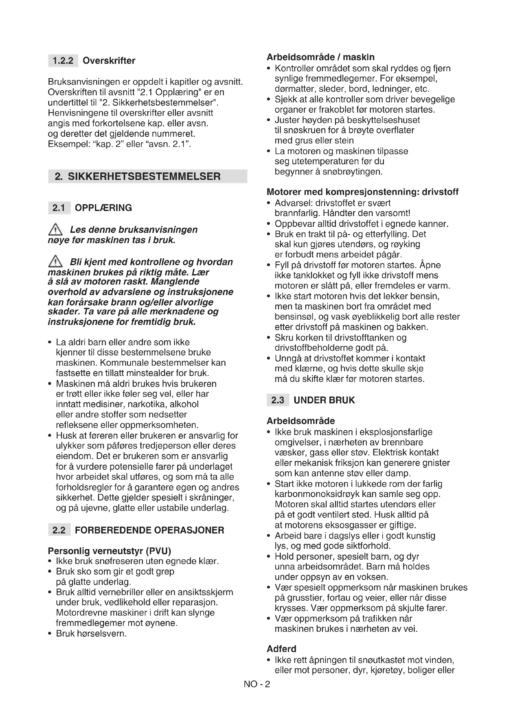 - Ikke rett åpningen til snøutkastet mot vinden, eller mot personer, dyr, kjøretøy, boliger ellerNO - 3 annet som kan bli påført skader fra snøen eller fra gjenstander som ligger gjemt i snøen. Ikke la noen stoppe opp fremfor maskinen.