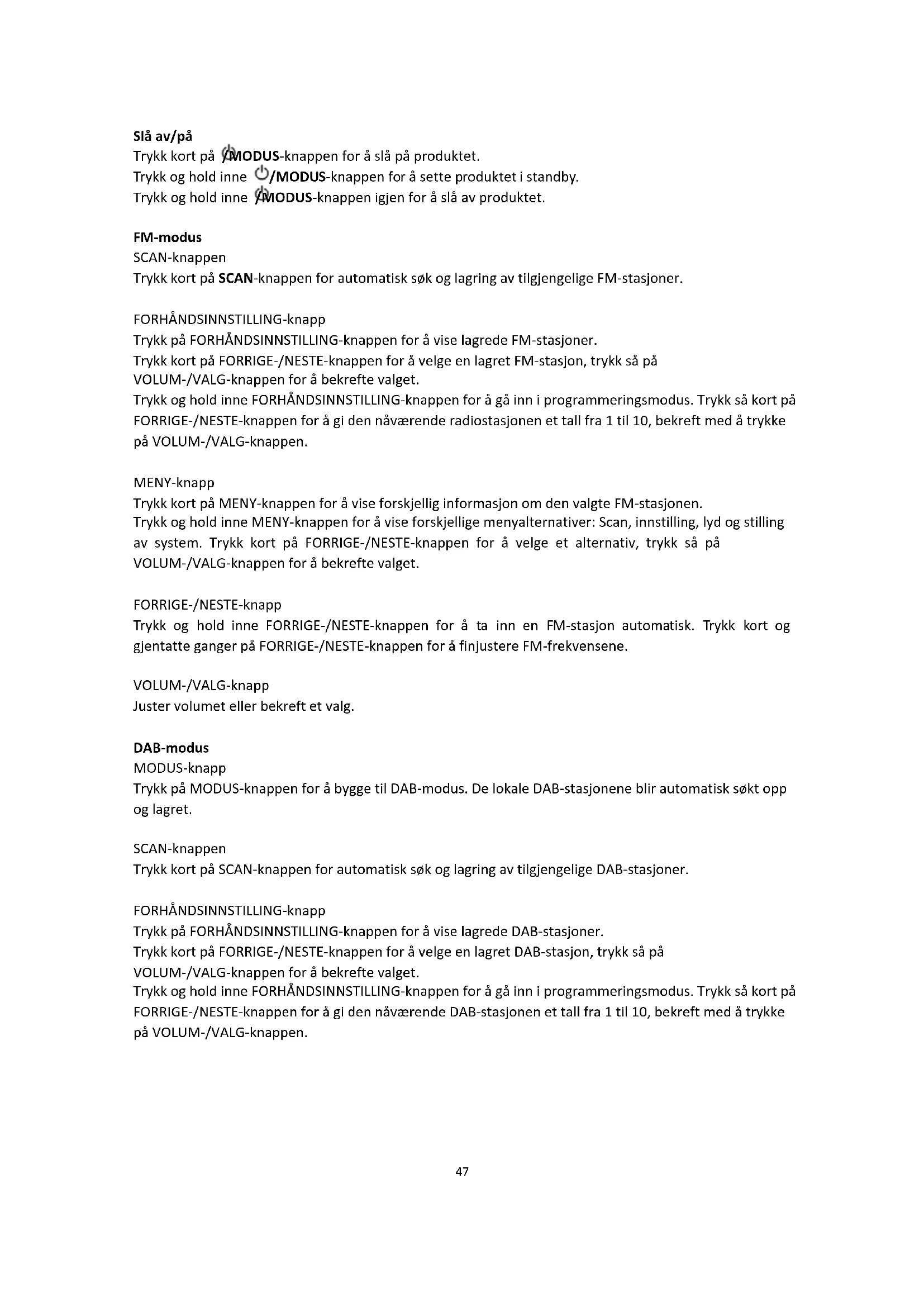 Slå av/på Trykk kort på /MODUS-knappen for å slå på produktet. Trykk og hold inne /MODUS-knappen for å sette produktet i standby. Trykk og hold inne /MODUS-knappen igjen for å slå av produktet. FM-modus SCAN-knappen Trykk kort på SCAN-knappen for automatisk søk og lagring av tilgjengelige FM-stasjoner. FORHÅNDSINNSTILLING-knapp Trykk på FORHÅNDSINNSTILLING-knappen for å vise lagrede FM-stasjoner. Trykk kort på FORRIGE-/NESTE-knappen for å velge en lagret FM-stasjon, trykk så på VOLUM-/VALG-knappen for å bekrefte valget. Trykk og hold inne FORHÅNDSINNSTILLING-knappen for å gå inn i programmeringsmodus. Trykk så kort på FORRIGE-/NESTE-knappen for å gi den nåværende radiostasjonen et tall fra 1 til 10, bekreft med å trykke på VOLUM-/VALG-knappen. MENY-knapp Trykk kort på MENY-knappen for å vise forskjellig informasjon om den valgte FM-stasjonen. Trykk og hold inne MENY-knappen for å vise forskjellige menyalternativer: Scan, innstilling, lyd og stilling av system. Trykk kort på FORRIGE-/NESTE-knappen for å velge et alternativ, trykk så på VOLUM-/VALG-knappen for å bekrefte valget. FORRIGE-/NESTE-knapp Trykk og hold inne FORRIGE-/NESTE-knappen for å ta inn en FM-stasjon automatisk. Trykk kort og gjentatte ganger på FORRIGE-/NESTE-knappen for å finjustere FM-frekvensene. VOLUM-/VALG-knapp Juster volumet eller bekreft et valg. DAB-modus MODUS-knapp Trykk på MODUS-knappen for å bygge til DAB-modus. De lokale DAB-stasjonene blir automatisk søkt opp og lagret. SCAN-knappen Trykk kort på SCAN-knappen for automatisk søk og lagring av tilgjengelige DAB-stasjoner. FORHÅNDSINNSTILLING-knapp Trykk på FORHÅNDSINNSTILLING-knappen for å vise lagrede DAB-stasjoner. Trykk kort på FORRIGE-/NESTE-knappen for å velge en lagret DAB-stasjon, trykk så på VOLUM-/VALG-knappen for å bekrefte valget. Trykk og hold inne FORHÅNDSINNSTILLING-knappen for å gå inn i programmeringsmodus. Trykk så kort på FORRIGE-/NESTE-knappen for å gi den nåværende DAB-stasjonen et tall fra 1 til 10, bekreft med å trykke på VOLUM-/VALG-knappen.48 MENY-knapp Trykk på MENY-knappen for å vise forskjellig informasjon om den valgte DAB-stasjonen. Trykk og hold inne MENY-knappen for å vise forskjellige menyalternativer: Full scan, manuell justering og DRC-prunesystem. Trykk kort på FORRIGE-/NESTE-knappen for å velge et alternativ, trykk så på VOLUM-/VALG-knappen for å bekrefte valget. NESTE-knapp Trykk kort på FORRIGE-/NESTE-knappen for å velge en lagret DAB-stasjon, trykk så på VOLUM-/VALG-knappen for å bekrefte valget. VOLUM-/VALG-knapp Juster volumet eller bekreft et valg. Alarmmodus ALARM-knapp Trykk kort på ALARM-knappen for å velge alarm 1, trykk igjen på ALARM-knappen for å velge alarm 2. Trykk kort på FORRIGE-/NESTE-knappen for å velge alarmalternativ, trykk så på VOLUM-/VALG-knappen for å bekrefte valget. SLUMRE-knapp Når alarmen ringer trykkes SLUMRE-knappen for å stoppe ringingen, da ringer alarmen med et 9-minutters intervall. AUX-modus Trykk på MODUS-knappen for å bytte til AUX-modus, og koble en ekstern lydenhet til LINJE INN-kontakten. MENY-knapp Trykk kort på MENY-knappen for å vise forskjellig informasjon om AUX-modus. Trykk og hold inne MENY-knappen for å vise et alternativ, trykk så på VOLUM-/VALG-knappen for å bekrefte valget. VOLUM-/VALG-knapp Juster volum. Knappene SCAN / FORHÅNDSINNSTILLING / FORRIGE / NESTE er ugyldige i AUX-modus. Bruke øretelefoner Du kan koble til øretelefoner med en 3,5 mm kontakt (ikke inkludert) til produktets øretelefonplugg. SPESIFIKASJONER Strømforsyning Utgang DC6V 1000mA Inngang: AC 100ʹ240V 50/60Hz Batteritype 4 x AA batterier (ikke inkludert) DAB 174 MHz til 240 MHz