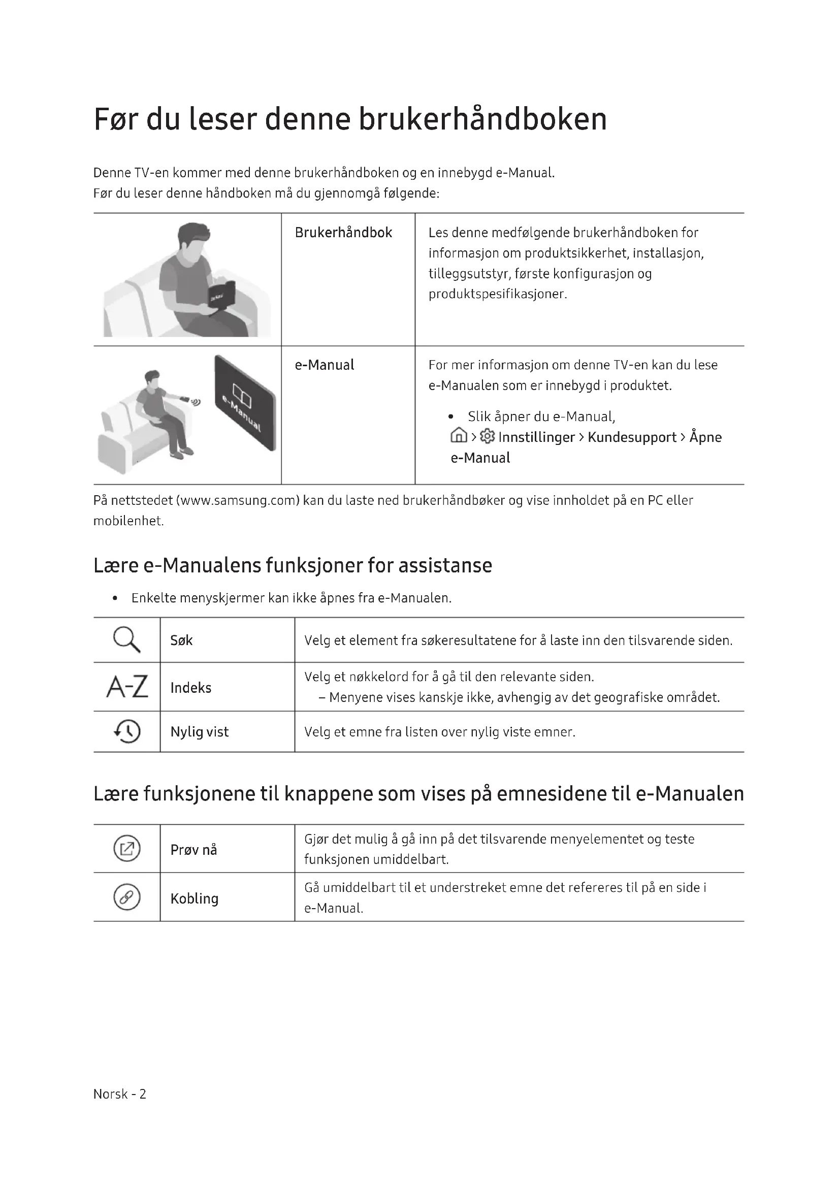 - Slik åpner du e-Manual, > Innstillinger > Kundesupport > Åpne e-Manual På nettstedet (www.samsung.com) kan du laste ned brukerhåndbøker og vise innholdet på en PC eller mobilenhet. Lære e-Manualens funksjoner for assistanse