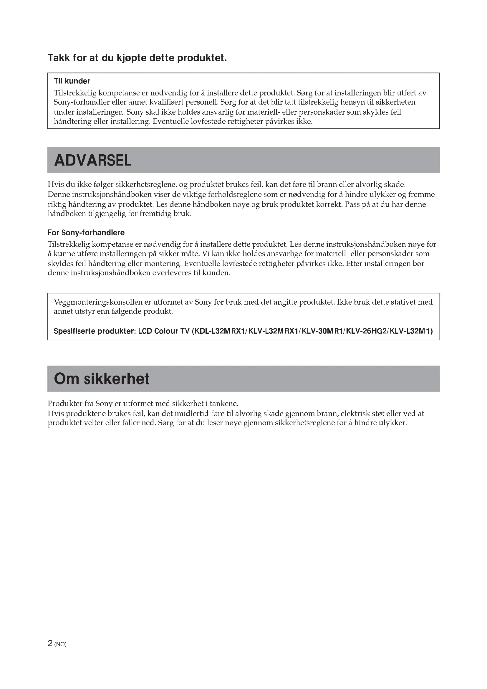 2452 (NO) Takk for at du kjøpte dette produktet. Til kunder Tilstrekkelig kompetanse er nødvendig for å installere dette produktet. Sørg for at installeringen blir utført av Sony-forhandler eller annet kvalifisert personell. Sørg for at det blir tatt tilstrekkelig hensyn til sikkerheten under installeringen. Sony skal ikke holdes ansvarlig for materiell- eller personskader som skyldes feil håndtering eller installering. Eventuelle lovfestede rettigheter påvirkes ikke. ADVARSEL Hvis du ikke følger sikkerhetsreglene, og produktet brukes feil, kan det føre til brann eller alvorlig skade. Denne instruksjonshåndboken viser de viktige forholdsreglene som er nødvendig for å hindre ulykker og fremme riktig håndtering av produktet. Les denne håndboken nøye og bruk produktet korrekt. Pass på at du har denne håndboken tilgjengelig for fremtidig bruk. For Sony-forhandlere Tilstrekkelig kompetanse er nødvendig for å installere dette produktet. Les denne instruksjonshåndboken nøye for å kunne utføre installeringen på sikker måte. Vi kan ikke holdes ansvarlige for materiell- eller personskader som skyldes feil håndtering eller montering. Eventuelle lovfestede rettigheter påvirkes ikke. Etter installeringen bør denne instruksjonshåndboken overleveres til kunden. Veggmonteringskonsollen er utformet av Sony for bruk med det angitte produktet. Ikke bruk dette stativet med annet utstyr enn følgende produkt. Spesifiserte produkter: LCD Colour TV (KDL-L32MRX1/KLV-L32MRX1/KLV-30MR1/KLV-26HG2/KLV-L32M1) Om sikkerhet Produkter fra Sony er utformet med sikkerhet i tankene. Hvis produktene brukes feil, kan det imidlertid føre til alvorlig skade gjennom brann, elektrisk støt eller ved at produktet velter eller faller ned. Sørg for at du leser nøye gjennom sikkerhetsreglene for å hindre ulykker.3 (NO) Norsk