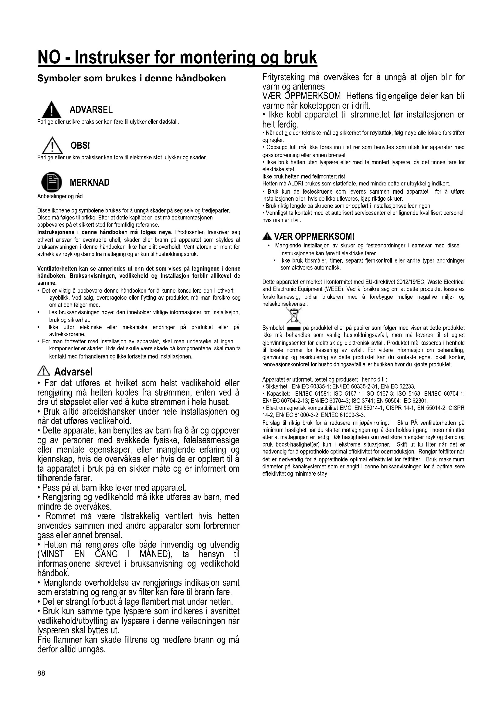 MERKNAD Anbefalinger og råd Disse ikonene og symbolene brukes for å unngå skader på seg selv og tredjeparter. Disse må følges til prikke. Etter at dette kapitlet er lest må dokumentasjonen oppbevares på et sikkert sted for fremtidig referanse. Instruksjonene i denne håndboken må følges nøye. Produsenten fraskriver seg ethvert ansvar for eventuelle uhell, skader eller brann på apparatet som skyldes at bruksanvisningen i denne håndboken ikke har blitt overholdt. Ventilatoren er ment for avtrekk av røyk og damp fra matlaging og er kun til husholdningsbruk. Ventilatorhetten kan se annerledes ut enn det som vises på tegningene i denne håndboken. Bruksanvisningen, vedlikehold og installasjon forblir allikevel de samme.