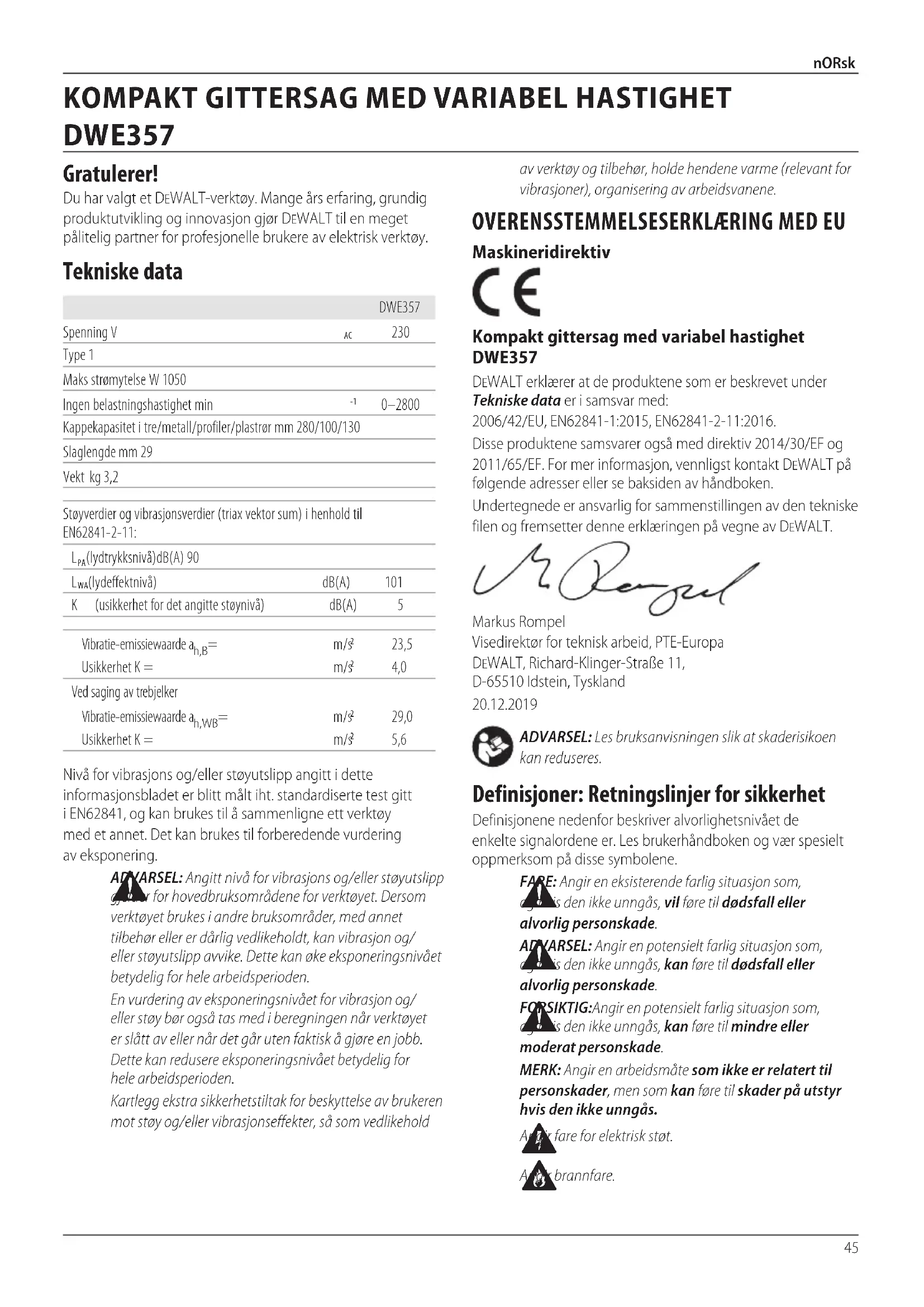 DWE357 Gratulerer! Du har valgt et DeWALT-verktøy. Mange års erfaring, grundig produktutvikling og innovasjon gjør DeWALT til en meget pålitelig partner for profesjonelle brukere av elektriskverktøy. Tekniske data46 nORsk Ett øyeblikks uoppmerksomhet under bruk av elektriske verktøy kan føre til alvorligpersonskade. b ) Bruk personlig verneutstyr. Bruk alltid vernebriller. Verneutstyr slik som støvmaske, sklisikre vernesko, hjelm, eller hørselsvern brukt under passende forhold vil reduserepersonskader. c ) Unngå utilsiktet oppstart. Sikre at bryteren er i av-stillingen før du kobler til strømkilden og/eller batteripakken, plukker opp eller bærer verktøyet. Å bære elektriske verktøy med fingeren på bryteren eller å sette inn støpselet mens elektriske verktøy har bryteren på øker faren forulykker. d ) Fjern eventuelle justeringsnøkler før du slår på det elektriske verktøyet. En nøkkel som er festet til en roterende del av det elektriske verktøyet kan føre tilpersonskade. e ) Ikke strekk deg for langt. Ha godt fotfeste og stå støtt hele tiden. Dette fører til at du har bedre kontroll over det elektriske verktøyet ved uventedesituasjoner. f ) Bruk egnet antrekk. Ikke ha på deg løstsittende klær eller smykker. Hold hår, antrekk og hansker borte fra bevegelige deler. Løstsittende antrekk, smykker eller langt hår kan bli fanget opp av bevegeligedeler. g ) Hvis apparatet er utstyrt for tilkobling av støvutsugings- og -oppsamlingsinnretning, må du sørge for at disse er koblet til og ordentlig sikret. Bruk av støvoppsamlere kan redusere støvrelatertefarer. h ) Ikke la kunnskap som du har fått fra hyppig bruk av verktøy la deg bli for selvsikker slik at du ignorerer verktøyets sikkerhetsprinsipper. En tankeløs handling kan føre til alvorlig personskade på brøkdelen av etsekund.